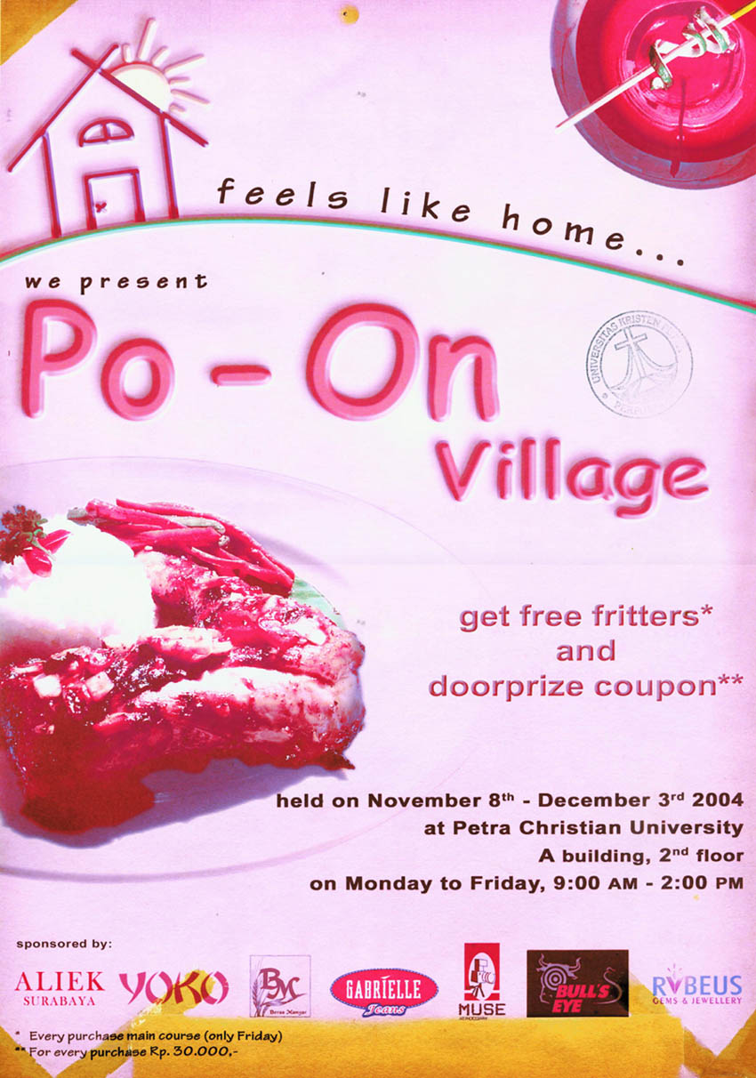 Poster yang dominan warna pink ini mengambil tema Po-On Village yang menggambarkan cafe yang menyajikan makanan khas Philipina namun disesuaikan dengan lidah orang Indonesia. Acara ini diadakan olen jurusan Manajemen Perhotelan pada tanggal 8 November sampai 3 Desember 2004 di Jurusan Manajemen Perhotelan Universitas Kristen Petra.