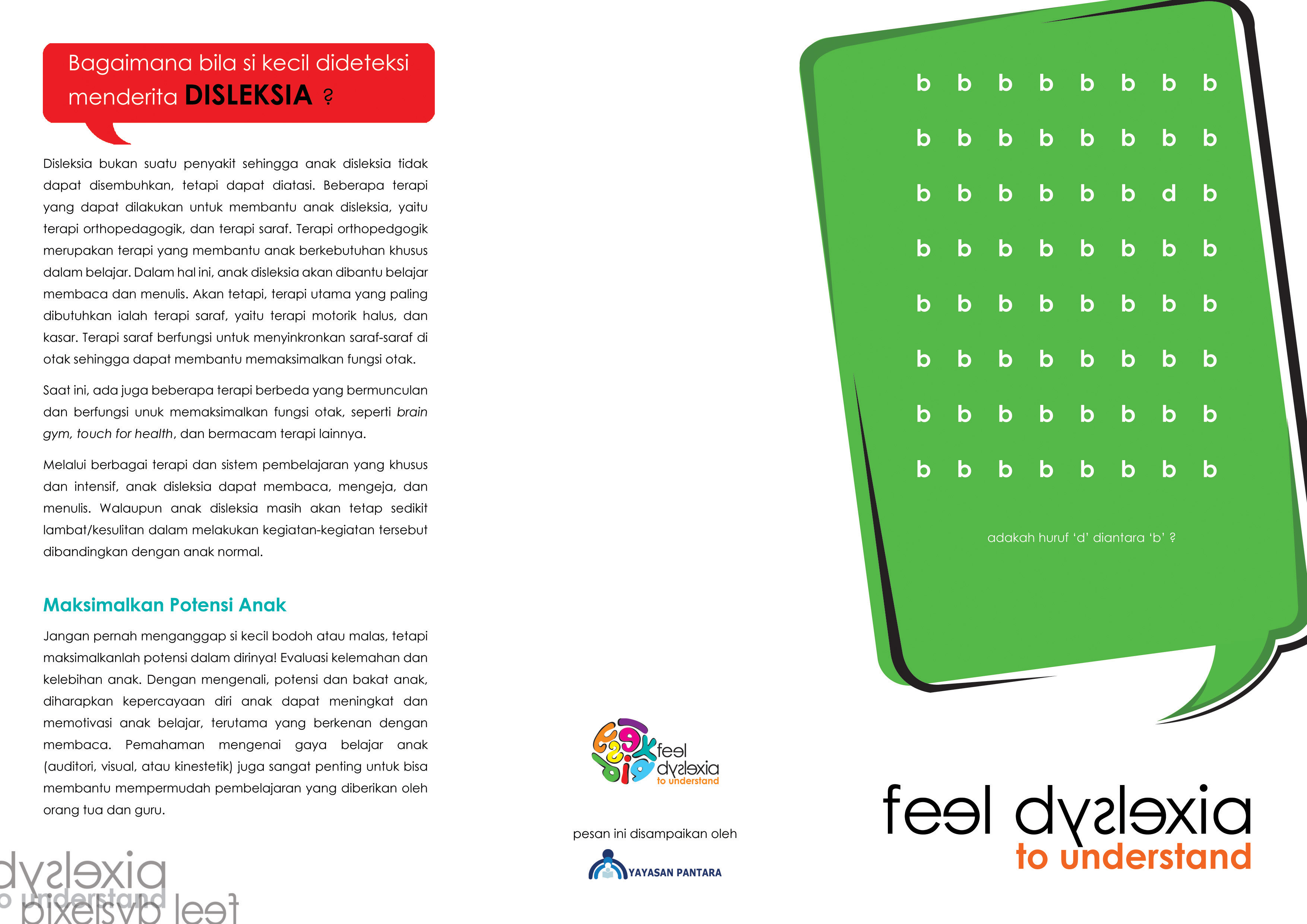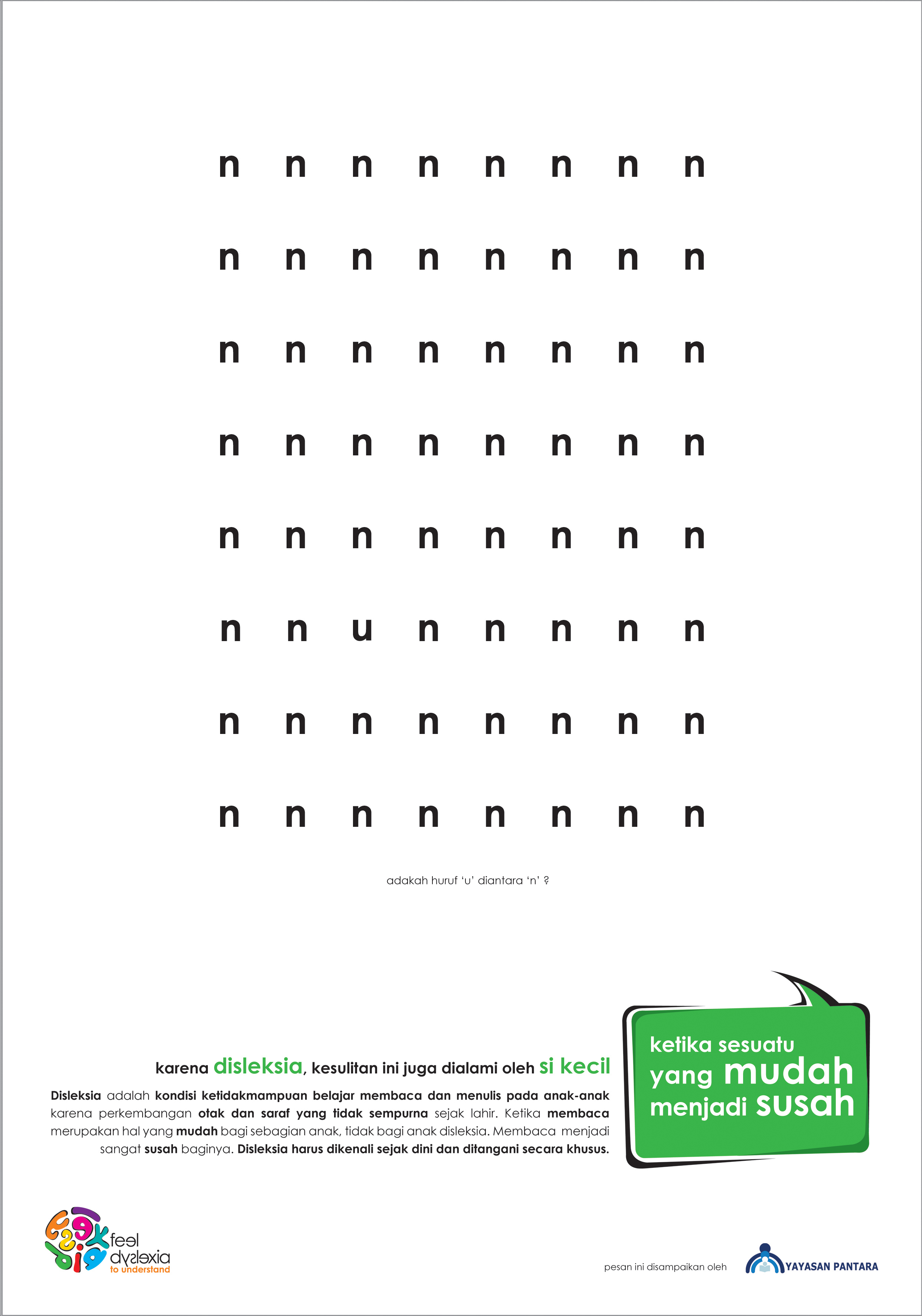 Disleksia adalah kondisi ketidakmampuan belajar khusus membaca dan menulis pada anak-anak sejak lahir karena adanya perkembangan otak dan saraf yang tidak sempurna. Kondisi ini cukup menyusahkan anak dalam belajar dan. Namun, ketidaktahuan masyarakat mengenai kondisi ini membuat anak disleksia tidak terdeteksi dan tertangani, serta dicap sebagai anak bodoh, malas, dan tidak bermasa depan. Oleh karena itu, perancangan Iklan Layanan Masyarakat ini dibuat dengan tujuan mengenalkan dan menyadarkan masyarakat akan adanya kondisi disleksia yang dapat terjadi pada anak-anak.