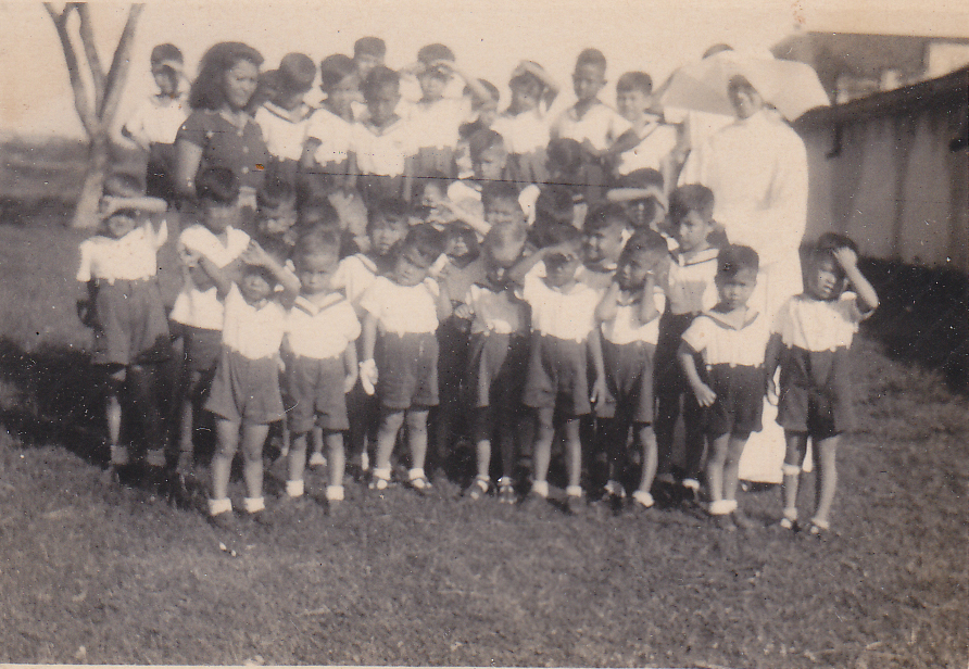 Sr.Rafael bersama seorang pengasuh dan anak-anak dari Kelompok Asuhnya terdiri dari anak TK dan SD kelas 1-2 di halaman panti, tahun 1950.