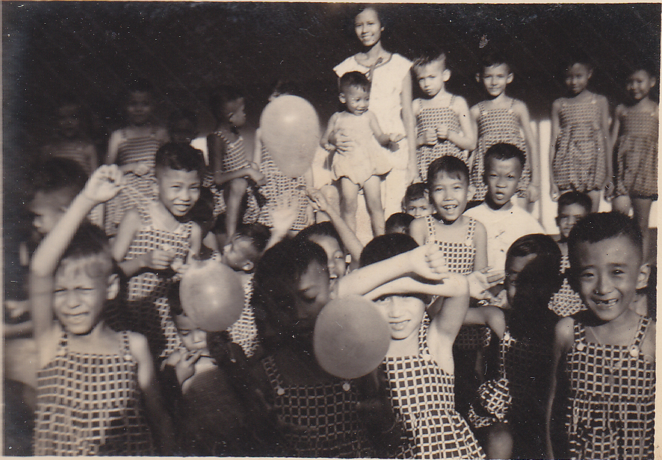 Anak-anak panti dari Kelompok Asuh bagian anak TK dan SD kelas 1-2 memakai baju hansop bersama seorang pengasuh pada tahum 1952
