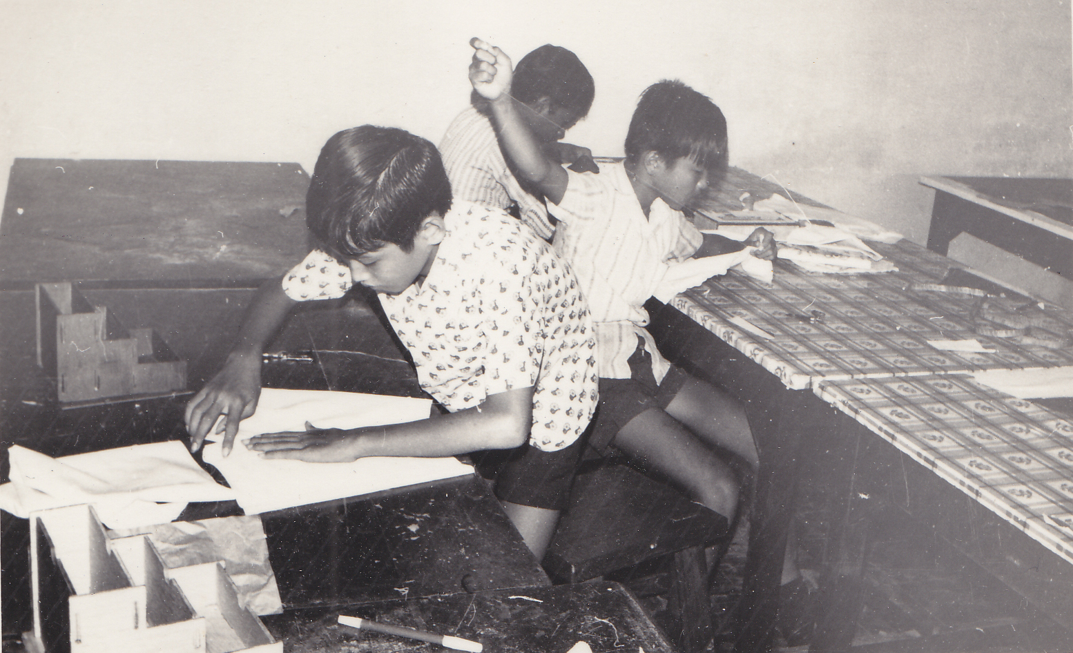 Anak-anak Panti Asuhan on Bosco mengerjakan tugas prakarya di sekolah, tahun 1977.