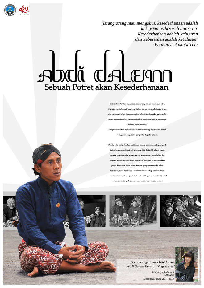 Abdi Dalem adalah seseorang yang bekerja atau mengabdi tulus kepada keraton. Mereka rela mengorbankan waktu dan tenaga untuk menjadi pelayan di dalam keraton meski gaji tak seberapa. Gaji bukanlah obsesi utama mereka, tetapi mereka bekerja karena semata mata pengabdian dan kesetian kepada keraton. Oleh karena itu, perancangan ini menunjukkan kehidupan Abdi Dalem Keraton sebagai contoh teladan bagi masyarakat, di saat kehidupan ini mulai sulit untuk menemukan adanya ketulusan dan kesederhanaan.
