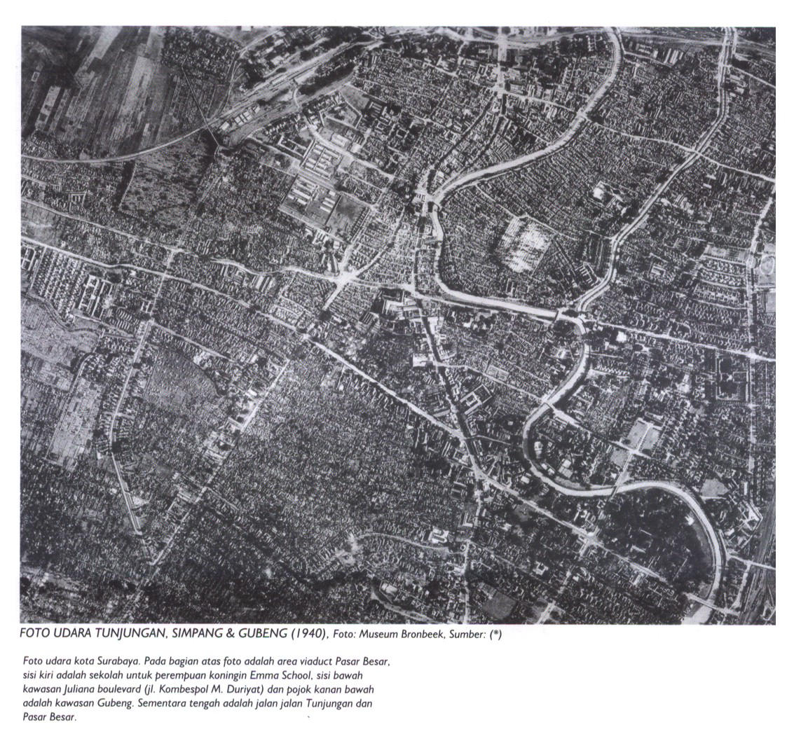 Foto Udara Tunjungan, Simpang, & Gubeng: Foto udara kota Surabaya. Pada bagian atas foto adalah area viaduct Pasar Besar, sisi kiri adalah sekolah untuk perempuan koningin Emma School, sisi bawah kawasan Juliana boulevard (Jl. Kombespol M. Duriyat) dan pojok kanan bawah adalah kawasan Gubeng. Sementara tengah adalah jalan jalan Tunjungan dan Pasar Besar.