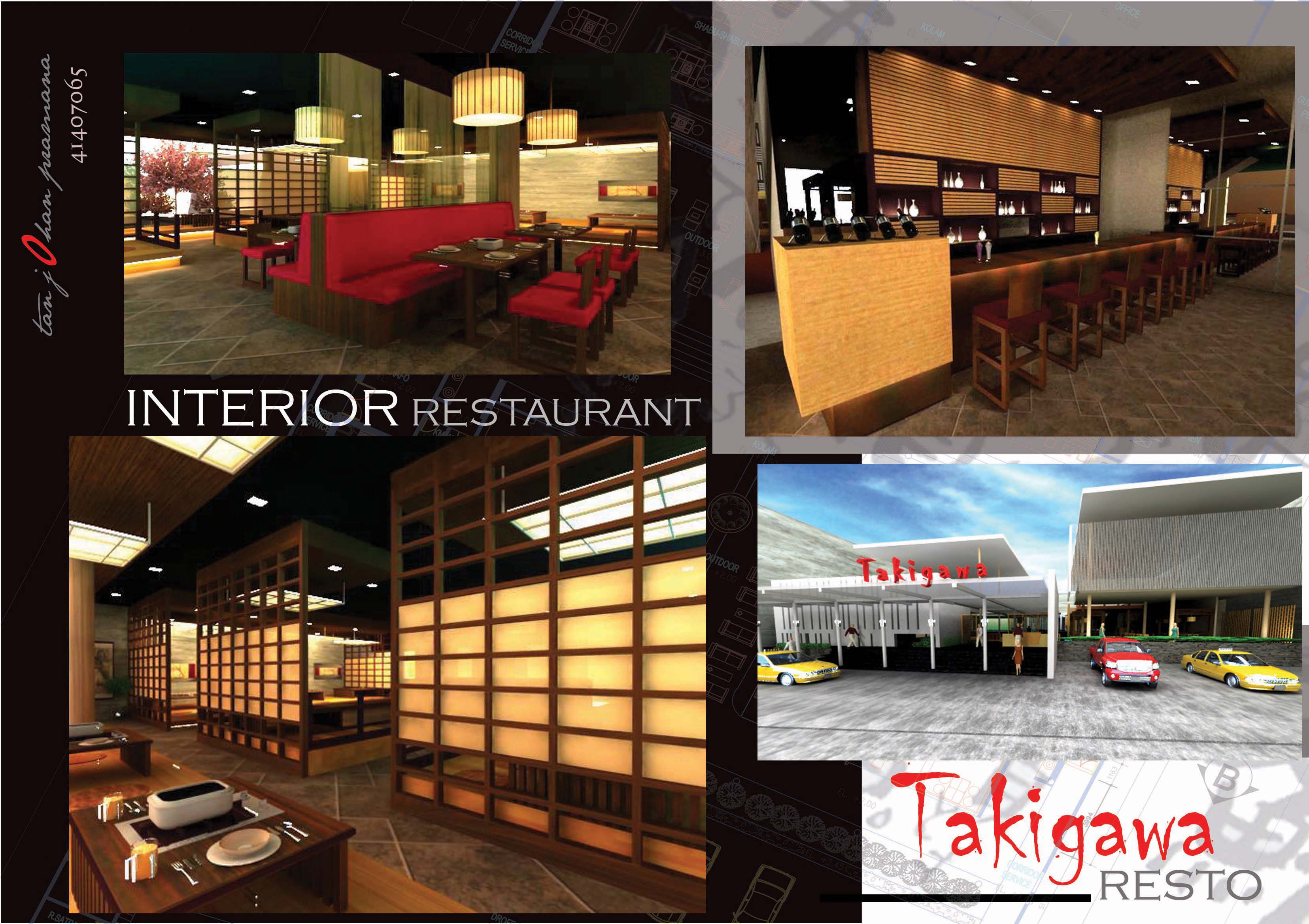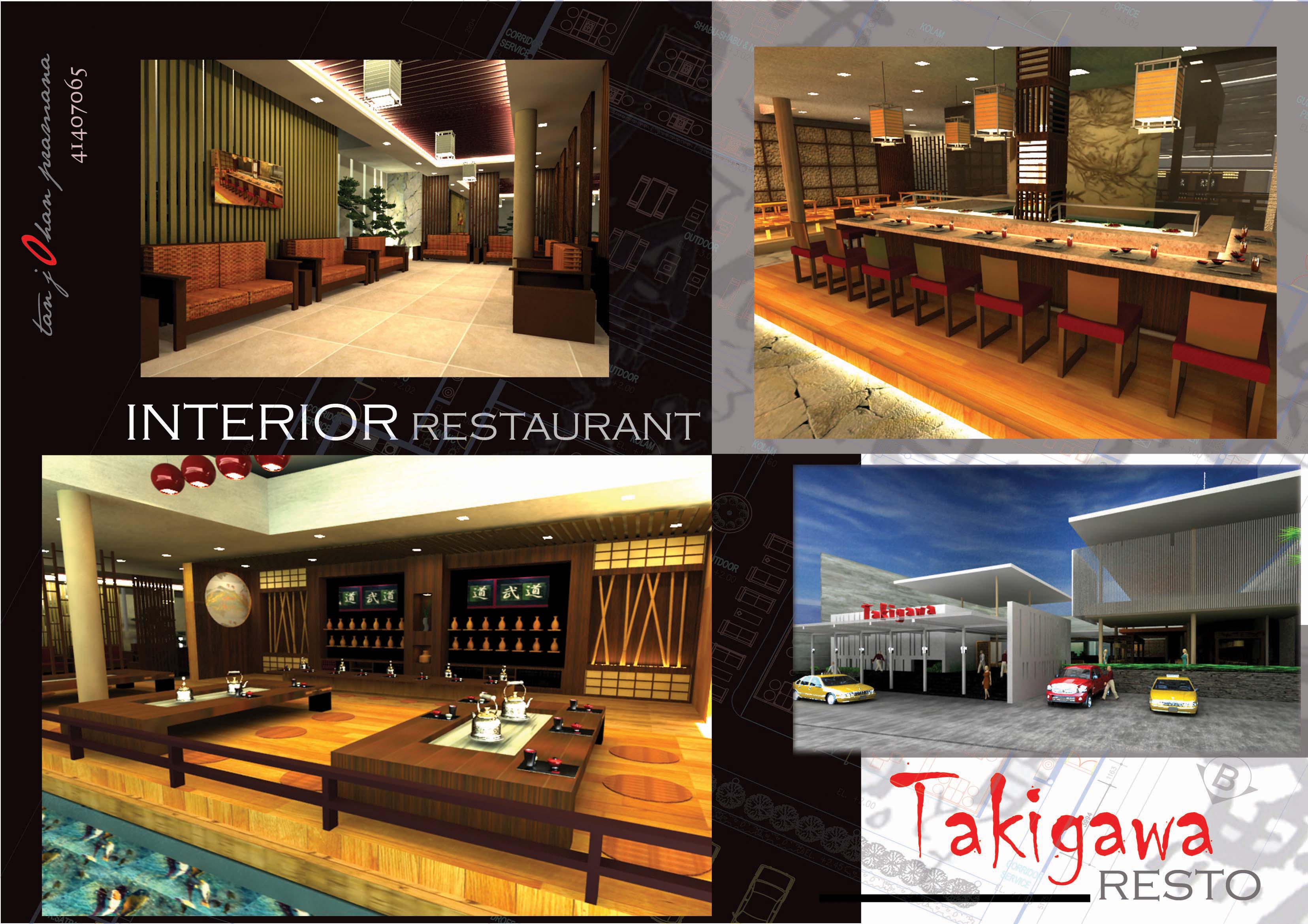 Takigawa merupakan salah satu resto Jepang yang ada di Indonesia. Takigawa sendiri berarti air terjun di mana air terjun ini merupakan salah satu unsur yang ada di alam yang menggambarkan kealamian. Resto sendiri merupakan tempat di mana orang-orang dapat menikmati suatu hidangan yang tersedia. Fasilitas yang terdapat di Takigawa Resto ini yaitu tea area, grill area, shabu-shabu and noodle area, sushi area, dessert and beverage area, outdoor area, garden, and waiting room. Konsep perancangannya adalah menciptakan suasana yang tenang dan alami. Di dalam Takigawa Resto, etika makan khas budaya Jepang ditampilkan pada setiap penyajiannya. Tema yang digunakan adalah Japanese Dine-in di mana jika ingin merasakan dan mempelajari bagaimana etika makan khas Jepang, maka harus mencobanya di resto ini.