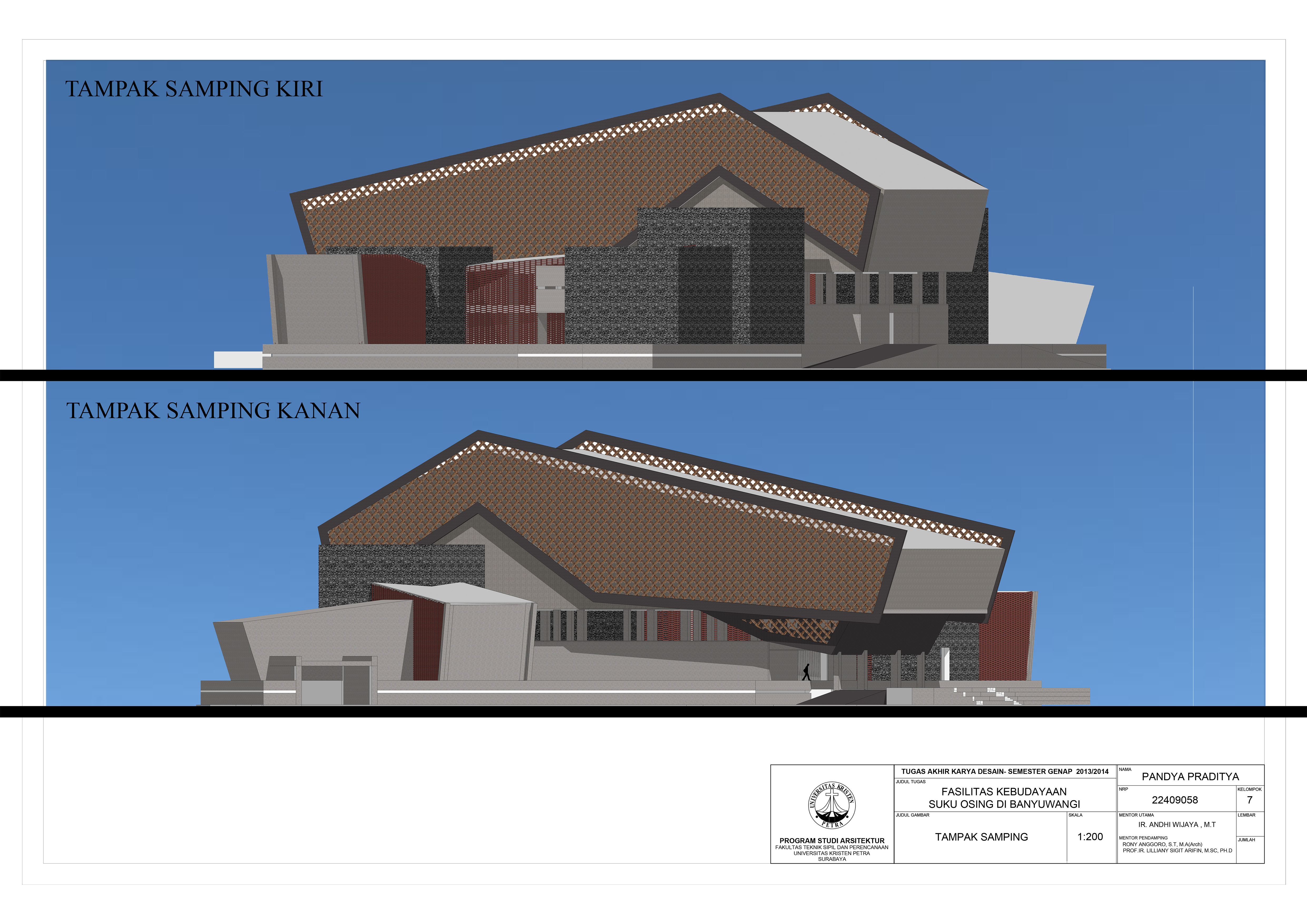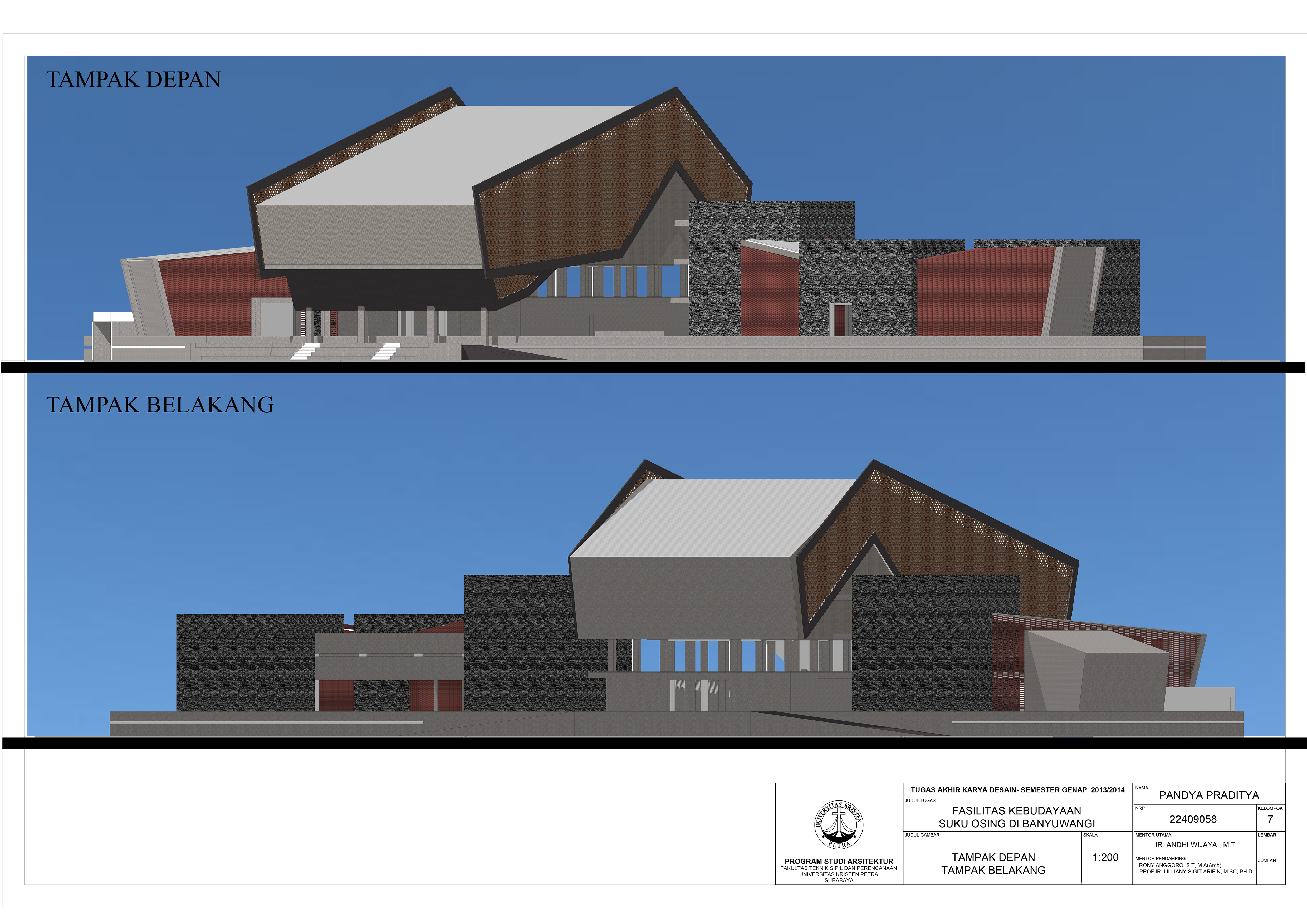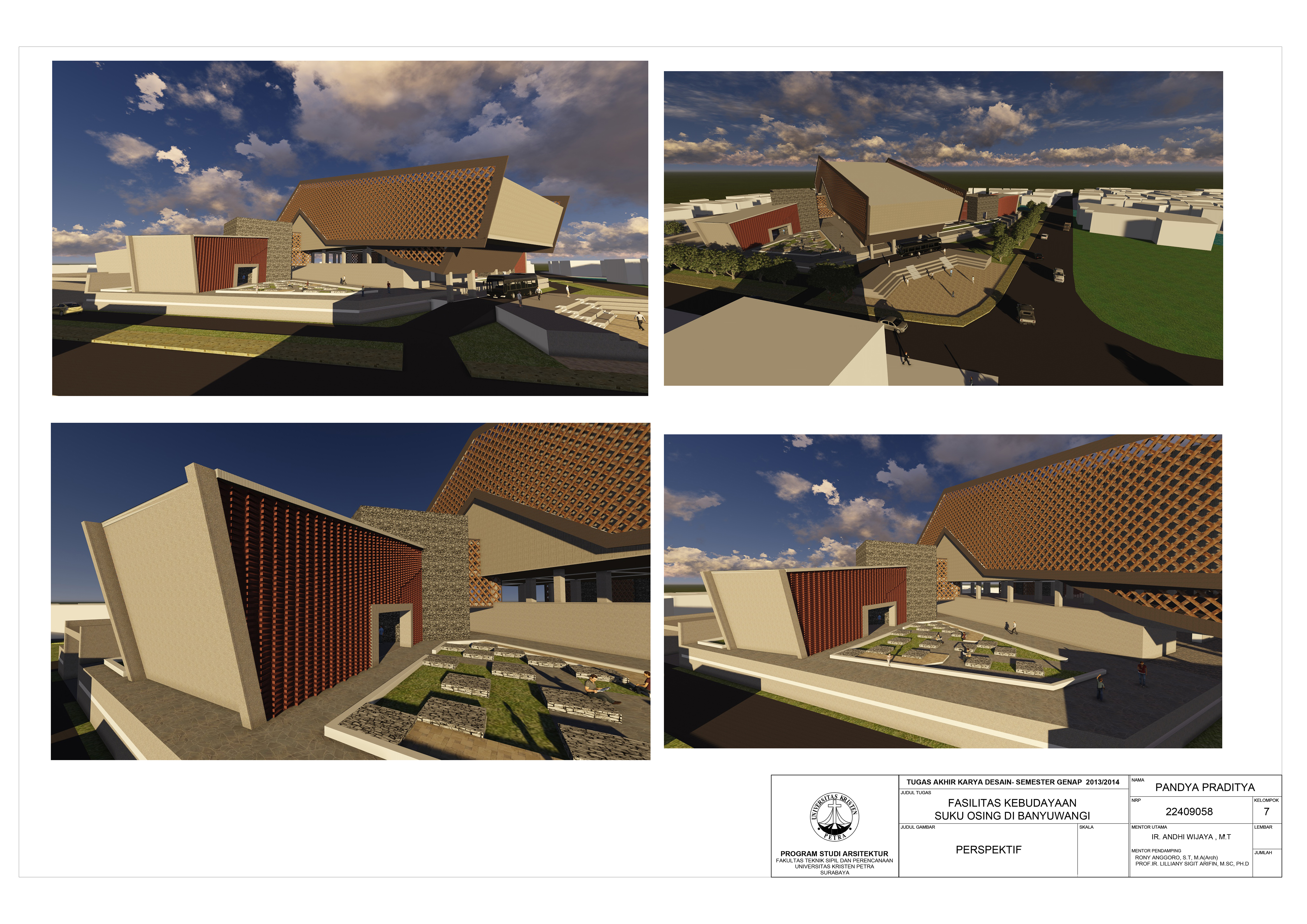 “Fasilitas Kebudayaan Suku Osing di Banyuwangi” ini dirancang di tengah kota Banyuwangi dengan tujuan mengenalkan, mengembangkan dan melestarikan kebudayaan Suku Osing. Pada fasilitas ini pengunjung dapat menikmati berbagai hiburan yang interaktif dan edukatif. Di dalamnya terdapat berbagai fasilitas yang berupa Galeri Temporer dan Kontemporer, tempat pelatihan Tenun Abaca, pelatihan Batik khas Osing, pelatihan Bahasa Osing, hingga Teater Terbuka dan Tertutup untuk menikmati acara khas Suku Osing. Pendekatan yang digunakan dalam perancangan adalah pendekatan simbolik metaphor tangible dengan pendalaman karakter ruang. Fasilitas ini merupakan sebuah karya arsitektur kontemporer yang menganut prinsip-prinsip arsitektur osing dengan metode perancangan masa kini.