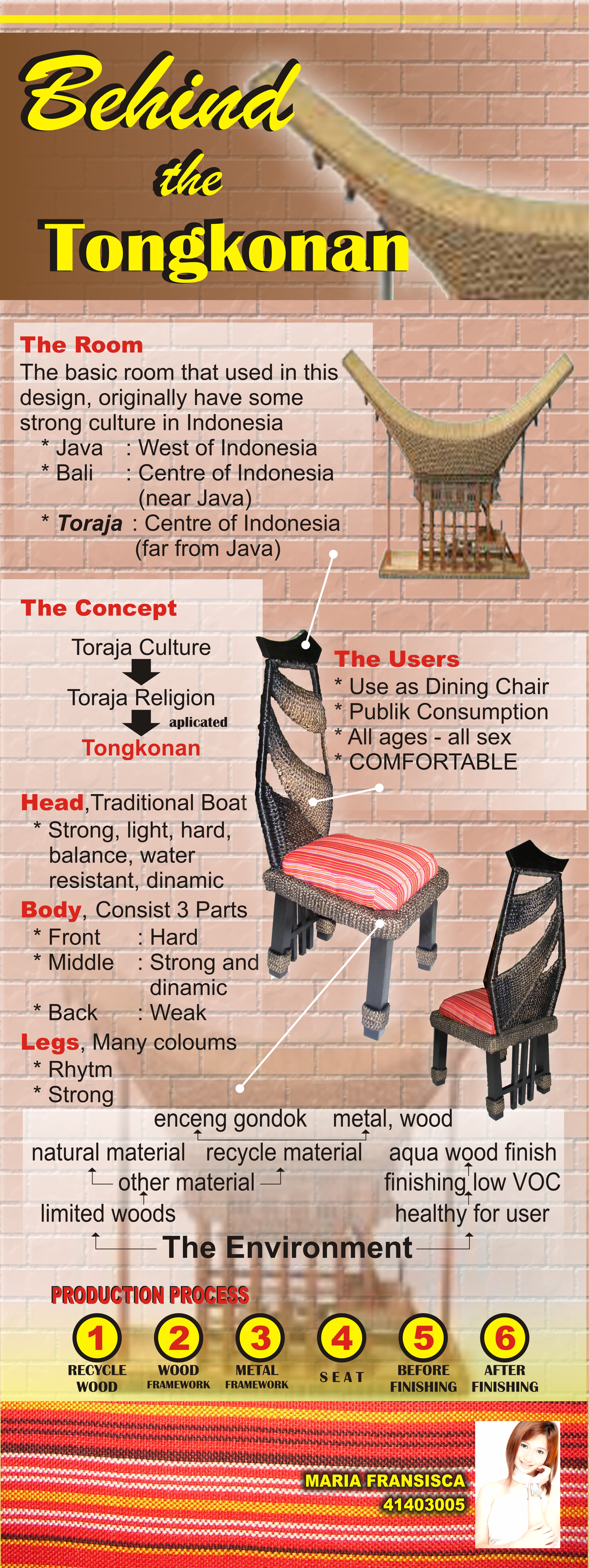 Dari karakter-karakter bagian-bagian tongkonan, terdapat beberapa karakter yang dapat dijadikan karakter dasar pembuatan kursi, yaitu: kuat,
