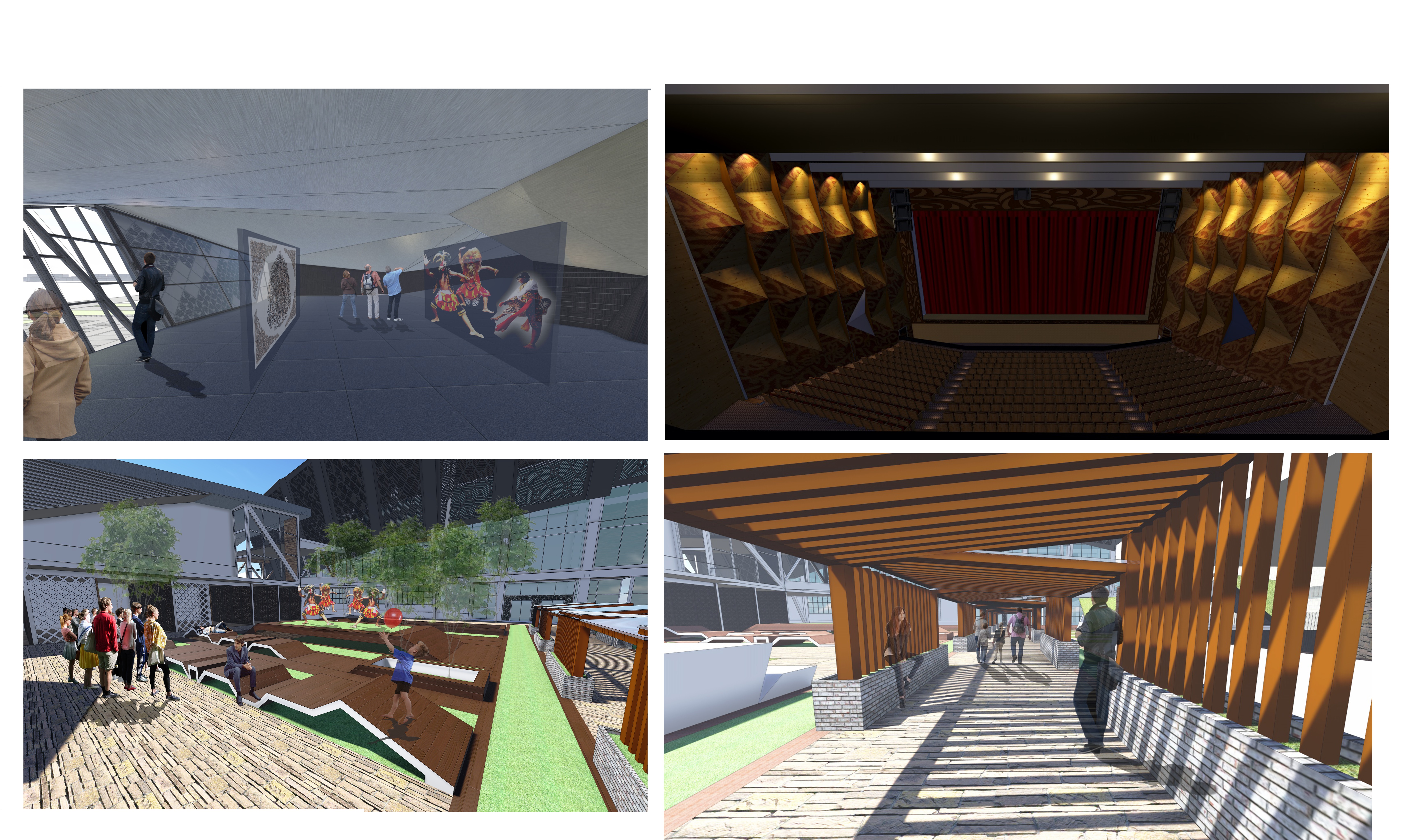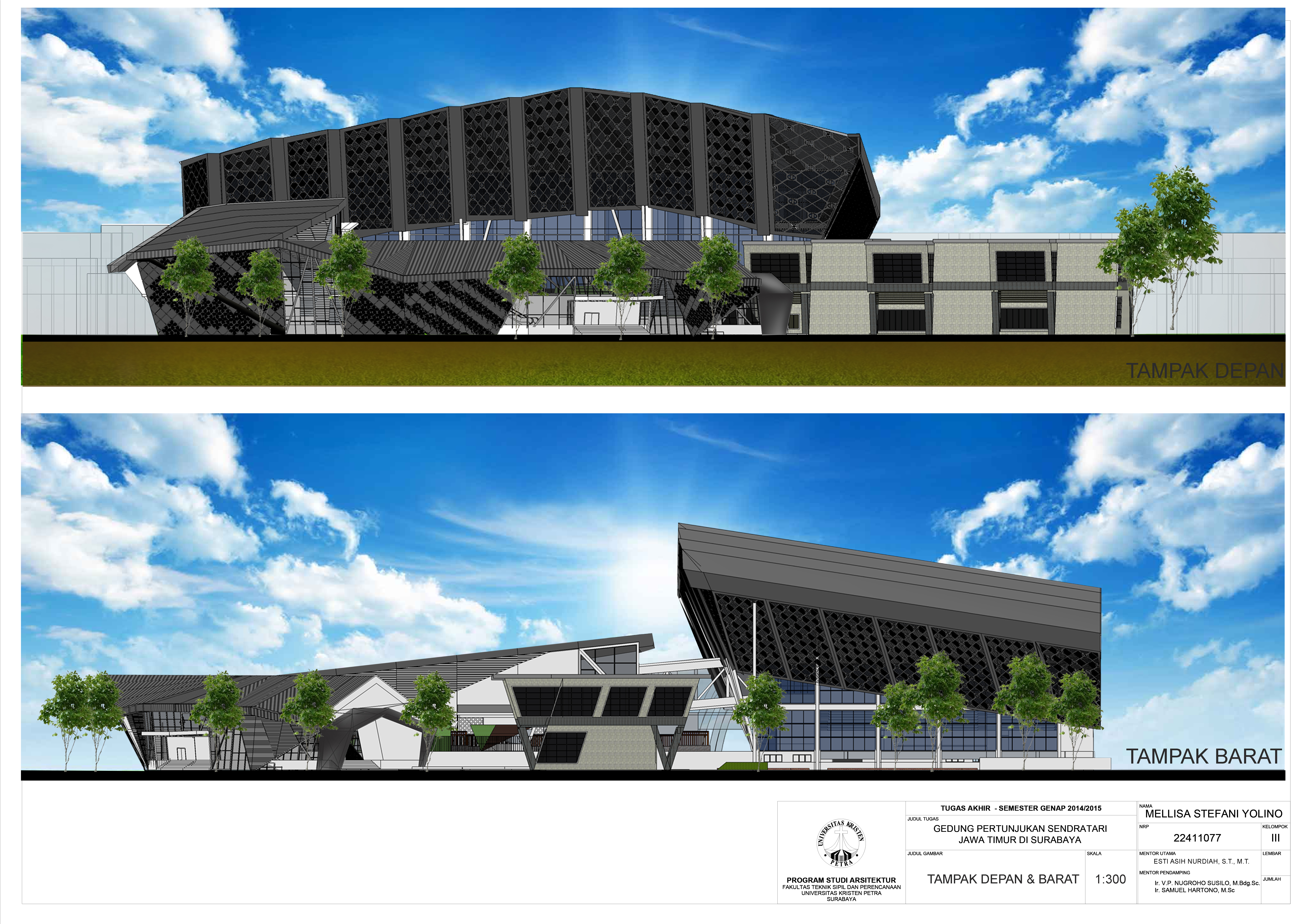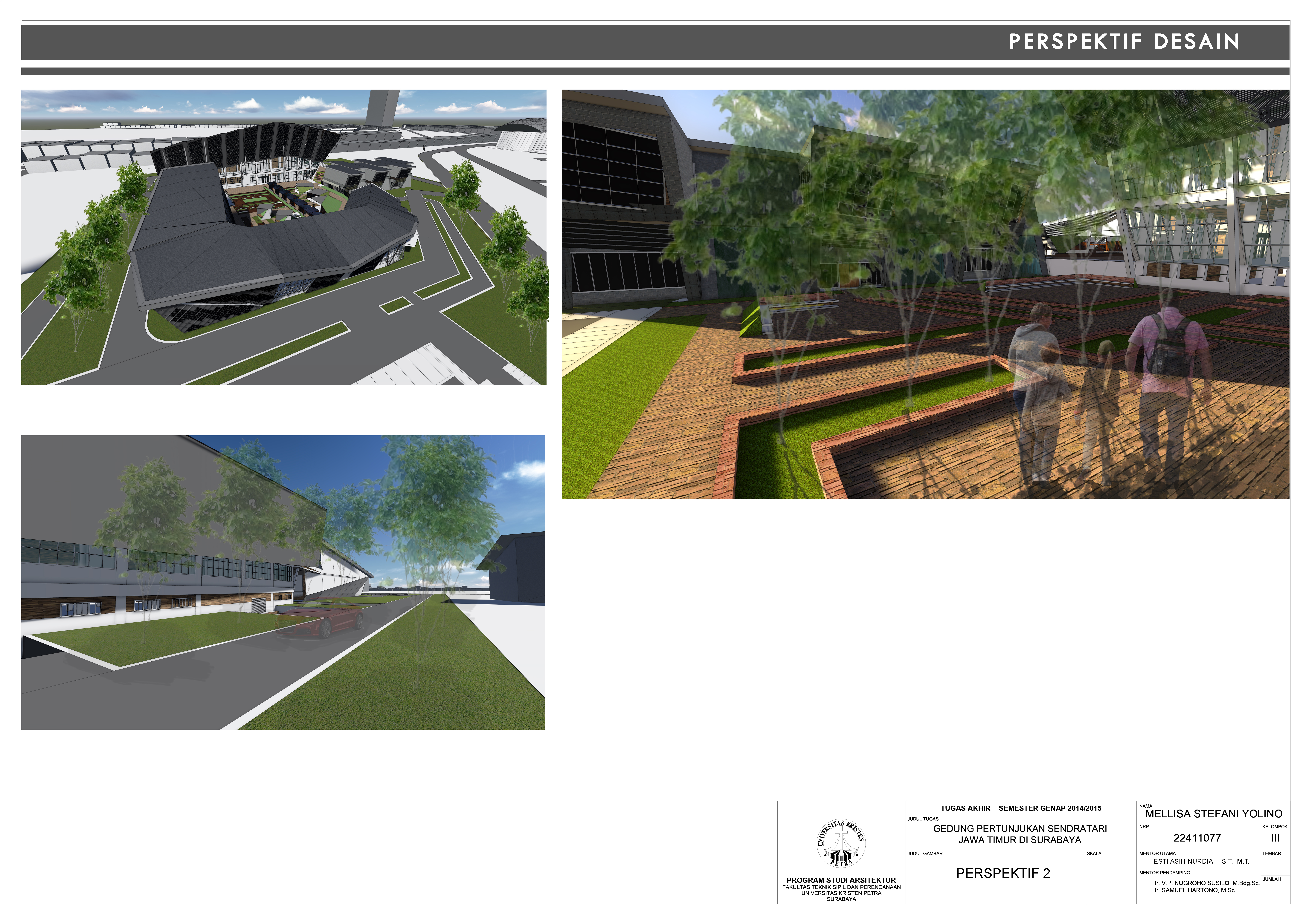 Jawa Timur kaya akan kultur dan kesenian tradisional seperti tari-tarian, drama, dan seni pertunjukan lainnya. Sayangnya, pada zaman modern ini banyak generasi muda yang mengabaikan kesenian lokal dan tradisional, dan kemudian memilih untuk mengikuti kebudayaan modern dari luar negeri. Hal ini disebabkan oleh kurangnya fasilitas kebudayaan yang modern, representatif, aktraktif dan mampu mempertunjukkan kesenian tradisional Jawa Timur dalam bentuk yang modern, sehingga kesenian tradisional dapat dinikmati dengan cara kontemporer. Oleh karena itu, proyek tugas akhir ini ditujukan untuk membuat desain fasilitas yang dapat mengakomodasi kebutuhan kesenian drama dan tari tradisional Jawa Timur. Fasilitas ini memiliki gedung pertunjukan yang dapat mengakomodasi hingga 1250 orang dan dilengkapi dengan proyektor, backdrop 3-dimensi, dan platform yang disesuaikan pada panggung, dan MEE yang canggih. Selain gedung pertunjukan, fasilitas ini juga memiliki information center, galeri sendratari tradisional Jawa Timur, pelatihan untuk tari, drama dan musik tradisional, juga terdapat fasilitas tambahan seperti toko souvenir dan food court.