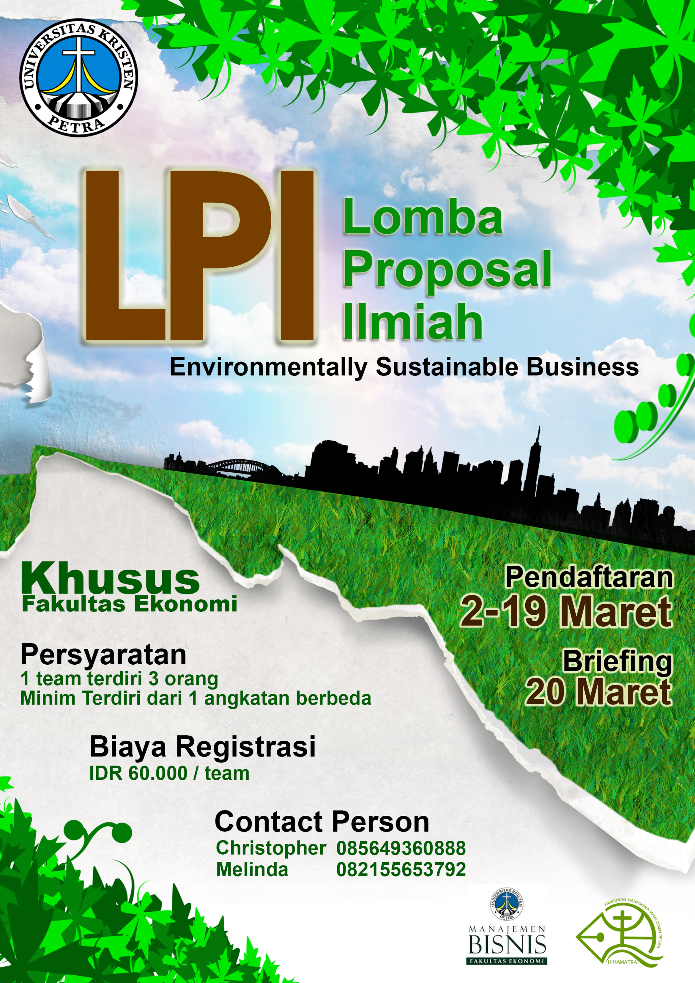 Prodi Manajemen Bisnis UK Petra, mengadakan kegiatan lomba proposal ilmiah dengan tema “Environmentally Sustainable Business”. LPI yang diadakan Prodi Manajemen Bisnis tersebut hanya dikhususkan bagi mahasiswa fakultas ekonomi. Persyaratan terkait kelompok adalah 1 tim terdiri dari 3 orang, minimal 1 orang berbeda angkatan. Biaya untuk pendaftaran kegiatan adalah sebesar Rp 60.000/tim.