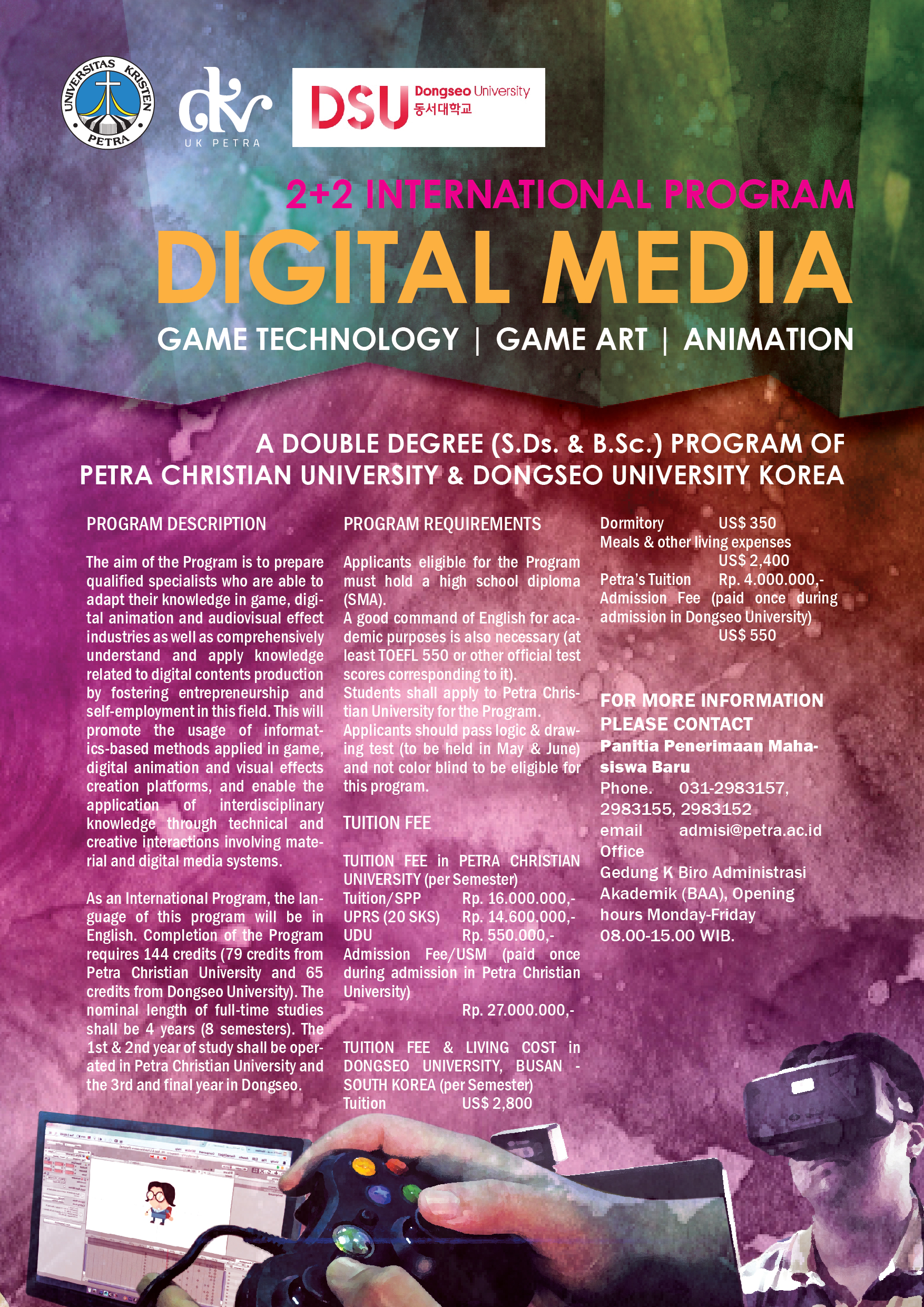 Jurusan Desain Komunikasi Visual Universitas Kristen Petra membuka program baru yang bekerjasama dengan Dongseo University Korea. Program baru ini berbasis bahasa Inggris dalam pelaksanaan perkuliahannya. Dengan menempuh 144 SKS, 79 SKS dilaksanakan di Universitas Kristen Petra dan 65 SKS dilaksanakan di Dongseo University Korea, maka mahasiswa lulusan ini akan mendapatkan gelor double degree, (S.Ds. dan B.Sc.)