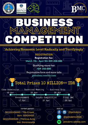 Program Studi Manajemen Bisnis UK Petra mengadakan acara business management competition dengan tema achieving economic level radically and terrifyingly. Acara ini diadakan pada 19-29 April 2016.