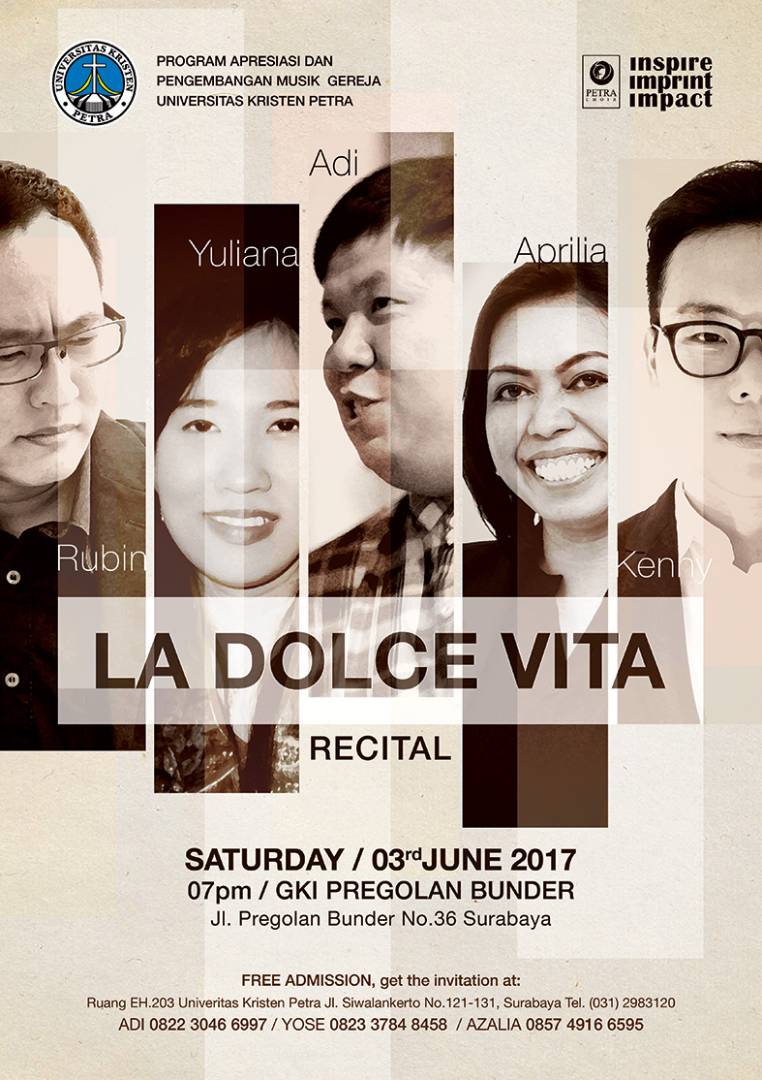 Program Apresiasi dan Pengembangan Musik Gerejawi UK Petra mengadakan konser paduan suara. Dengan mengangkat tema La Dolce Vita yang diadakan pada 03 Juni 2017 di GKI Pregolan Bunder Surabaya.