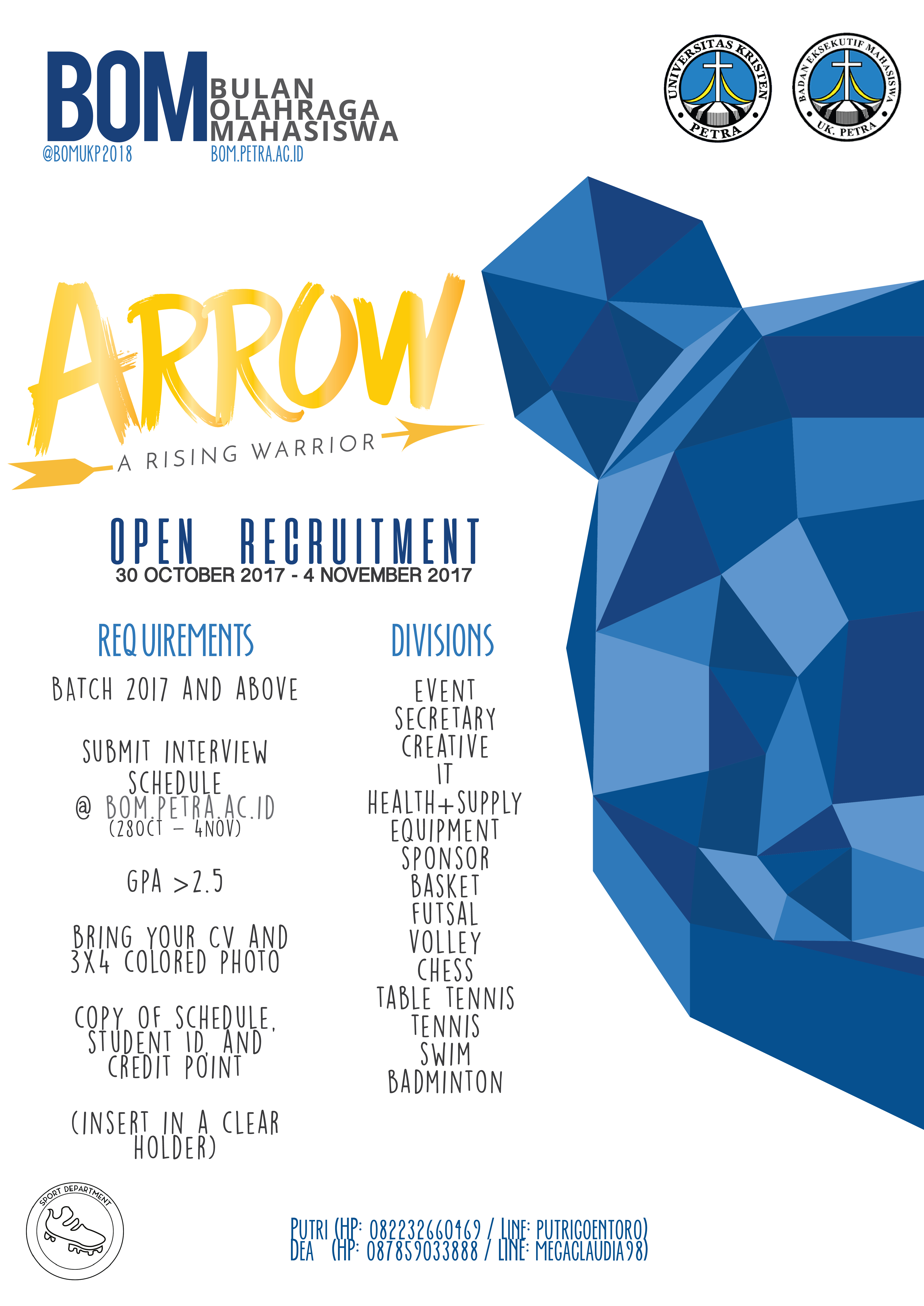 Dalam rangka persiapan BOM 2018, BEM UK Petra membuka kesempatan bagi mahasiswa UK Petra untuk bergabung dalam kepanitiaan BOM 2018. Pendaftaran dibuka hingga 4 November 2017.