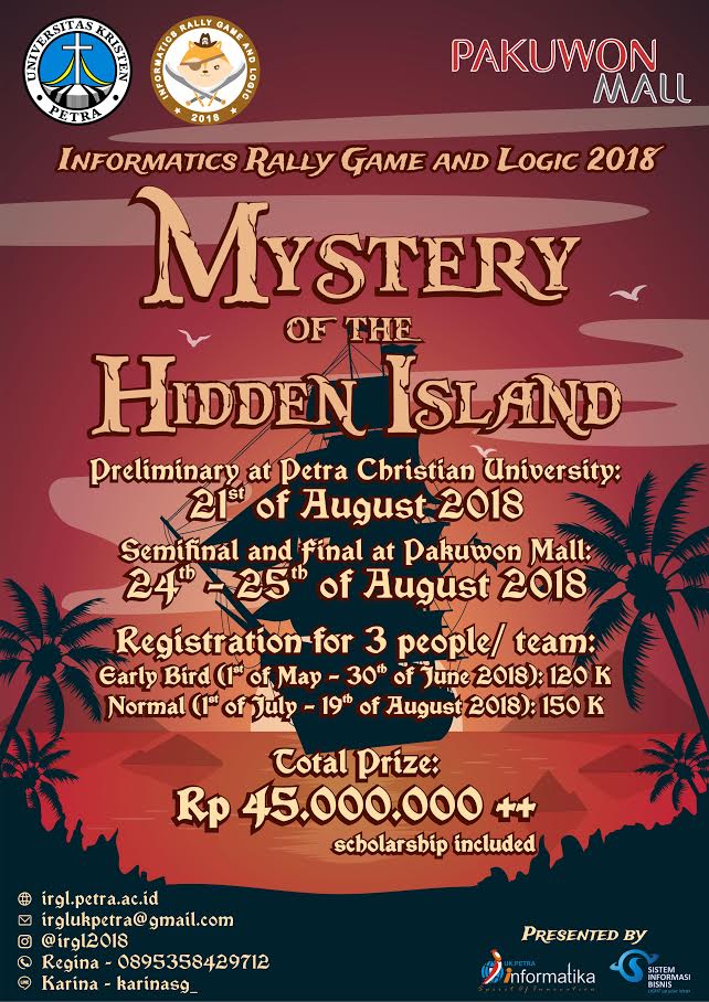 Program Studi Teknik Informatika Universitas Kristen Petra Surabaya, mengadakan acara informatics rally games and logic 2018. Acara ini mengambil tema "mystery of the hidden island." Acara penyisihan dilaksanakan di kampus UK Petra pada tanggal 21 Agustus 2018 sedangkan acara semifinal dan final dilaksanakan di Pakuwon Mall pada tanggal 24-25 Agustus 2018. Lomba ini memperebutkan total hadiah sebesar 45.000.000 rupiah.