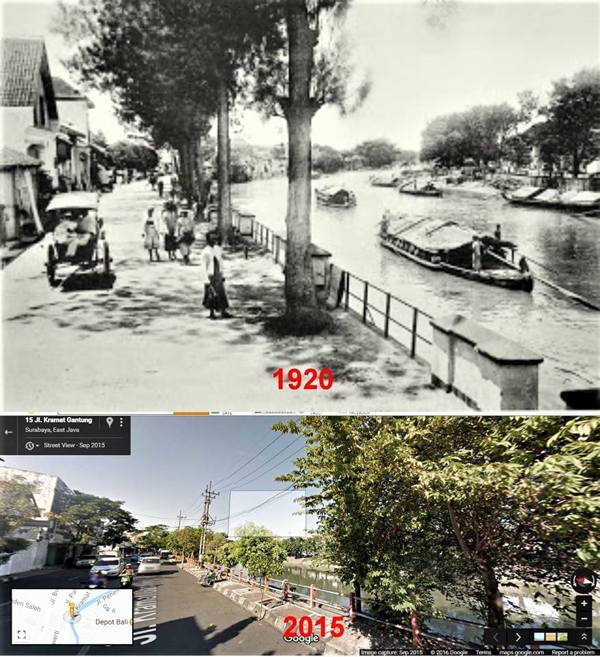 Perbedaan jalan Kramat Gantung Surabaya, pada tahun 1920 dan tahun 2015