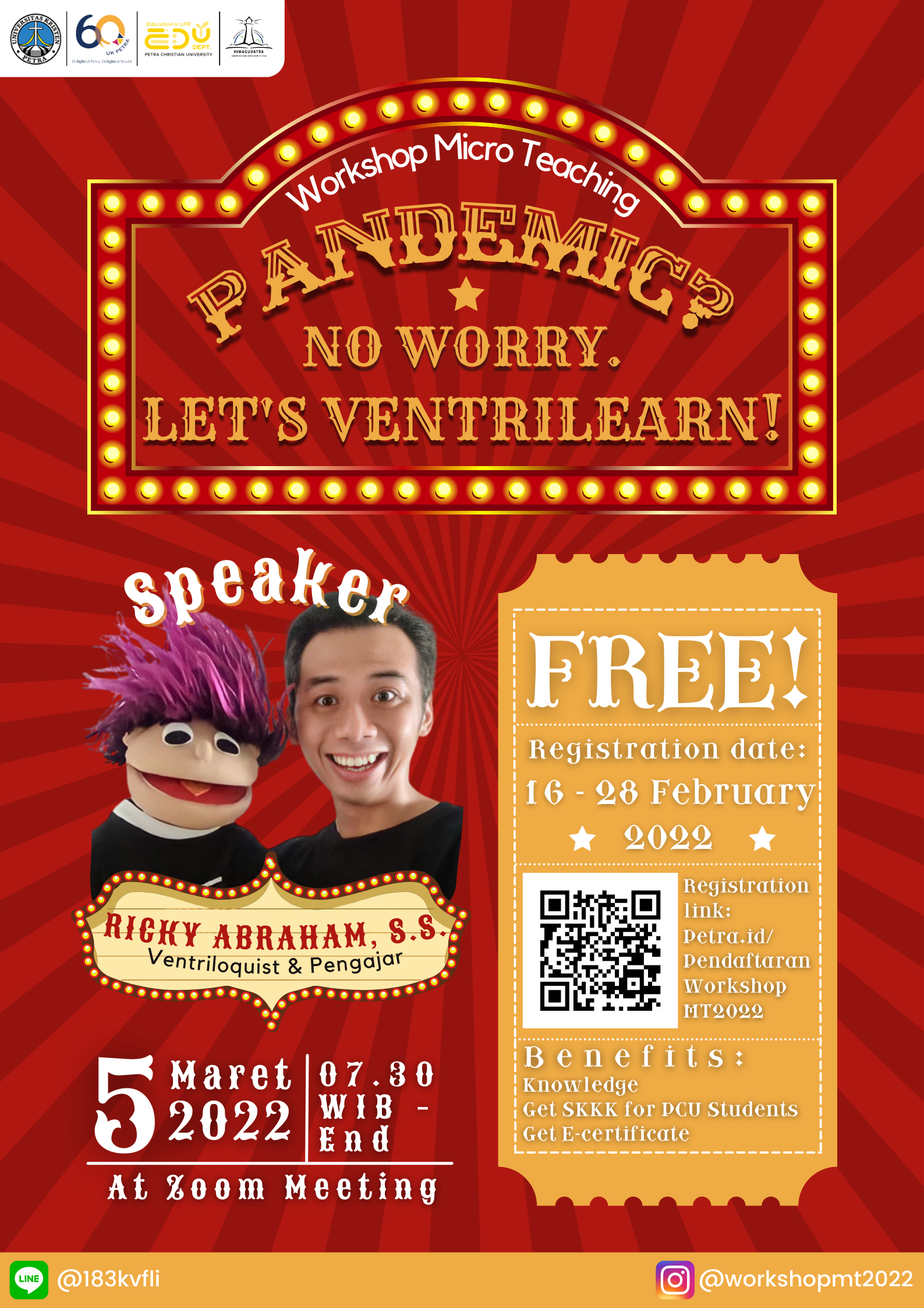 Workshop Micro Teaching 2022 dengan tema "Pandemic? No Worry. let's Ventrilearn" akan dilaksanakan pada hari Sabtu, 5 Maret 2022. Di dalam workshop ini, bersama-sama akan belajar mengenai keterampilan Ventriloque yang akan berguna untuk membuat kegiatan pembelajaran lebih menarik dan menyenangkan. Kegiatan ini mengundang pembicara yang berkompeten di bidangnya yaitu kak Ricky Abraham sebagai anggota dari Indonesia Ventriloquist Club dan juga pengajar.