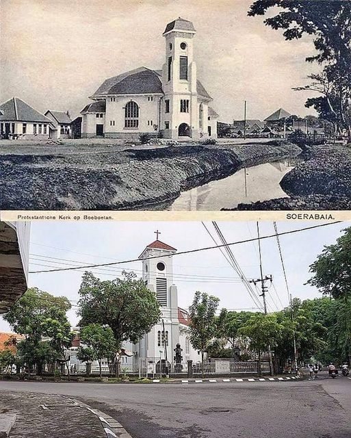 Kondisi Gereja GPIB Imanuel jalan Bubutan, Surabaya pada tahun 1925 dengan kondisi tahun 2014.