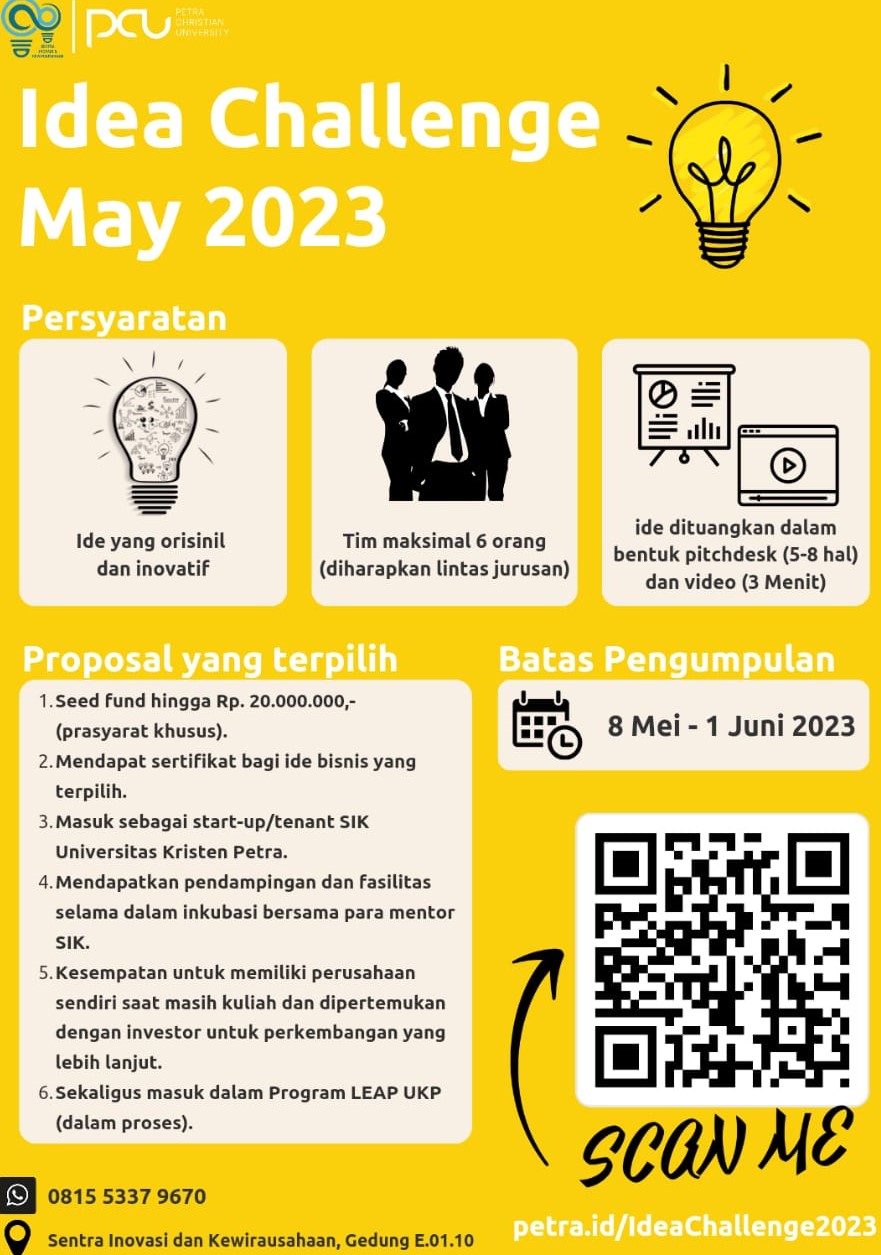 Lembaga Penelitian dan Pengabdian Masyarakat UK Petra mengadakan kegiatan yang bernama Idea Challenge May 2023. Lomba ini bertujuan untuk memunculkan start_up yang baru di lingkungan UK Petra. Untuk batas pengumpulan karya pada tanggal 08 Mei - 01 Juni 2023. Info selengkapnya bisa dilihat di petra.id/IdeaChallenge2023.