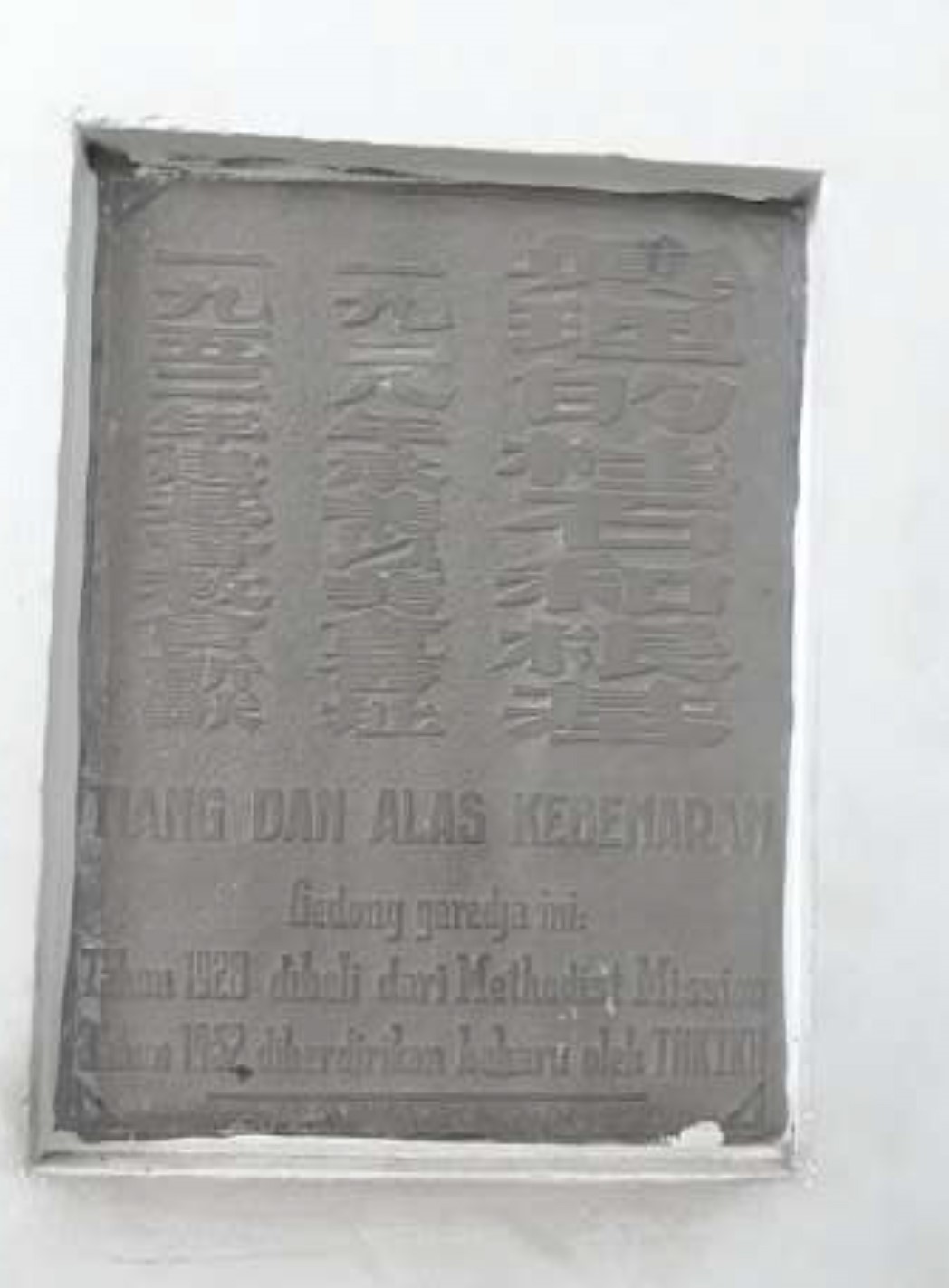 Prasasti di tembok depan gereja Tionghoa Jalan Samudra 49-51
