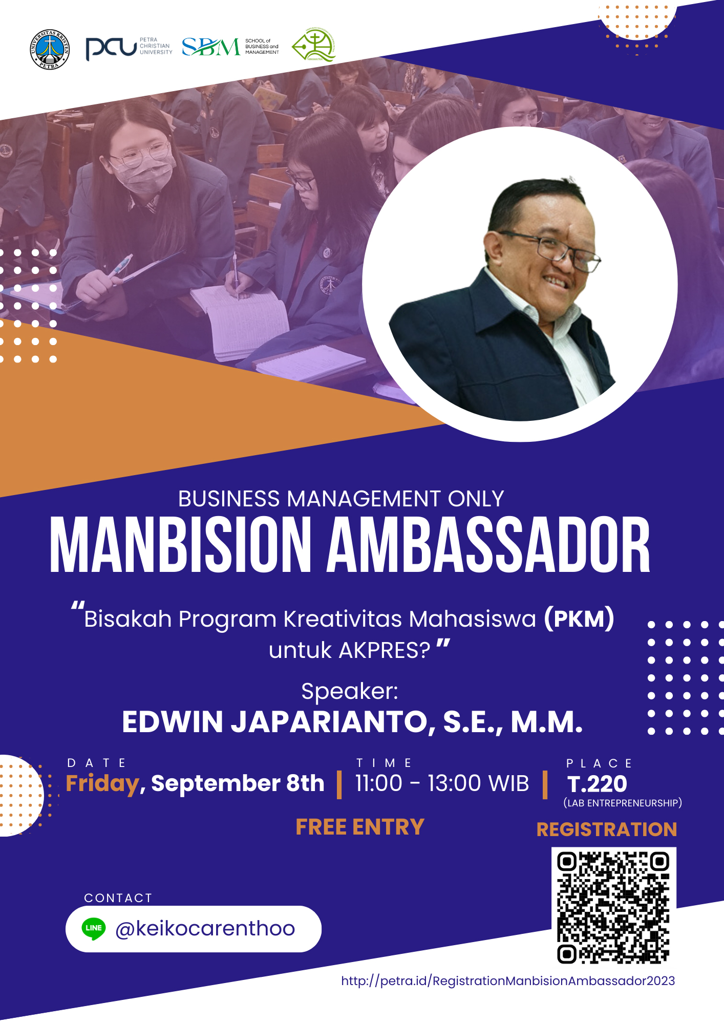 Program Manajemen Bisnis UK Petra mengadakan acara Manbision Ambassador. Acara ini bertujuan membekali mahasiswa agar dapat membuat karya tulis ilmiah yang baik dan benar, memahami konsep dasar penulisan karya tulis ilmiah, memahami ciri-ciri, jenis, dan syarat-syarat dalam pembuatan karya tulis ilmiah komunikasi bisnis. Diadakan pada 08 September 2023 dengan narasumber bapak Edwin Japarianto, S.E., M.M.