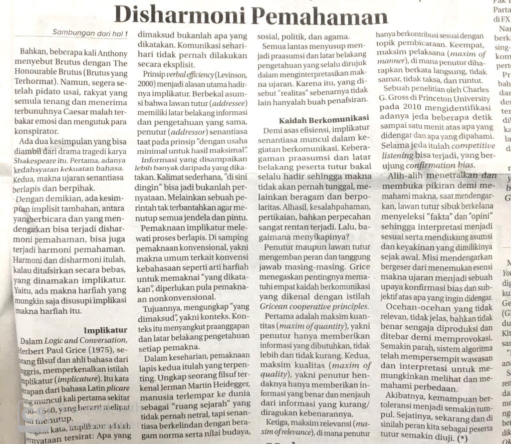 Dalam Logican.d Conversation, Herbert Paul Grice (1975), seorang filsuf dan ahli bahasa dari Inggris, memperkenalkan istilah implikatur. Pemaknaan implikatur melewati proses berlapis. Di samping pemaknaan konvensional, yakni makna umum terkait konveasi kebahasaan seperti arti harfiah untuk memaknai "yangdikatakan”, diperlukan pula pemaknaan nonkonvensional. Tujuannya, mengungkap "yang dimaksud” yakni konteks. Konteks itu menyangkut praanggapan dan latar belakang pengetahuan setiap pemakna. Demi asas efisiensi, implikatur senantiasa muncul dalam kegiatan berkomunikasl. Keberagaman praasumsi dan latar belakang peserta turur bakal selalu hadir sehingga makna tidak akan pemah tunggal, melainkan beragam dan berpolaritas. Alhasil, kesalahpahaman, pertikaian, bahkan, perpecahan sangat rentan terjadi. Lalu, bagaimana menyikapmya? Penutur maupun lawan tutur mengemban peran dan tanggung jawab masmg-masing. Grice menegaskan pentingoya mematuhi empat kaidah berkomunikasi yang dikenal dengan istilah Gricean cooperative principles Pertama adalah maksim kuantitas (maxim of quantity), yakni penutur hanva memberikan informasi yang.dibutuhkan, tidak lebih dan tidak kurang. Kedua, maksim kualitas (maxim of quality), yakni penutur hendaknya hanya memberikan informasi yang benar dan menjauh dari informasi yang kurang/ diragukan kebenarannya. Ketiga, maksim relevansi (Maxim of relevance), dimana penutur hanya berkontribusi sesuai dengan topik pembicaraan. Keempat, maksim pelaksanaan (maxim of manner), dimana penutur diharapkan berkata langsung, tidak samar, tidak taksa, dan runtut.