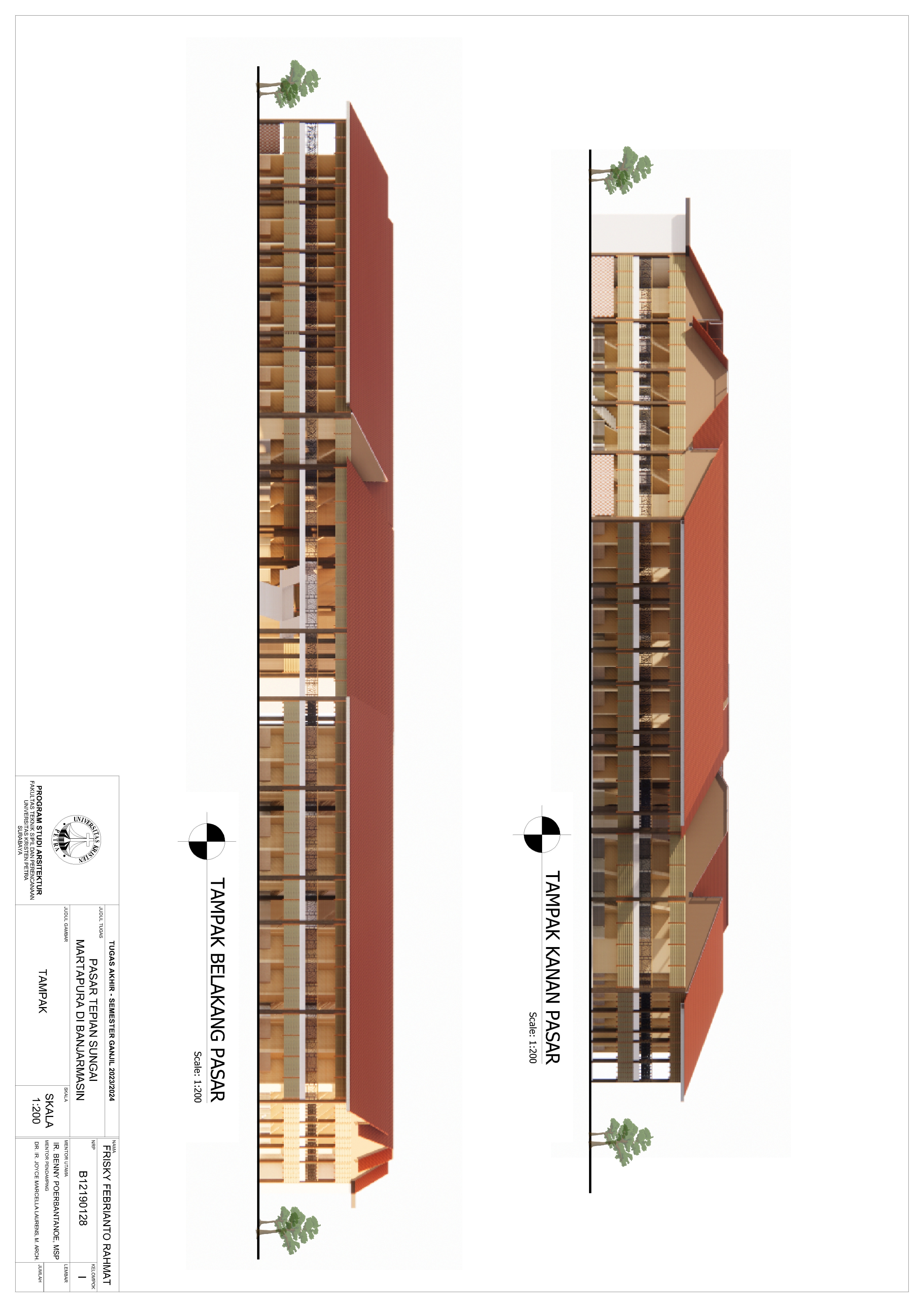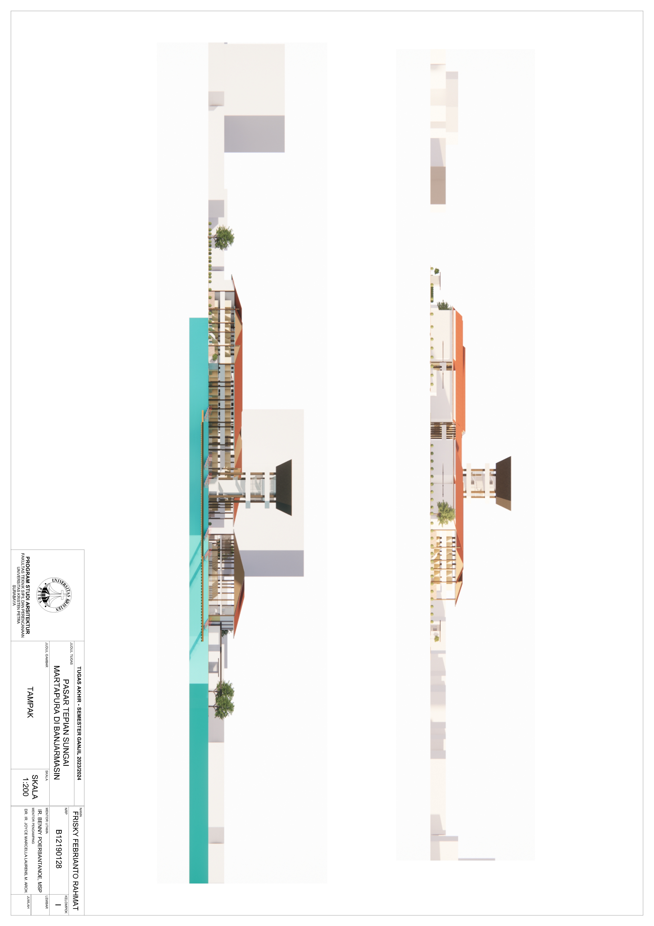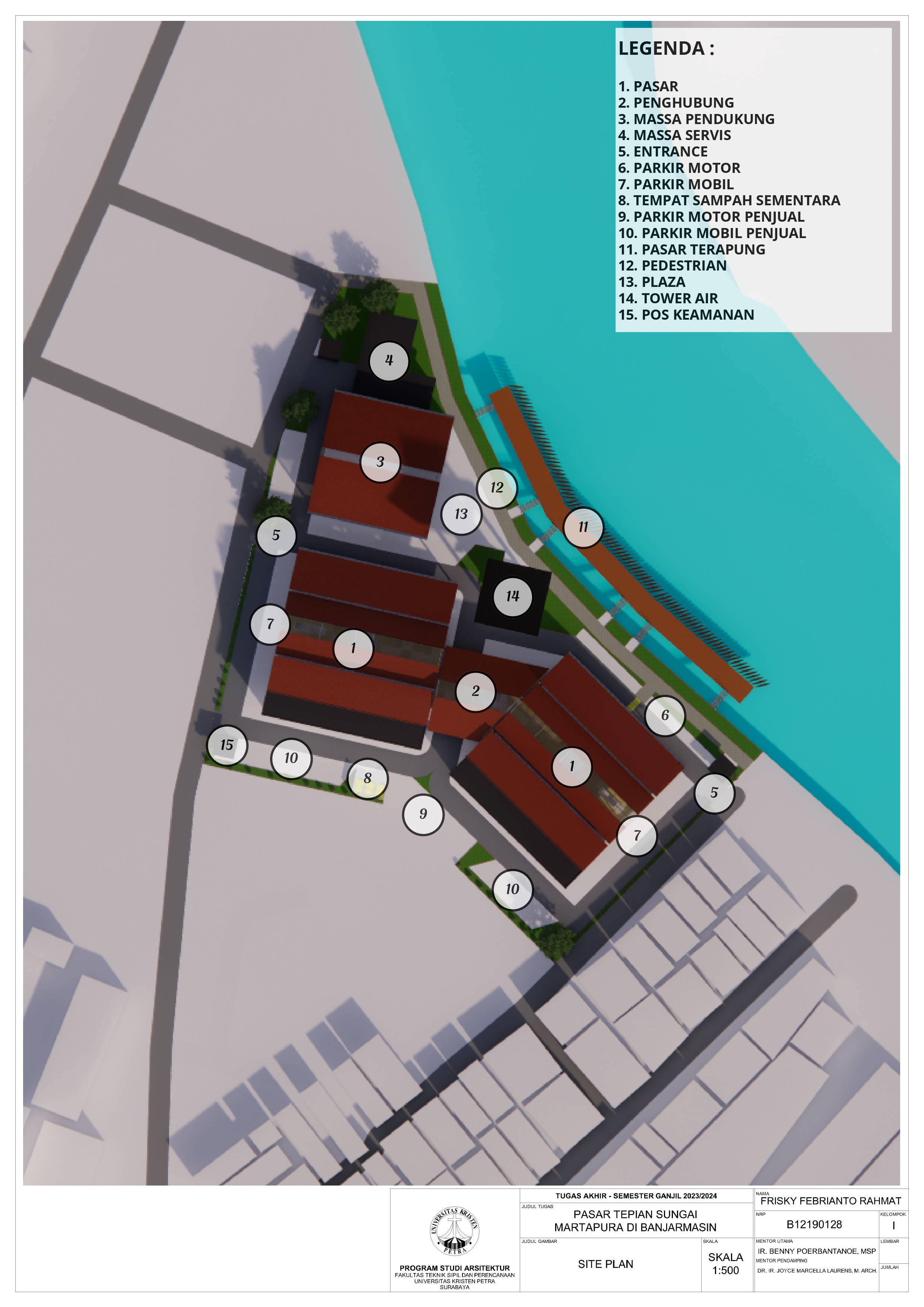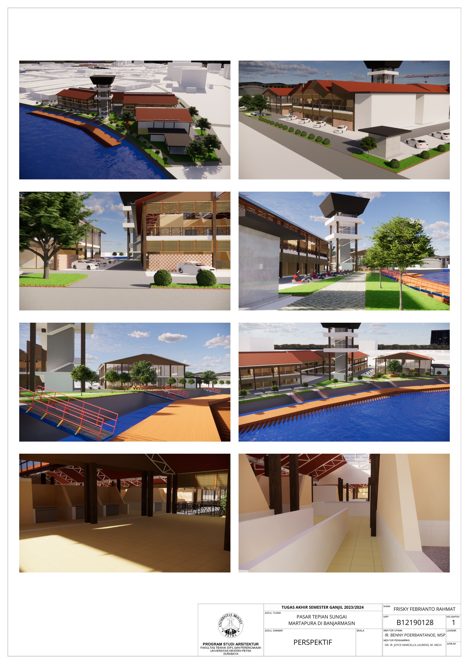 Pasar Tradisional di Banjarmasin saat ini ada 2 yaitu Pasar Tradisional di darat dan Pasar Terapung. Pasar Tradisional di darat saat ini masih kumuh, sempit, dan kurang tertata dengan baik dan juga Pasar Terapung saat ini masih kurang aman dan nyaman selain itu Pasar Terapung saat ini menjadi objek wisata di Banjarmasin. Maka dari itu Pasar Tepian Sungai Martapura ini dibutuhkan untuk menggabungkan Pasar Tradisional di darat dan Pasar Terapung agar menciptakan area Tepian Sungai yang menarik dan menjadi ikon di Banjarmasin. Untuk mendukung area Tepian Sungai ada juga fasilitas pendukung tempat makan untuk menikmati tepian Sungai dan Tower Air dengan ketinggian 21-meter yang memungkinkan diakses pengunjung untuk dapat menikmati view Sungai dari atas tower air. Pasar Tradisional yang ada di zoning secara vertical dari yang basah di lantai 1 dan kering di lantai 2, bentuk bangunan menyesuaikan modul dari kios yang tersusun berpola.