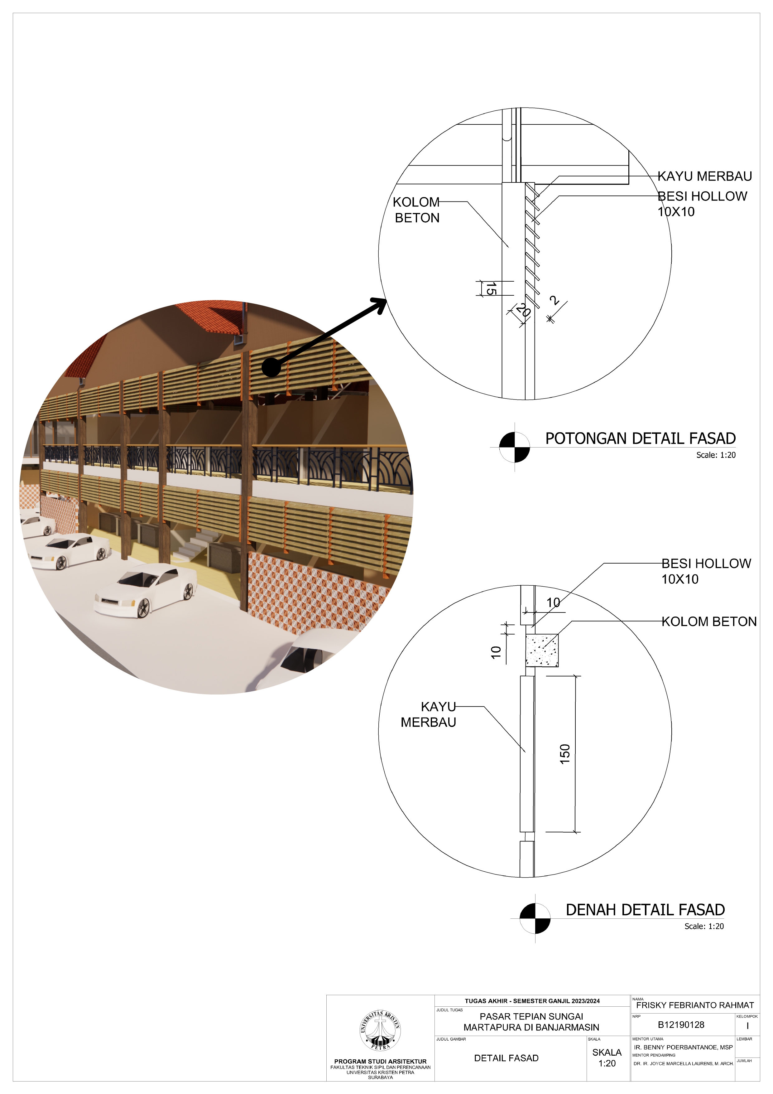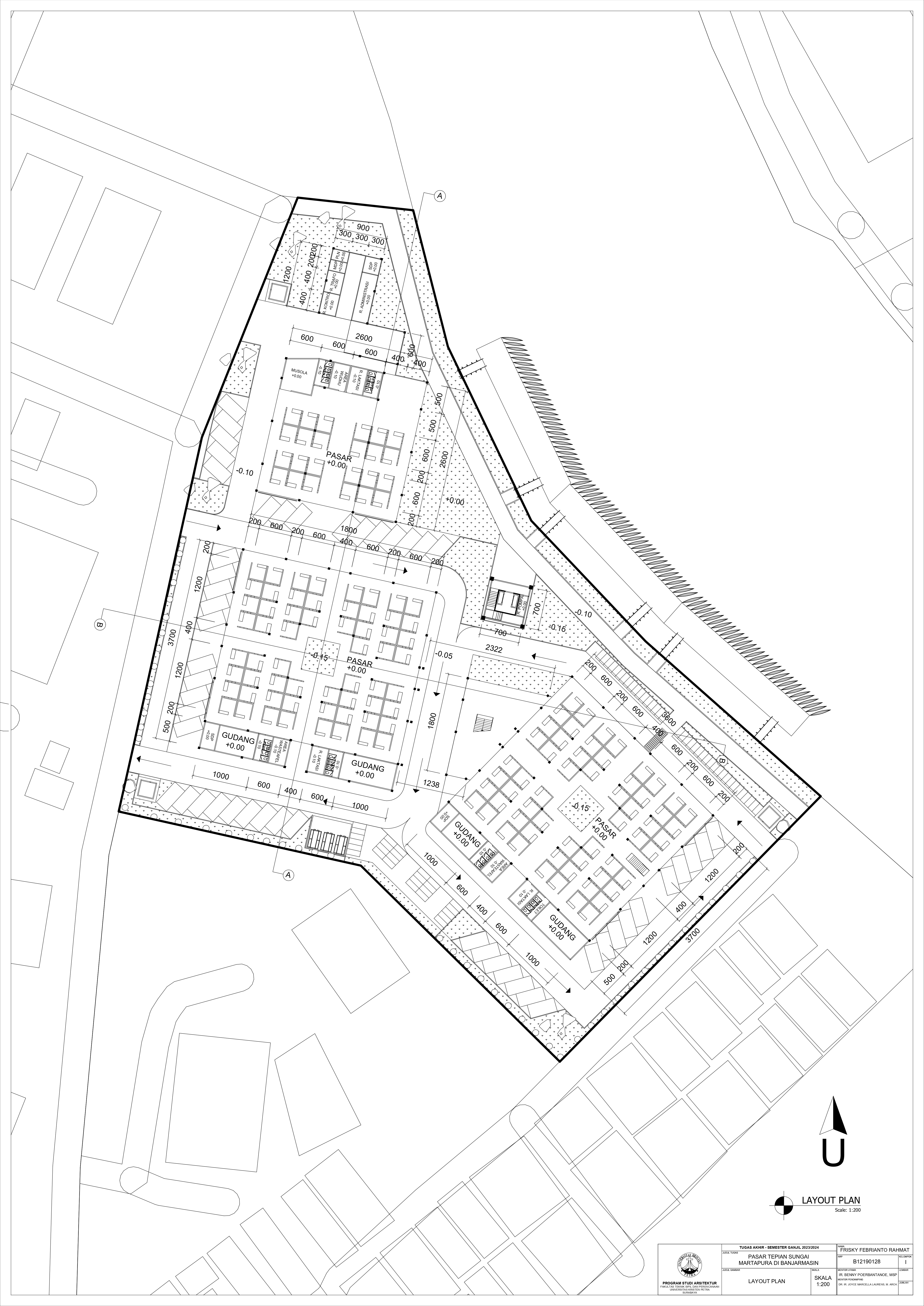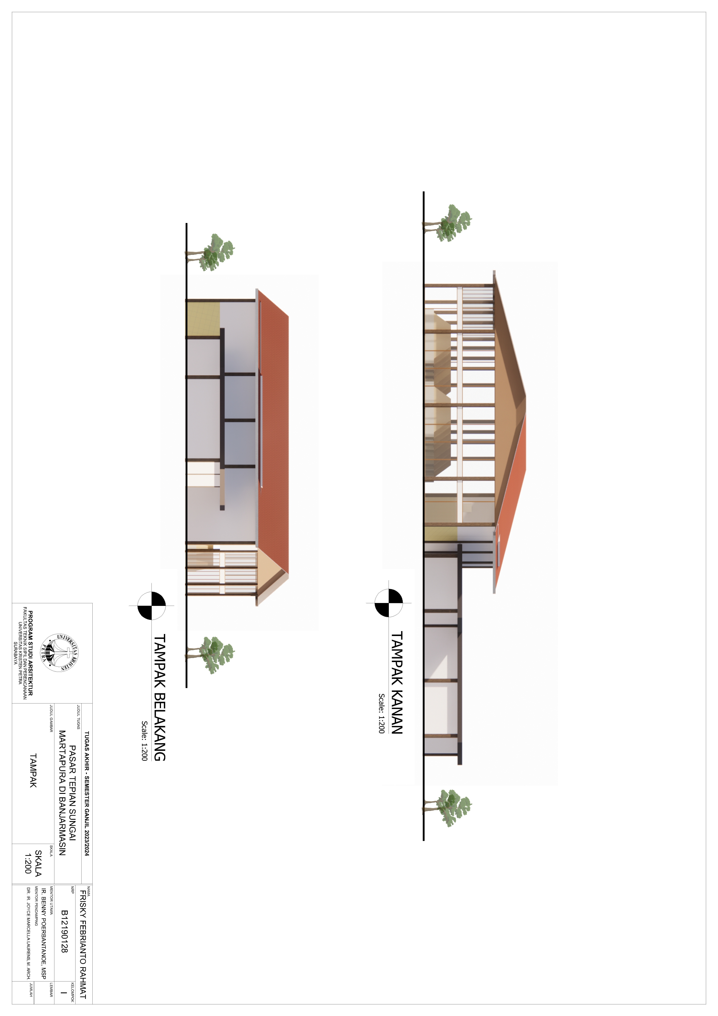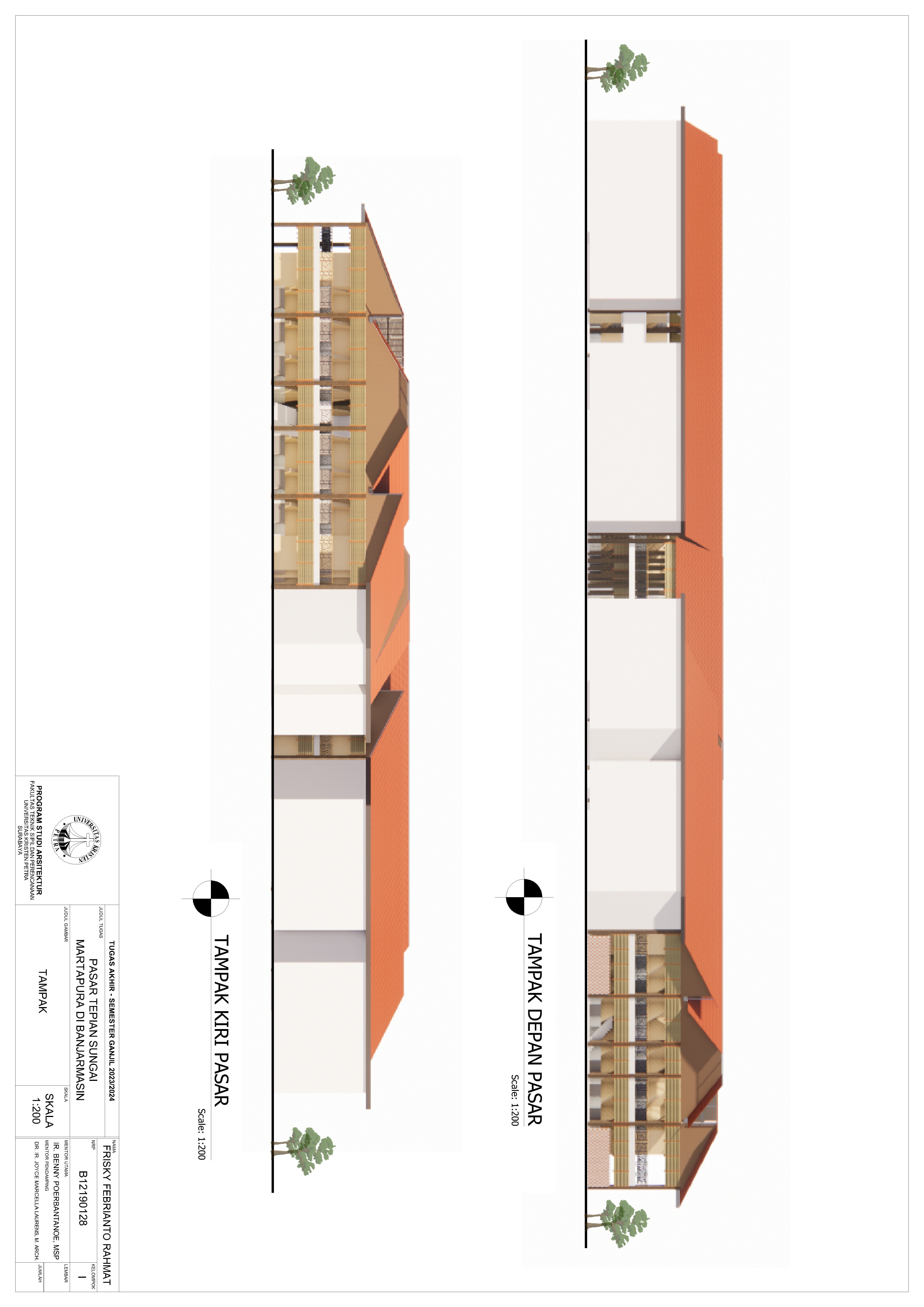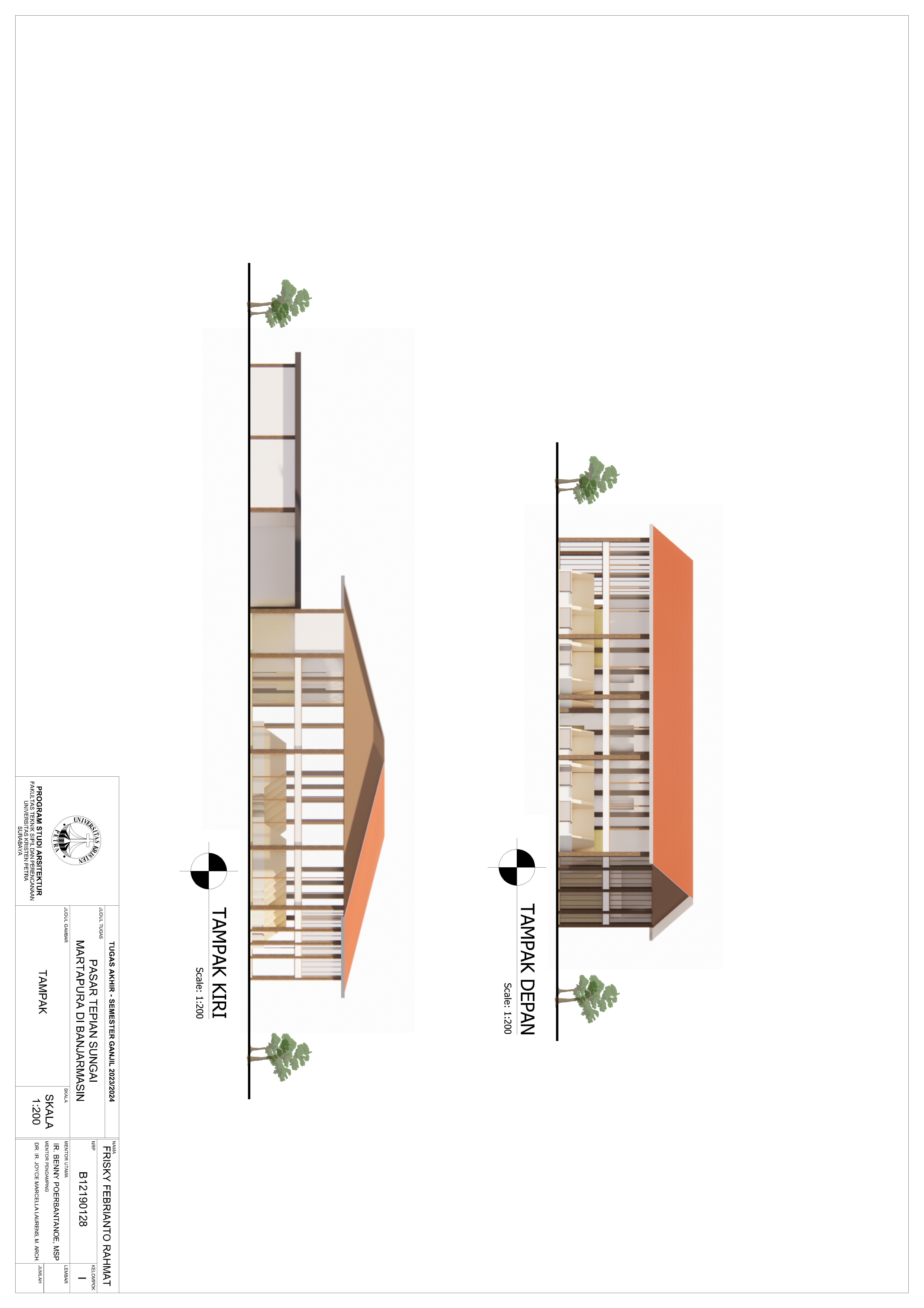 Pasar Tradisional di Banjarmasin saat ini ada 2 yaitu Pasar Tradisional di darat dan Pasar Terapung. Pasar Tradisional di darat saat ini masih kumuh, sempit, dan kurang tertata dengan baik dan juga Pasar Terapung saat ini masih kurang aman dan nyaman selain itu Pasar Terapung saat ini menjadi objek wisata di Banjarmasin. Maka dari itu Pasar Tepian Sungai Martapura ini dibutuhkan untuk menggabungkan Pasar Tradisional di darat dan Pasar Terapung agar menciptakan area Tepian Sungai yang menarik dan menjadi ikon di Banjarmasin. Untuk mendukung area Tepian Sungai ada juga fasilitas pendukung tempat makan untuk menikmati tepian Sungai dan Tower Air dengan ketinggian 21-meter yang memungkinkan diakses pengunjung untuk dapat menikmati view Sungai dari atas tower air. Pasar Tradisional yang ada di zoning secara vertical dari yang basah di lantai 1 dan kering di lantai 2, bentuk bangunan menyesuaikan modul dari kios yang tersusun berpola.