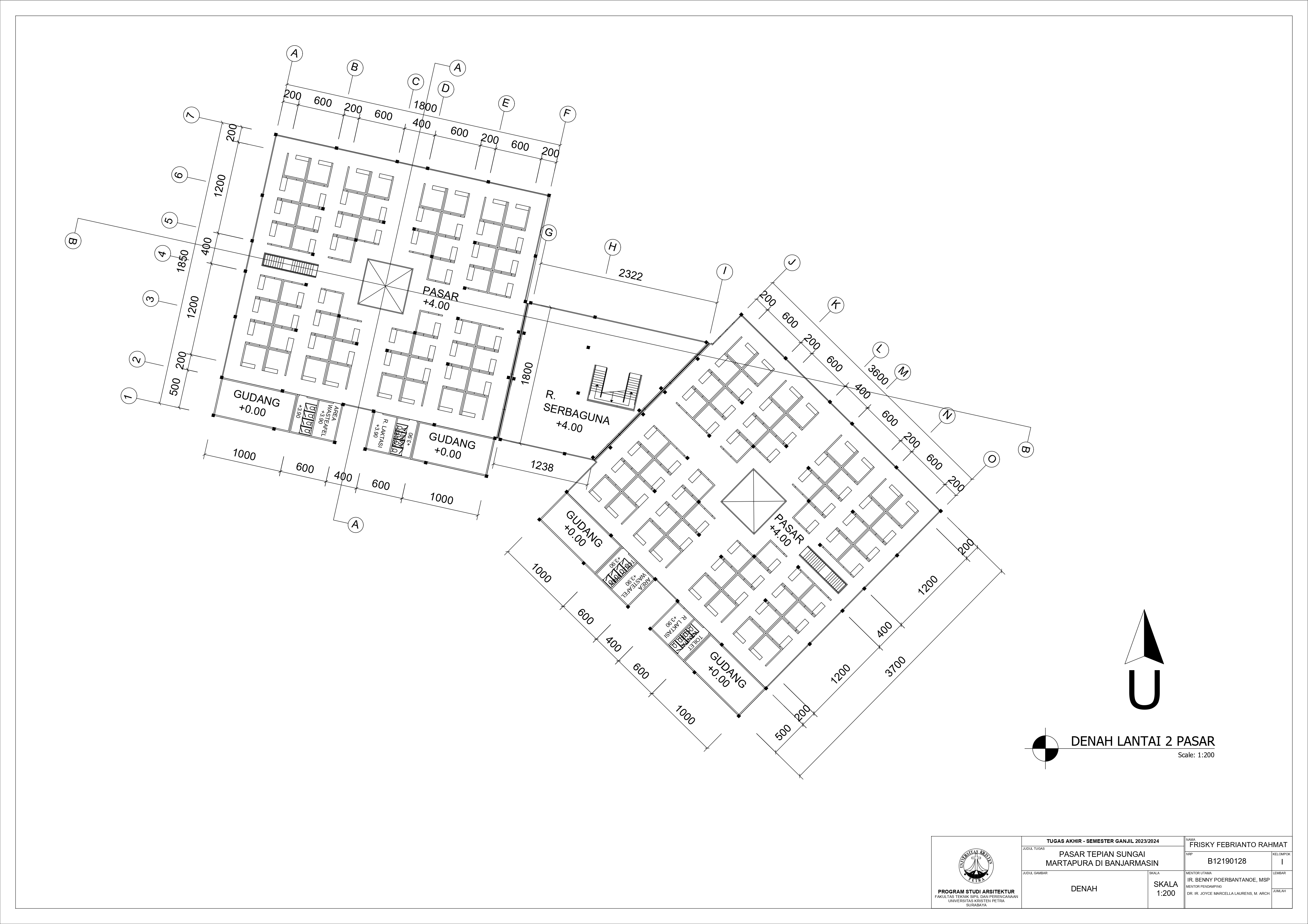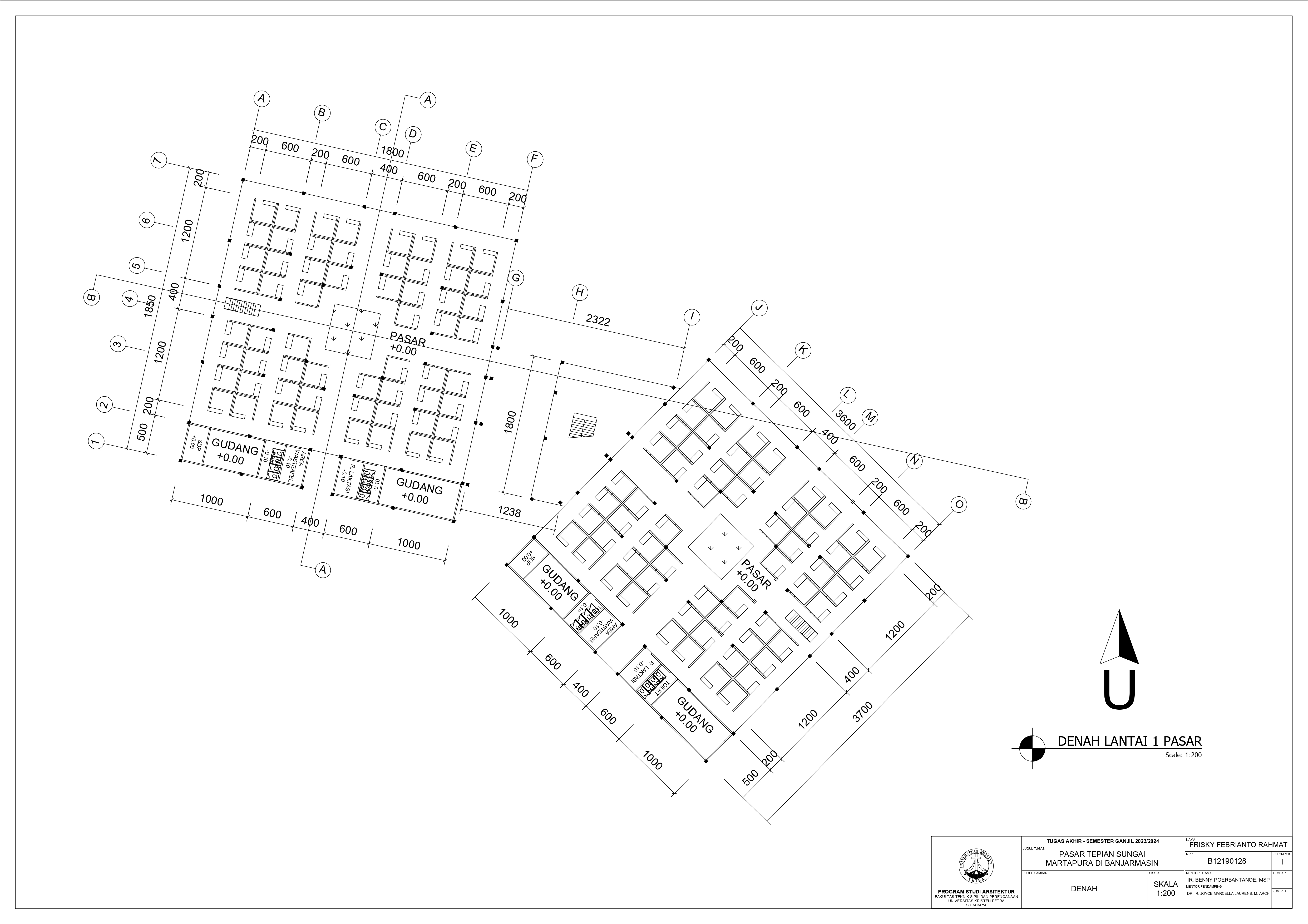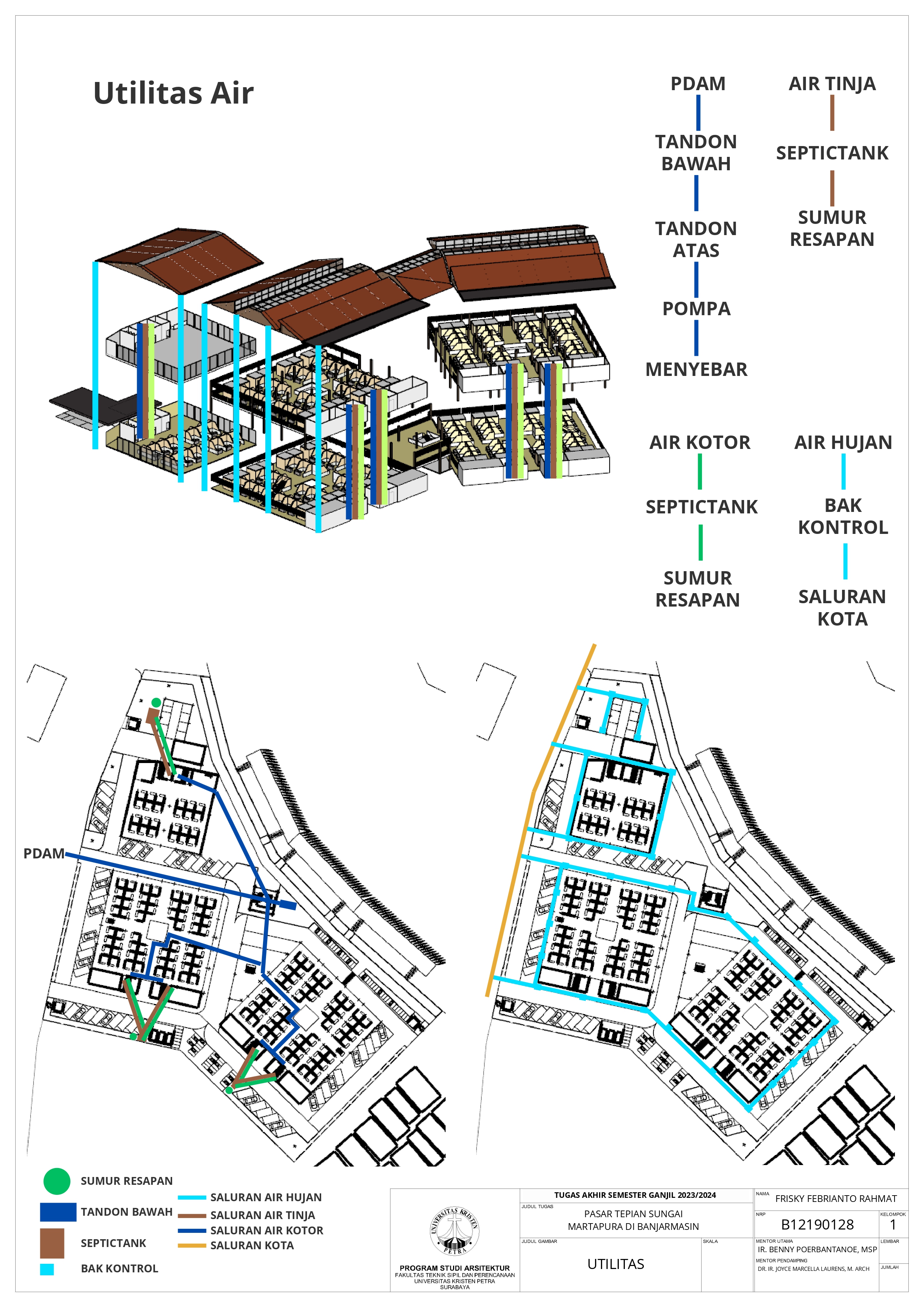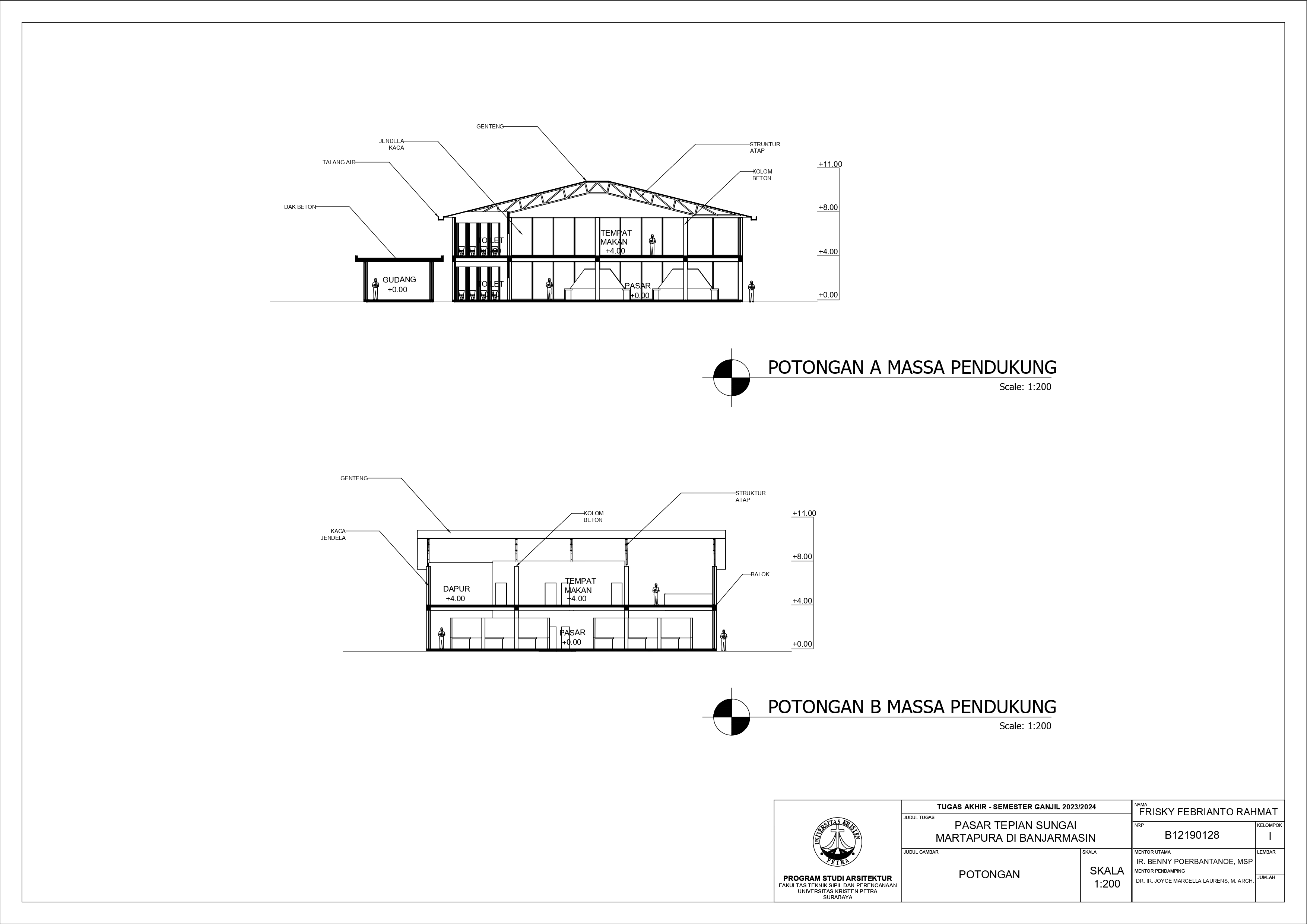 Pasar Tradisional di Banjarmasin saat ini ada 2 yaitu Pasar Tradisional di darat dan Pasar Terapung. Pasar Tradisional di darat saat ini masih kumuh, sempit, dan kurang tertata dengan baik dan juga Pasar Terapung saat ini masih kurang aman dan nyaman selain itu Pasar Terapung saat ini menjadi objek wisata di Banjarmasin. Maka dari itu Pasar Tepian Sungai Martapura ini dibutuhkan untuk menggabungkan Pasar Tradisional di darat dan Pasar Terapung agar menciptakan area Tepian Sungai yang menarik dan menjadi ikon di Banjarmasin. Untuk mendukung area Tepian Sungai ada juga fasilitas pendukung tempat makan untuk menikmati tepian Sungai dan Tower Air dengan ketinggian 21-meter yang memungkinkan diakses pengunjung untuk dapat menikmati view Sungai dari atas tower air. Pasar Tradisional yang ada di zoning secara vertical dari yang basah di lantai 1 dan kering di lantai 2, bentuk bangunan menyesuaikan modul dari kios yang tersusun berpola.