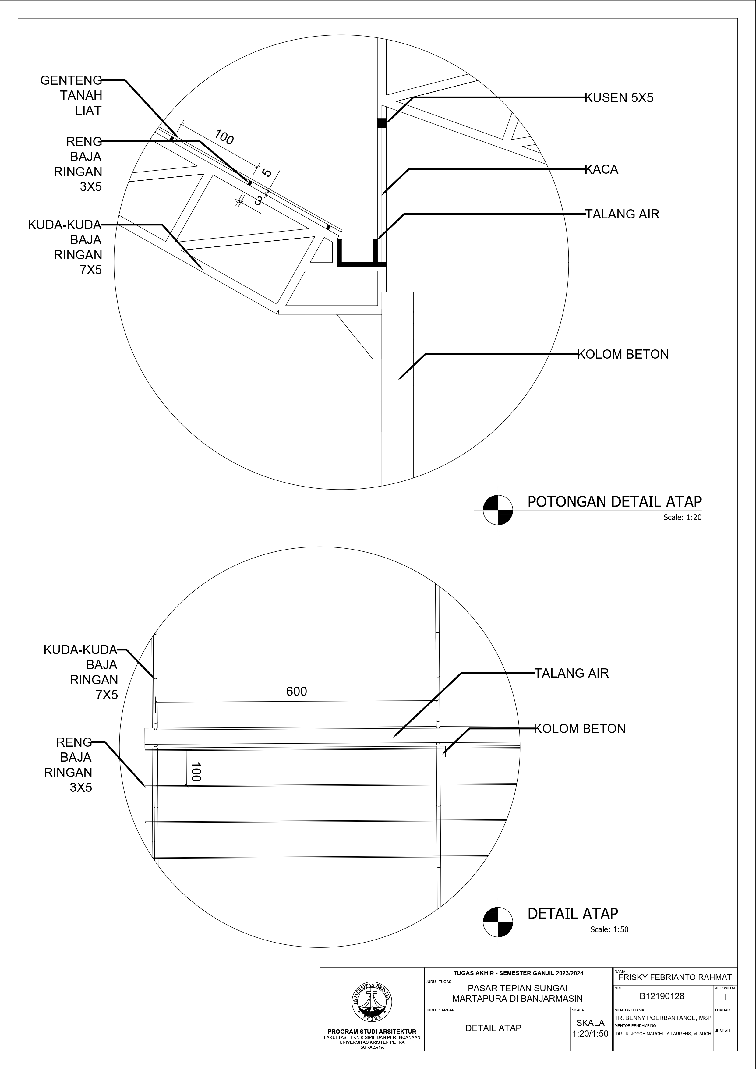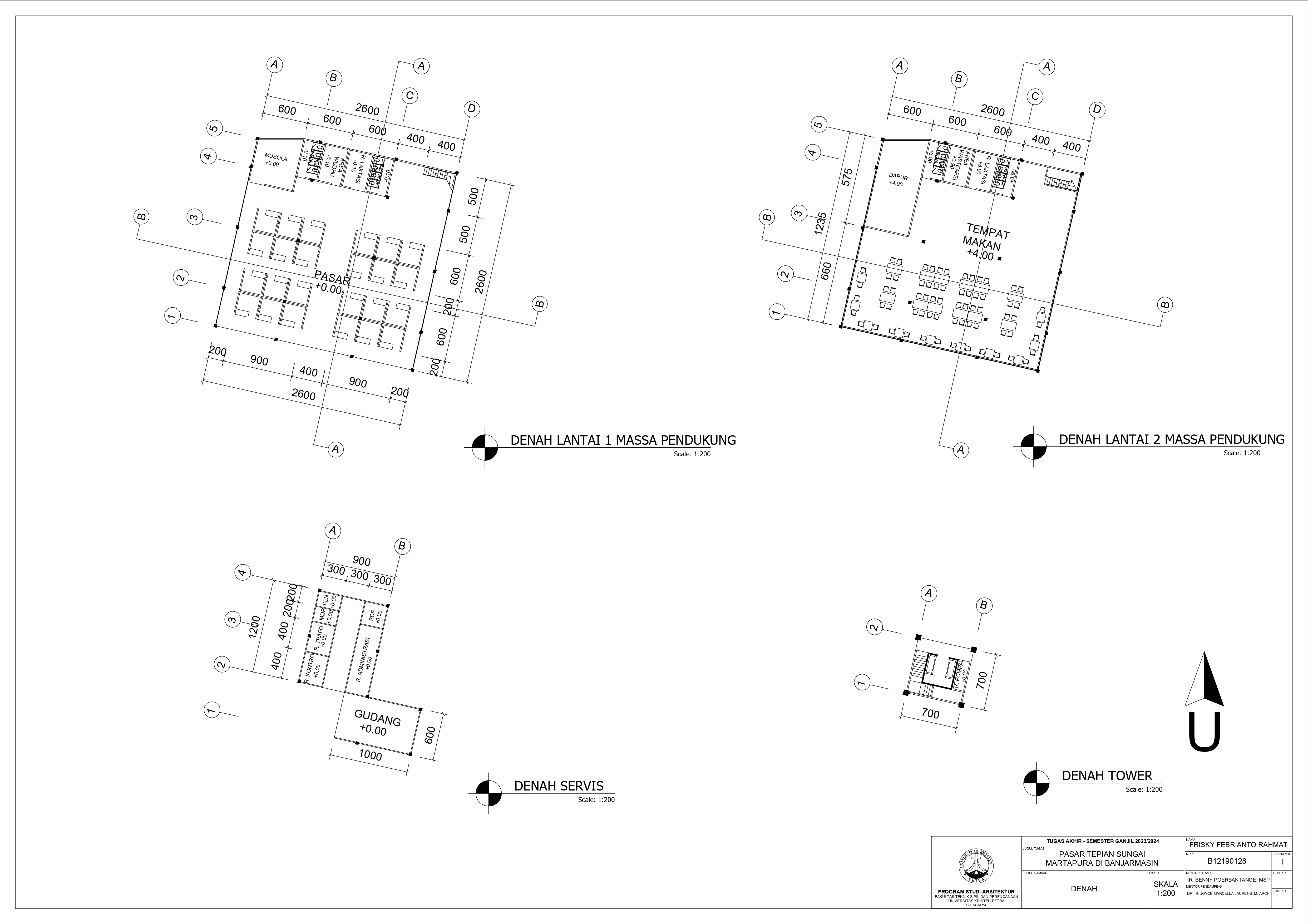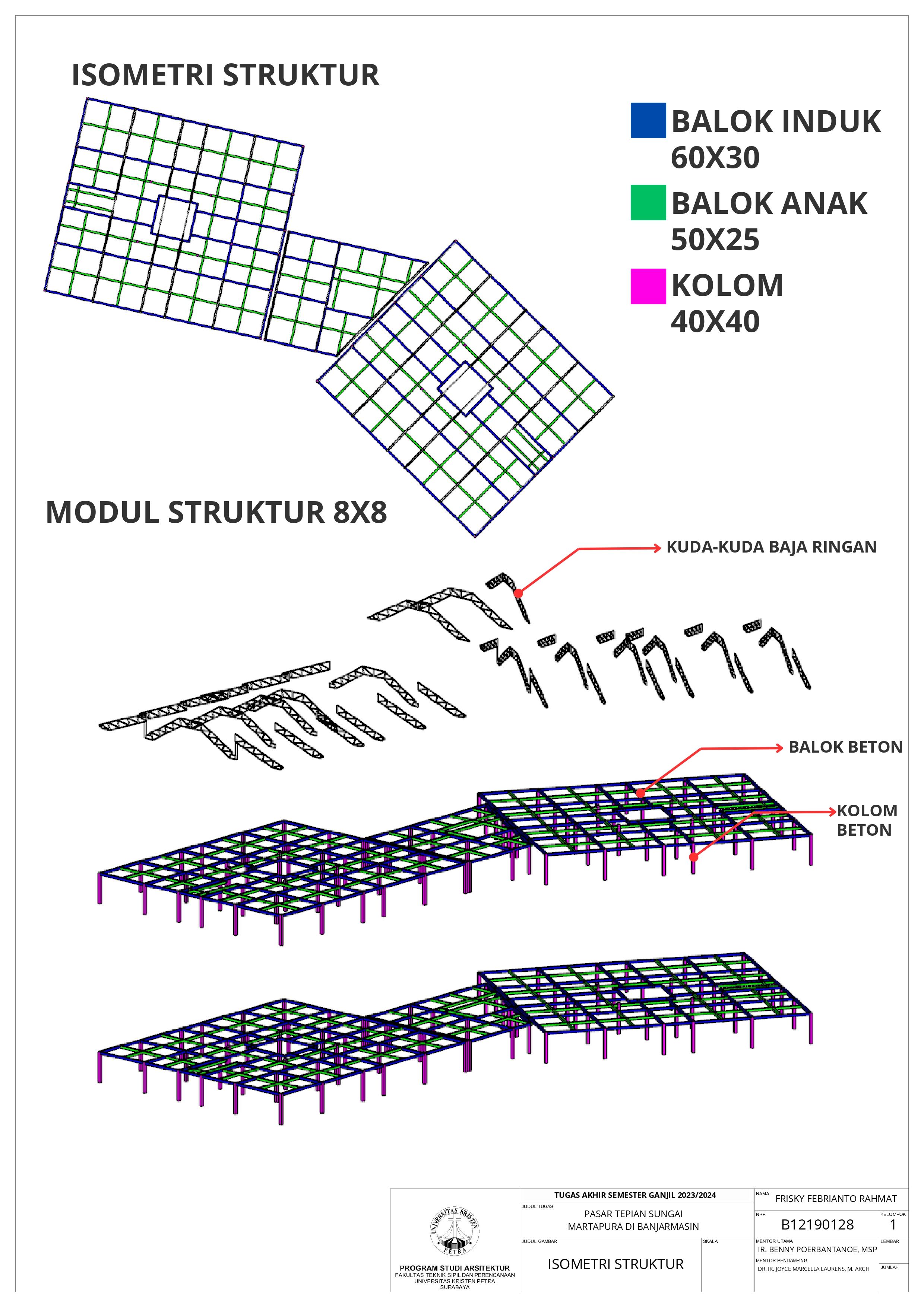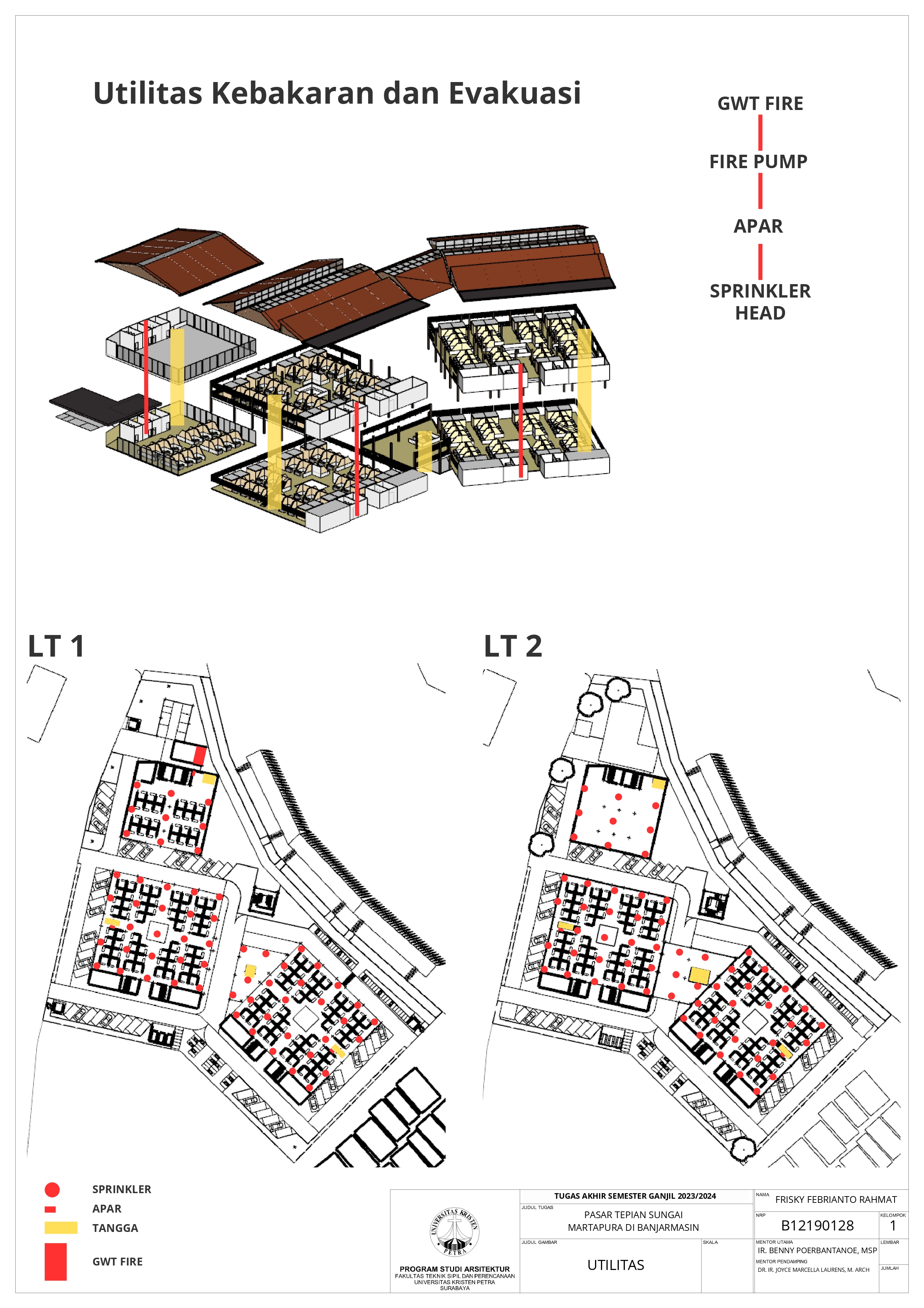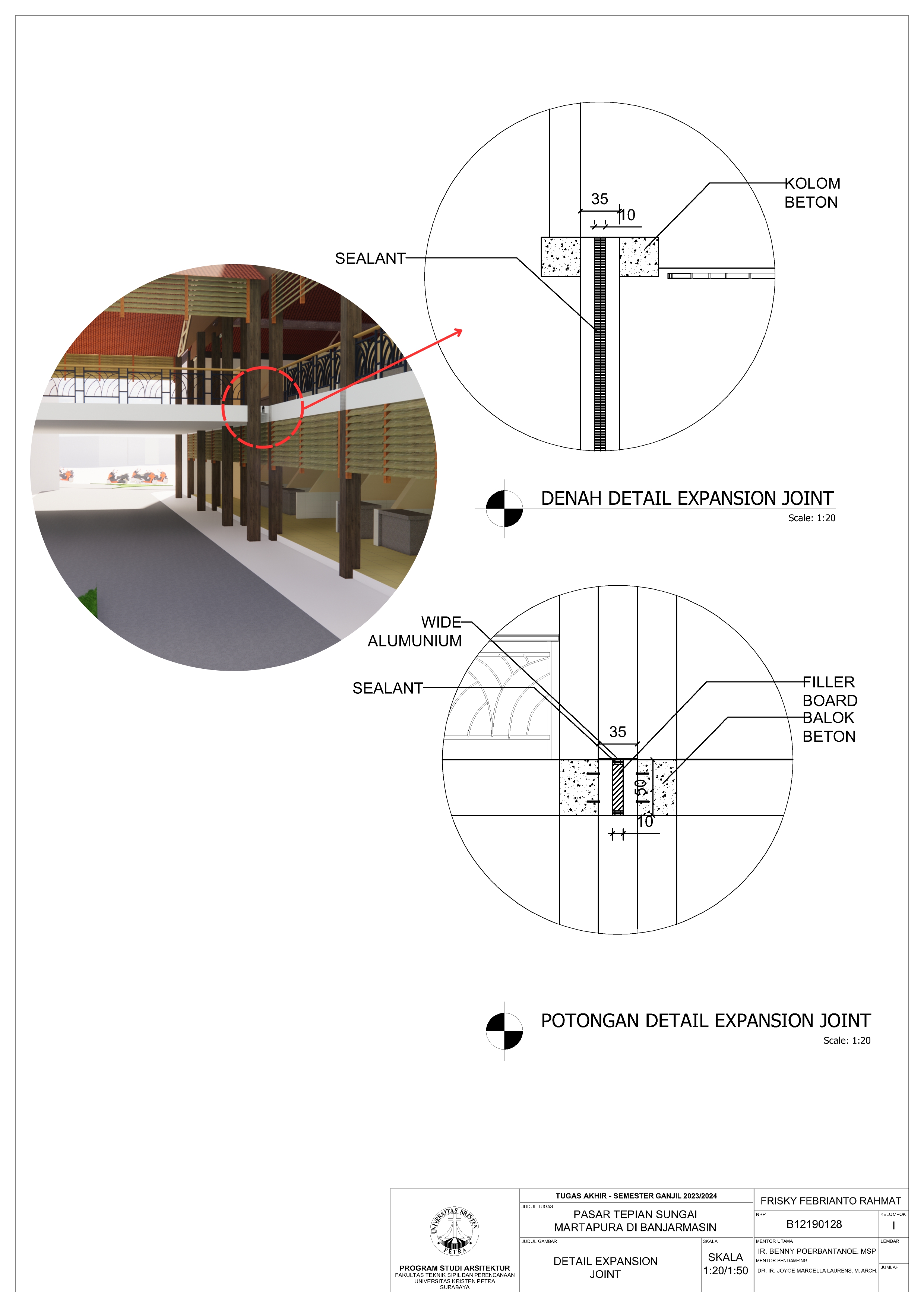 Pasar Tradisional di Banjarmasin saat ini ada 2 yaitu Pasar Tradisional di darat dan Pasar Terapung. Pasar Tradisional di darat saat ini masih kumuh, sempit, dan kurang tertata dengan baik dan juga Pasar Terapung saat ini masih kurang aman dan nyaman selain itu Pasar Terapung saat ini menjadi objek wisata di Banjarmasin. Maka dari itu Pasar Tepian Sungai Martapura ini dibutuhkan untuk menggabungkan Pasar Tradisional di darat dan Pasar Terapung agar menciptakan area Tepian Sungai yang menarik dan menjadi ikon di Banjarmasin. Untuk mendukung area Tepian Sungai ada juga fasilitas pendukung tempat makan untuk menikmati tepian Sungai dan Tower Air dengan ketinggian 21-meter yang memungkinkan diakses pengunjung untuk dapat menikmati view Sungai dari atas tower air. Pasar Tradisional yang ada di zoning secara vertical dari yang basah di lantai 1 dan kering di lantai 2, bentuk bangunan menyesuaikan modul dari kios yang tersusun berpola.