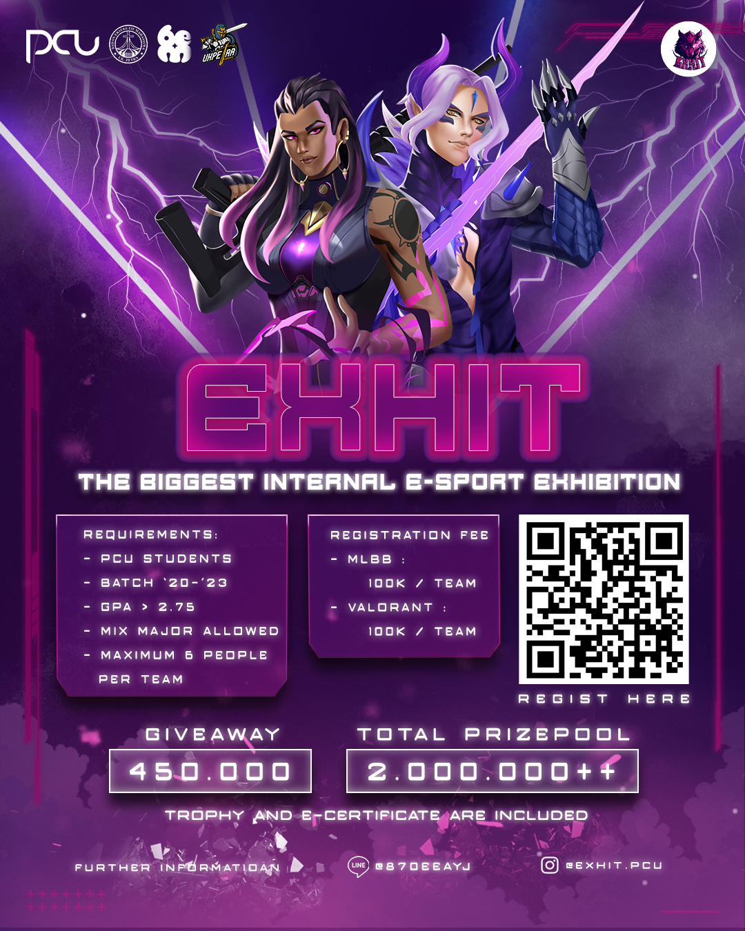 𝐄𝐗𝐇𝐈𝐓 𝟐𝟎𝟐𝟒 adalah Turnamen e-sport untuk mahasiswa PCU yang ingin melatih dan menantang kemampuannya dalam bidang e-sport.