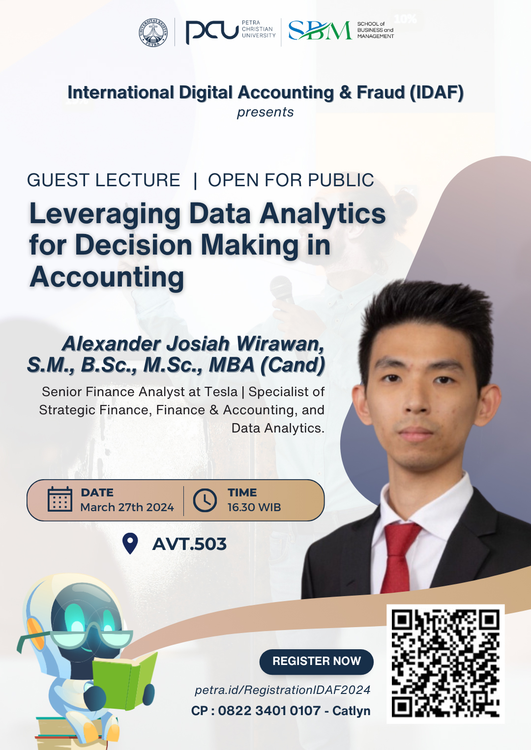 Perkembangan teknologi digital yang pesat, misalnya big data, cloud accounting, data analytics, artificial intelligence, mendorong digitalisasi di dalam bisnis. Perkembangan tersebut juga mentranformasi sistem informasi akuntansi dan keuangan. Akuntan sebagai agen akuntanbilitas juga perlu beradaptasi dengan perkembangan yang ada dan meningkatkan orientasi pada teknologi digital. Salah satu dampak dari digitalisasi ini memberikan kemudahan akuntan dengan efisiensi, akurasi data, produktivitas, lebih cepatnya memperoleh laporan, dsb. Untuk meningkatkan awareness Masyarakat mengenai perubahan pesat teknologi digital di akuntansi dan keuangan, Program IDAF mengadakan kuliah umum dengan topik “Leveraging Data Analytics for Decision Making in Accounting”. Acara ini diselenggarakan pada 27 Maret 2024 bertempat di gedung AV.T.503. dengan narasumber Alexander Josiah Wirawan, S.M., B.Sc., M.Sc.