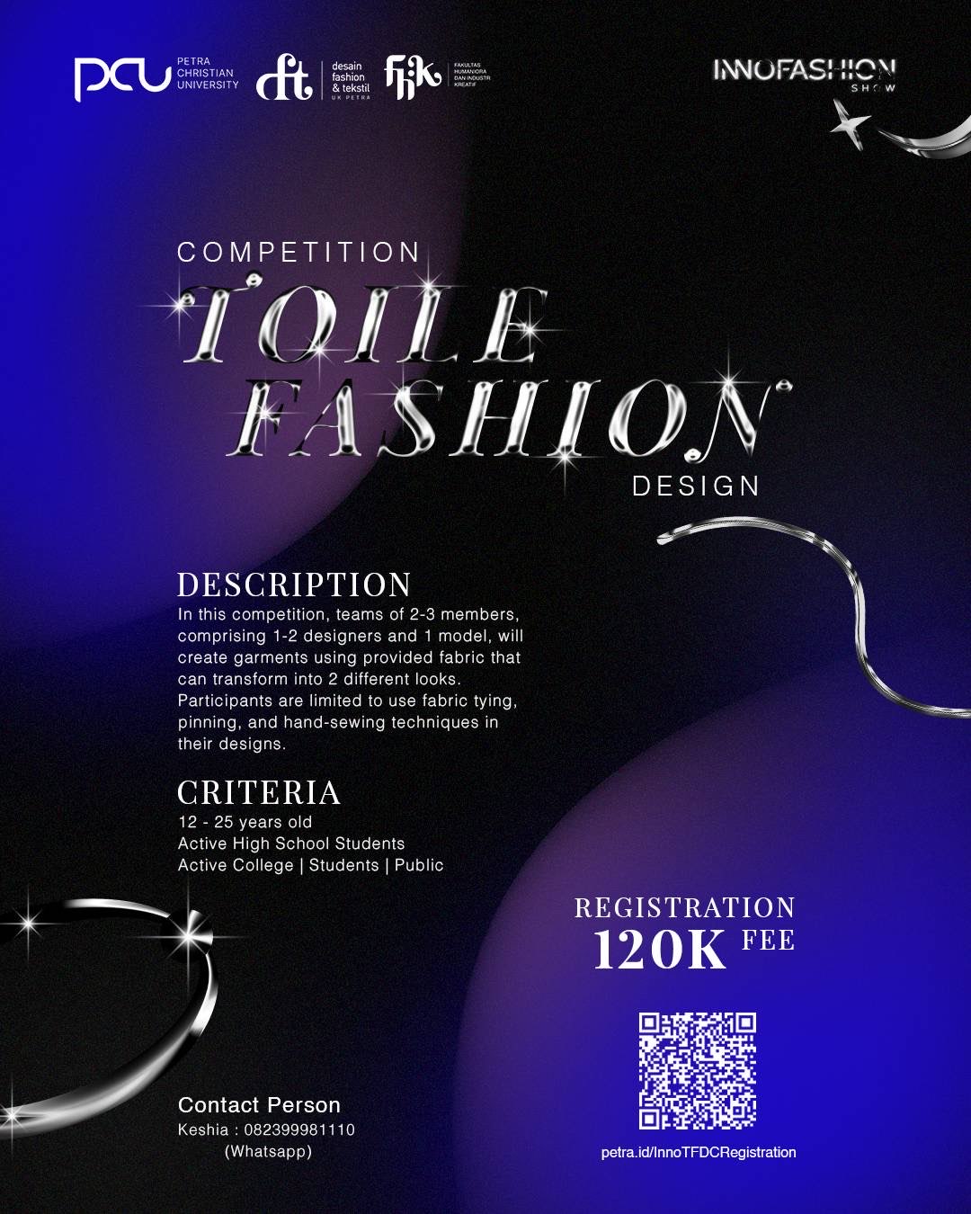 In this competition, teams of 2-3 members, comprising 1-2 designers and 1 model, will create garments using provided fabric that can transform into 2 different looks. Participants are limited to use fabric tying, pinning, and hand-sewing techniques in their designs.