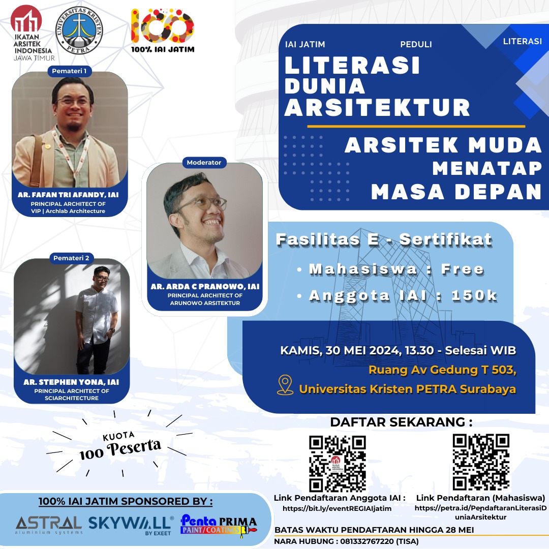 Kolaborasi Ikatan Arsitek Indonesia (IAI) Prov. Jawa Timur& Universitas Kristen PETRA memberikan Literasi Informasi melalui Talkshow yang mengangkat topik : "ARSITEK MUDA MENATAP MASA DEPAN"