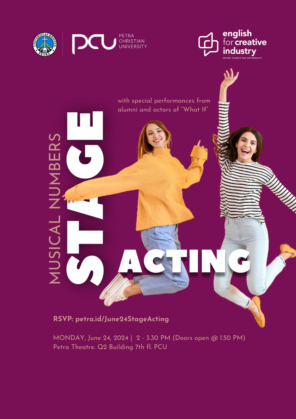 Guna meningkatkan kemampuan mahasiswa di bidang drama dan panggung, Program English For Creative Industry Universitas Kristen Petra Surabaya mempersembahkan pertunjukan drama musical yang diperankan oleh mahasiswa di kelas Stage Acting 2024. Acara ini diselenggarakan pada 24 Juni 2024 di Petra Theatre gedung Q.2.