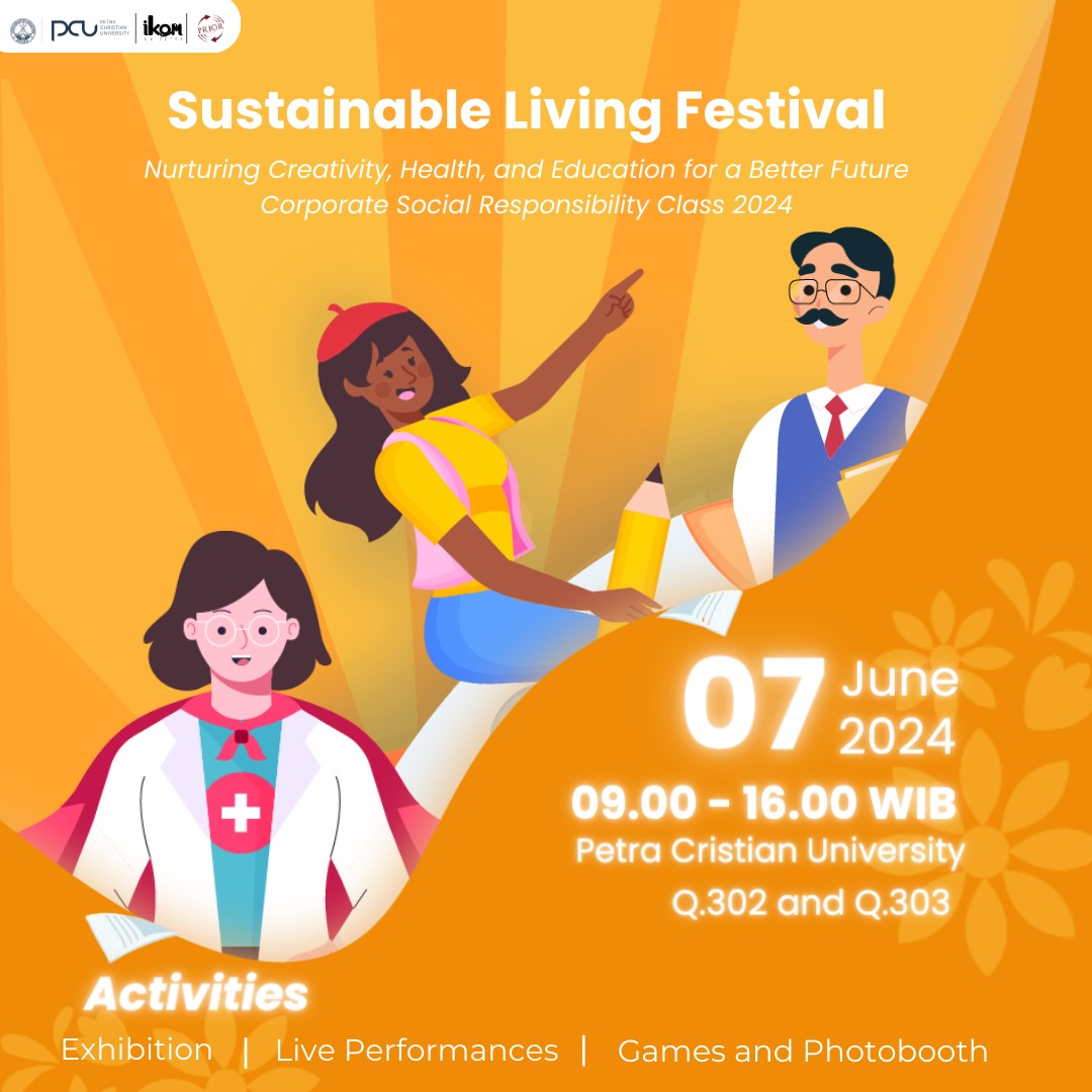 Sustainable Living Festival adalah pameran kegiatan CSR yang merupakan kolaborasi antara industri dan Program Studi Ilmu Komunikasi untuk melayani komunitas-komunitas di Surabaya. Tujuan festival ini adalah membagikan cerita tentang kepedulian industri pada konsep kesejahteraan masyarakat secara berkelanjutan. Acara pameran ini diselenggarakan pada 07 Juni 2024 bertempat di Gedung Q 302 dan 303.