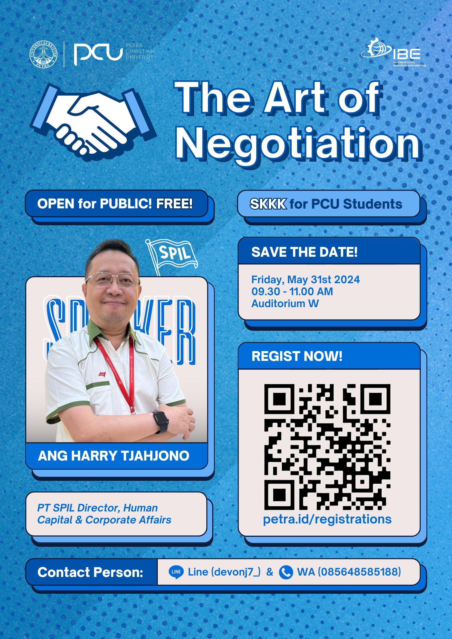 Bersiaplah untuk merevolusi pendekatan Anda dalam negosiasi saat Anda menemukan teknik yang ampuh, keterampilan komunikasi yang hebat, dan taktik persuasif yang akan mendorong Anda ke tingkat pencapaian baru! Acara ini diselenggarakan pada 31 Mei 2024, bertempat di Auditorium kampus W.
