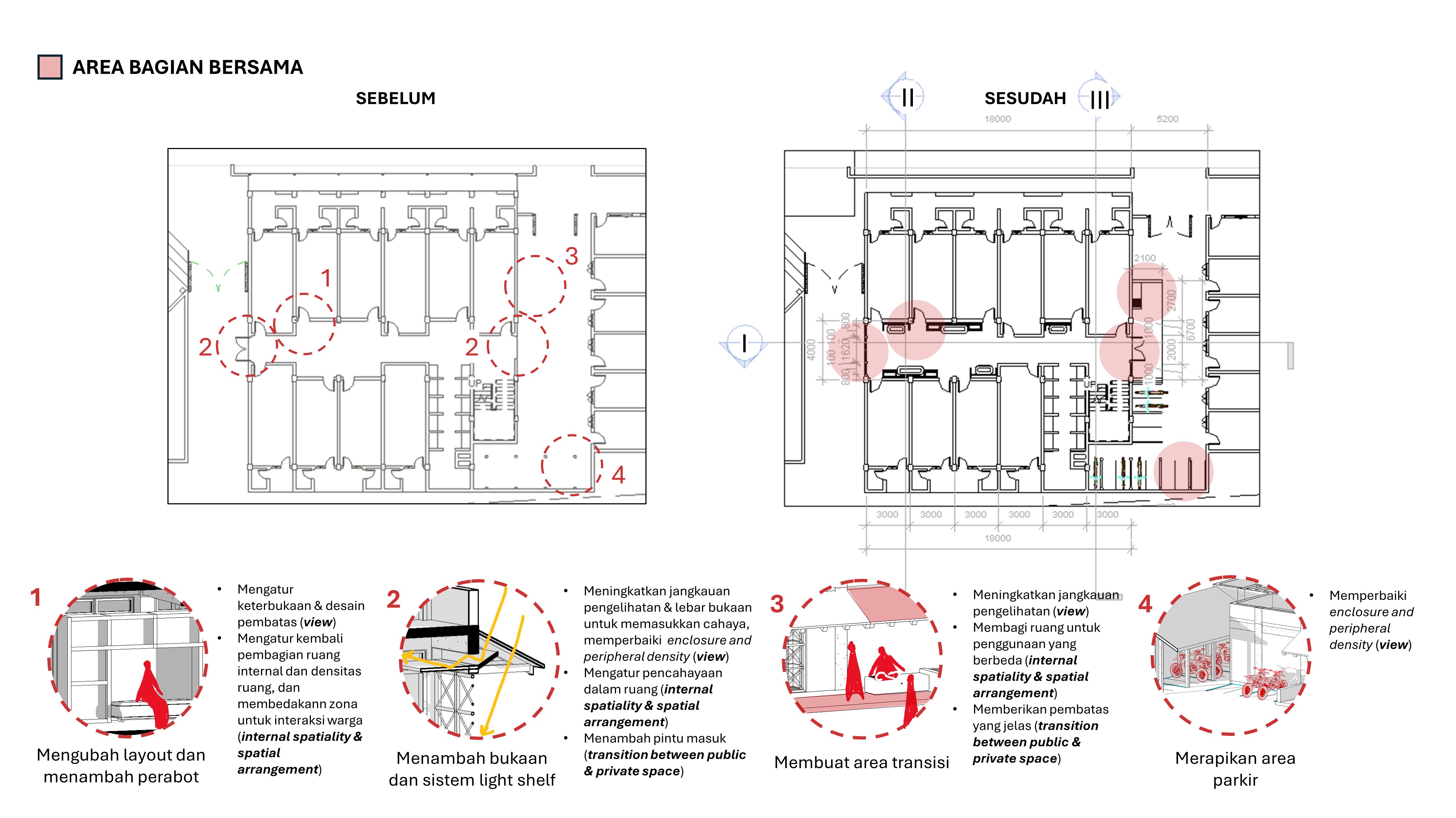 Banyaknya permasalahan mengenai isu kriminalitas di hunian, khususnya hunian bersama membuat hidup warganya menjadi kurang sejahtera. Di Surabaya, terdapat Rusunawa Dupak Bangunrejo yang memiliki kejahatan pencurian yang cukup sering berdasarkan dari data kepolisian setempat dan juga penelitian sebelumnya jika dibandingkan dengan rusunawa sejenis. Dalam mencegah terjadinya kejahatan yang ada di rusunawa, penelitian ini akan mencari hubungan antara penceahan kriminalitas dengan kualitas ruang di Rusunawa Dupak Bnagunrejo. Tujuannya adalah untuk memperoleh kualitas ruang yang berperan terhadap terjadinya kejahatan di Rusunawa Dupak Bangunrejo dan memberikan usulan desain yang dapat meningkatkan kualitas ruang rawan tersebut. Metode yang digunakan adalah metode deskriptif dengan bantuan studi kasus. Hasilnya menunjukkan bahwa adanya hubungan antara kualitas ruang dengan parameter pencegahan kriminalitas. Dalam konteksnya dalam Rusunawa Dupak Bangunrejo, di lokasi tersebut ditemukan adanya tiga ruang dari pengelompokan ruang terjadi kriminalitas yang elemen kualitas ruangnya tidak berperan terhadap pencegahan kriminalitas di lokasi. Ruang-ruang yang memiliki elemen kualitas ruang yang paling buruk terhadap pencegahan kriminalitas yang ada di Rusunawa Dupak Bangunrejo kemudian dibuat prototype dan saran desain berdasarkan elemen-elemen yang masih kurang untuk dapat ditingkatkan.