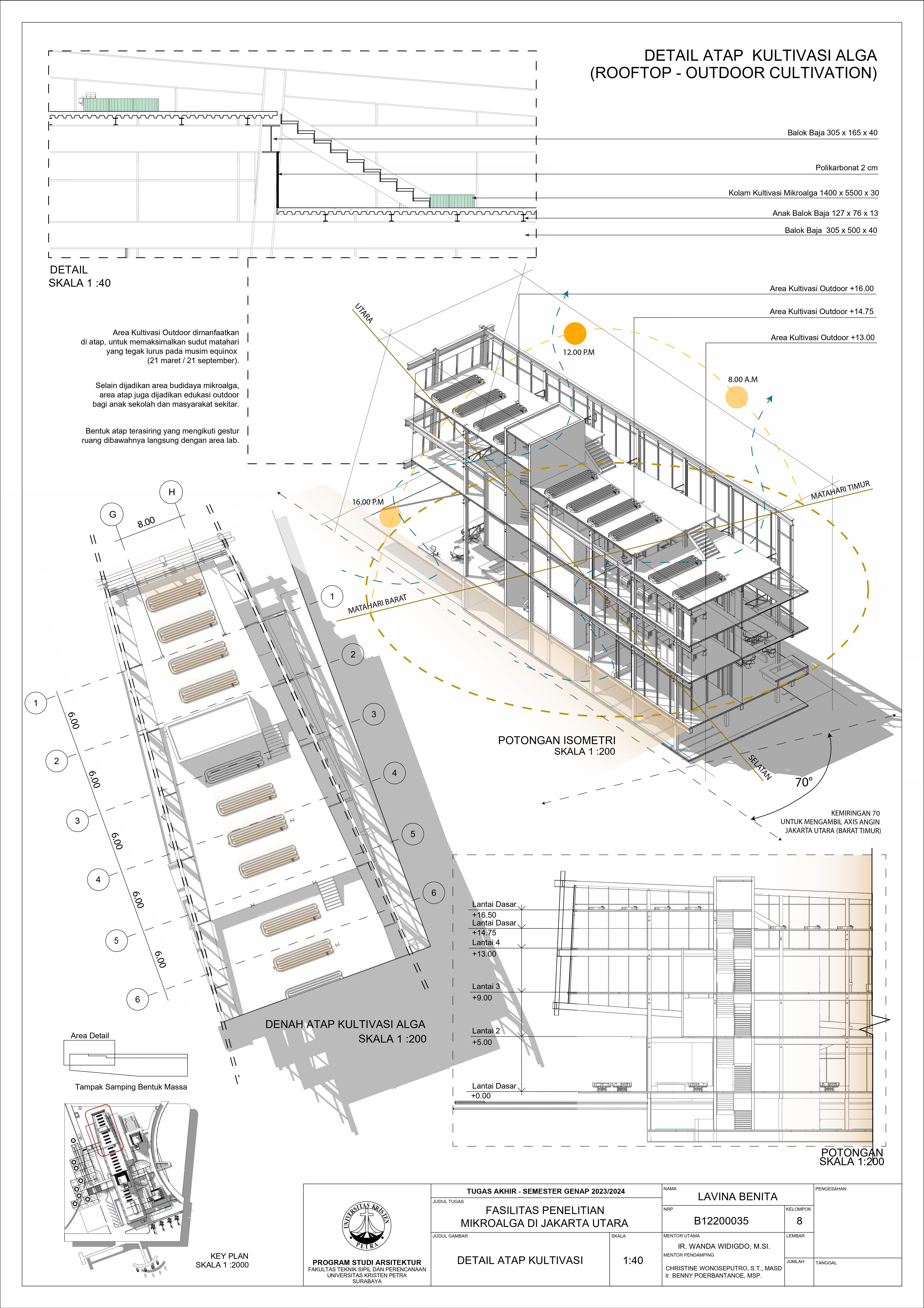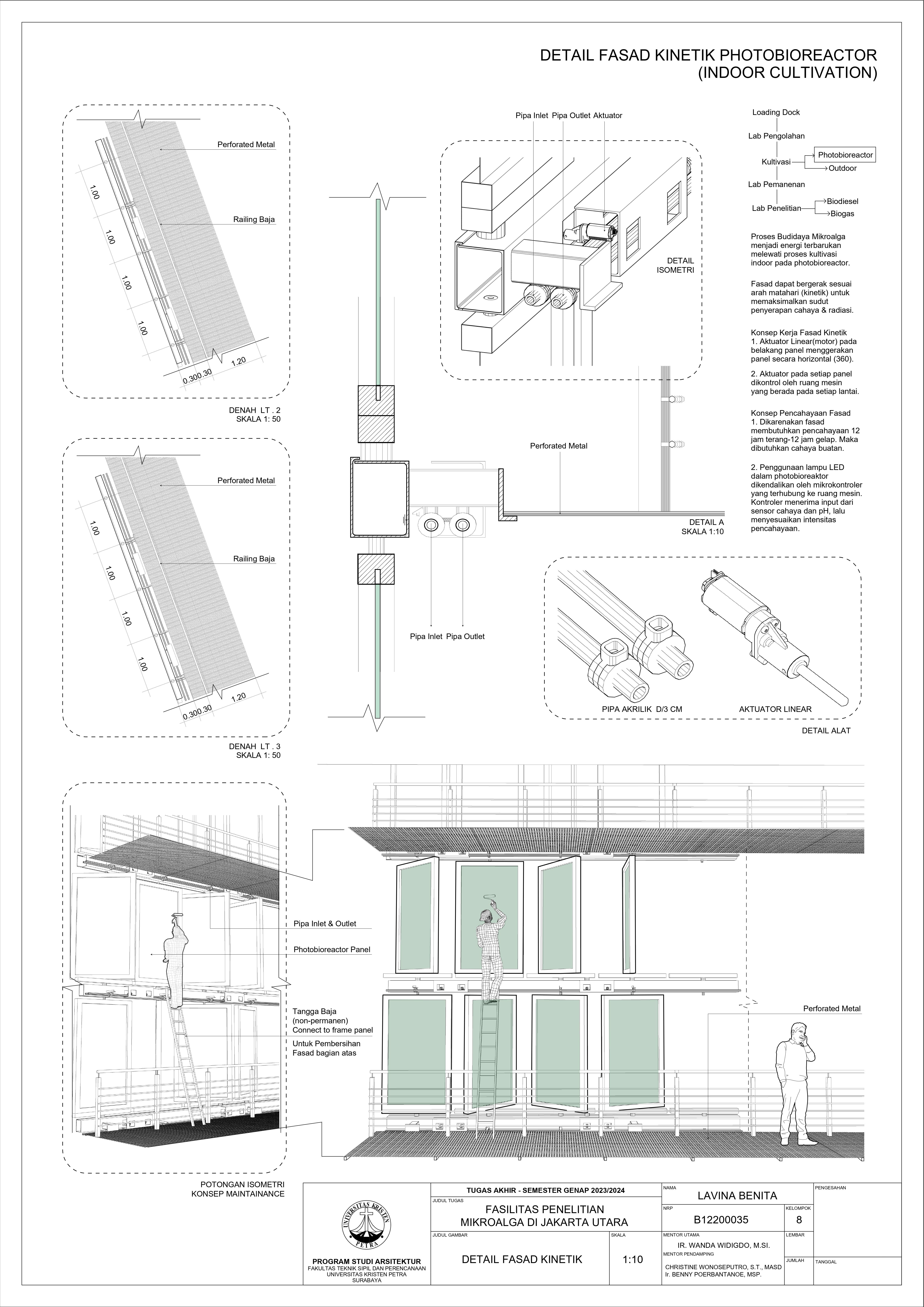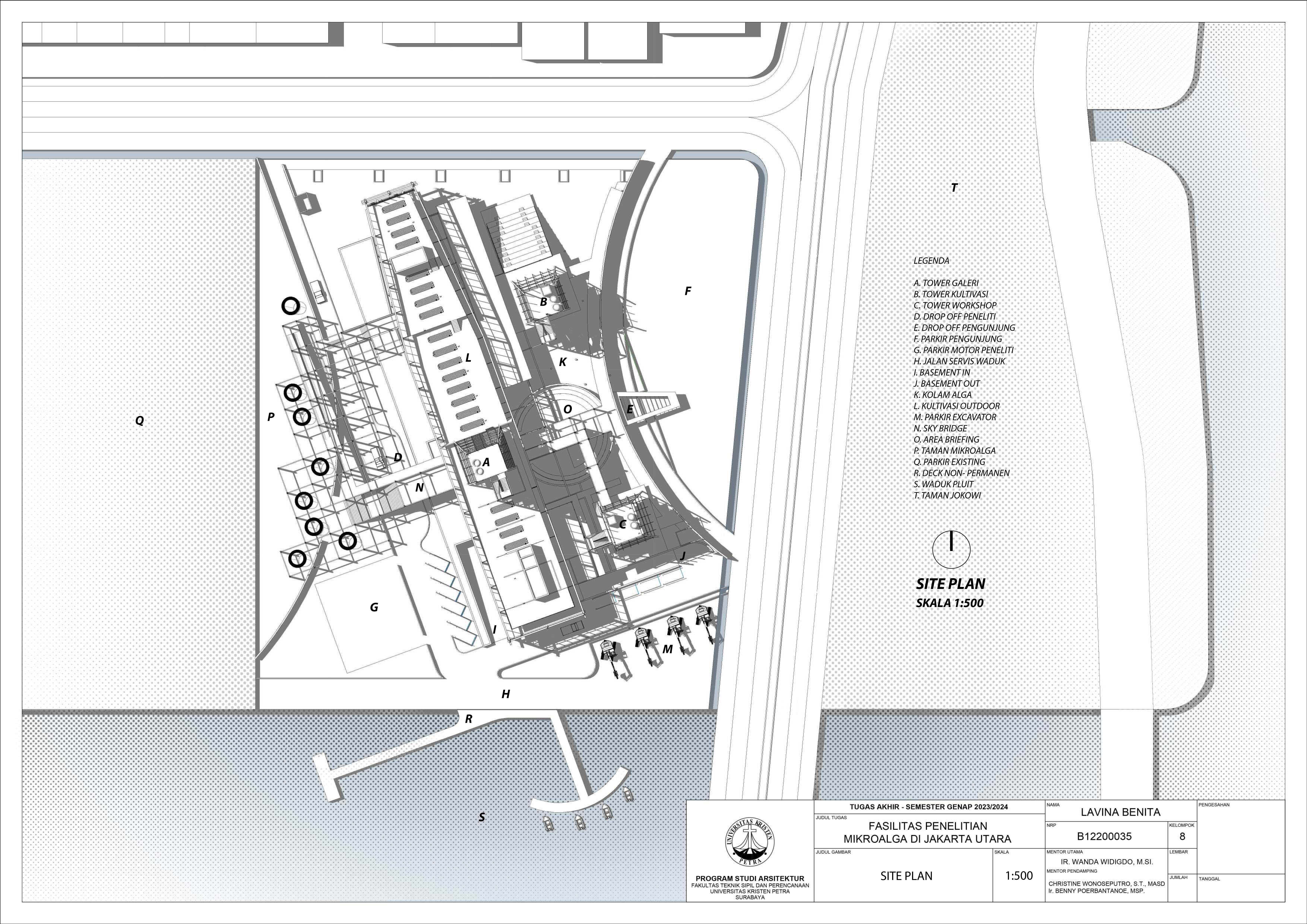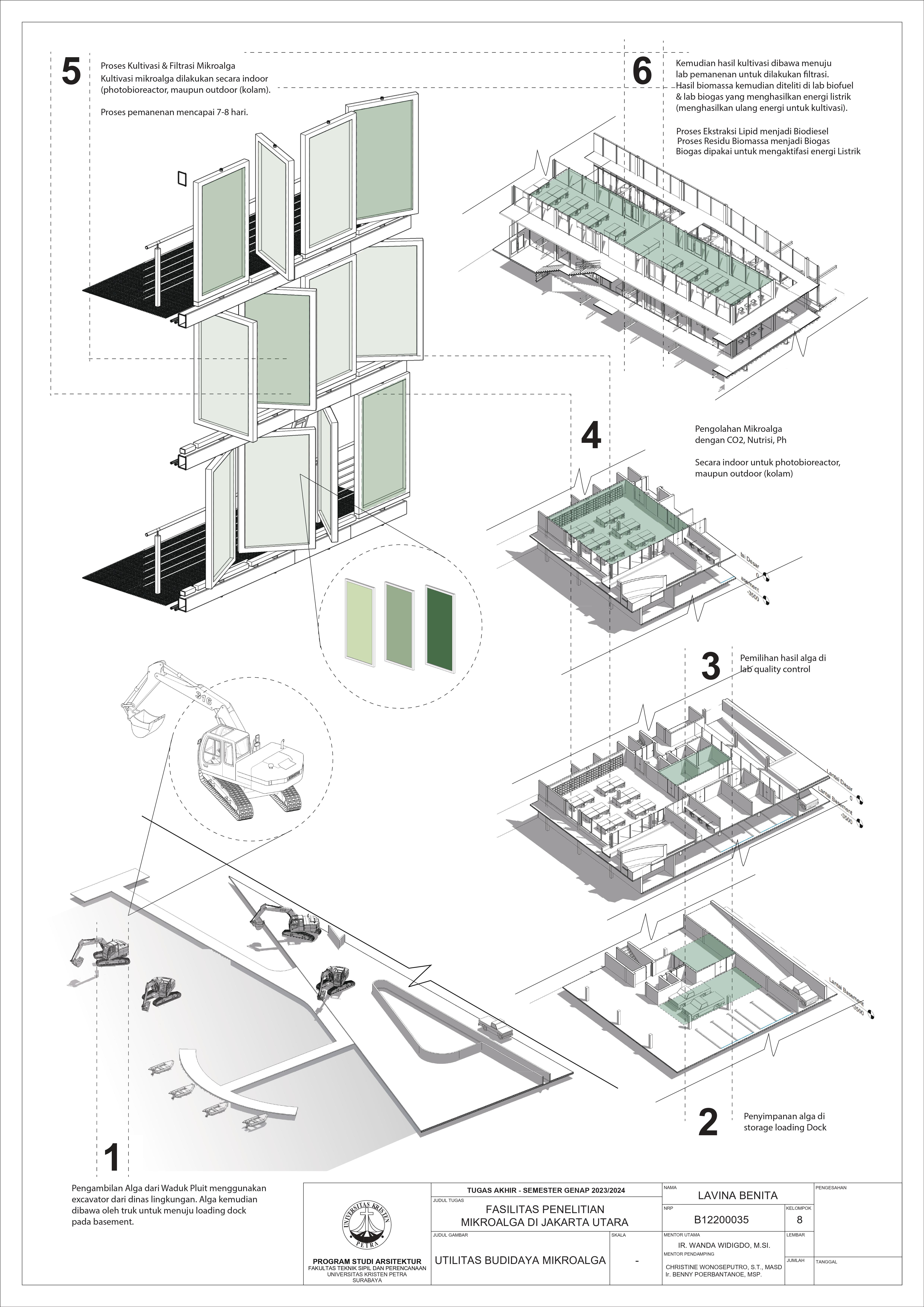 Desain Fasilitas Penelitian Mikroalga di Jakarta Utara dilatarbelakangi oleh masalah lingkungan di Jakarta. Mulai dari populasi penduduk yang terus meningkat, penggunaan energi tidak terbarukan, hingga Jakarta menempati Peringkat 4 polusi udara terburuk di dunia. Untuk mengatasi hal tersebut, pemerintah mulai mengembangkan penelitian bioteknologi dari mikroalga. Fasilitas Penelitian Mikroalga diusulkan berdiri di Jakarta Utara. Permasalahan desain utama dari fasilitas ini adalah bagaimana mewadahi sistem kultivasi mikroalga hingga menjadi energi terbarukan tanpa mengganggu lingkungan sekitar. Oleh karena itu dipilih pendekatan sistem dan pendalaman pencahayaan yang berfokus pada proses serta alur kultivasi mikroalga sebagai penyelesaian dari masalah desain. Hasil rancangan dari pendekatan dan pendalaman adalah desain yang mewadahi proses penelitian mikroalga menjadi energi terbarukan serta mengurangi pencemaran gas CO2 yang berhasil. Hasil dari desain juga meningkatkan kesadaran pengunjung akan kondisi lingkungan dan mendorong penggunaan energi terbarukan di Jakarta.