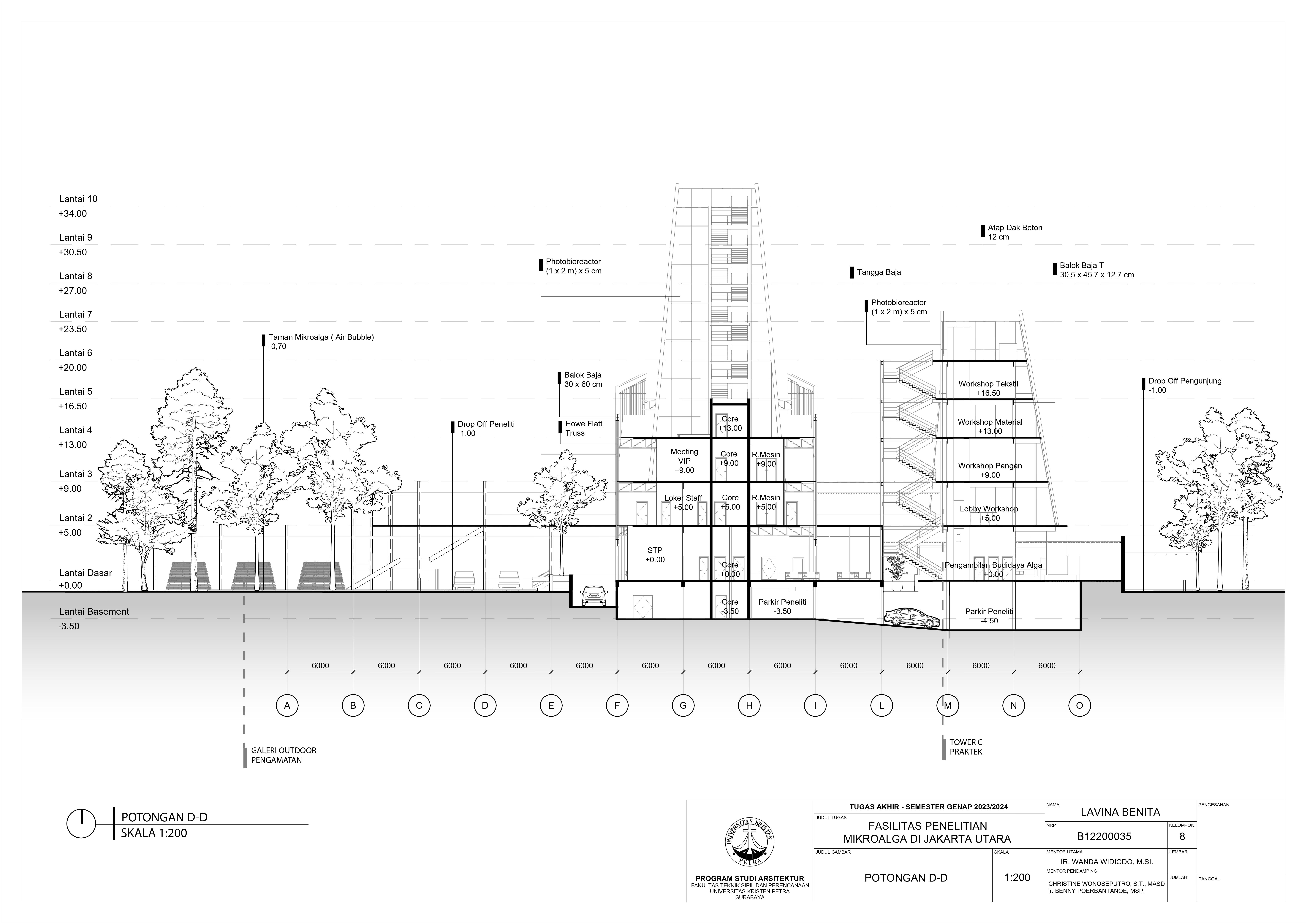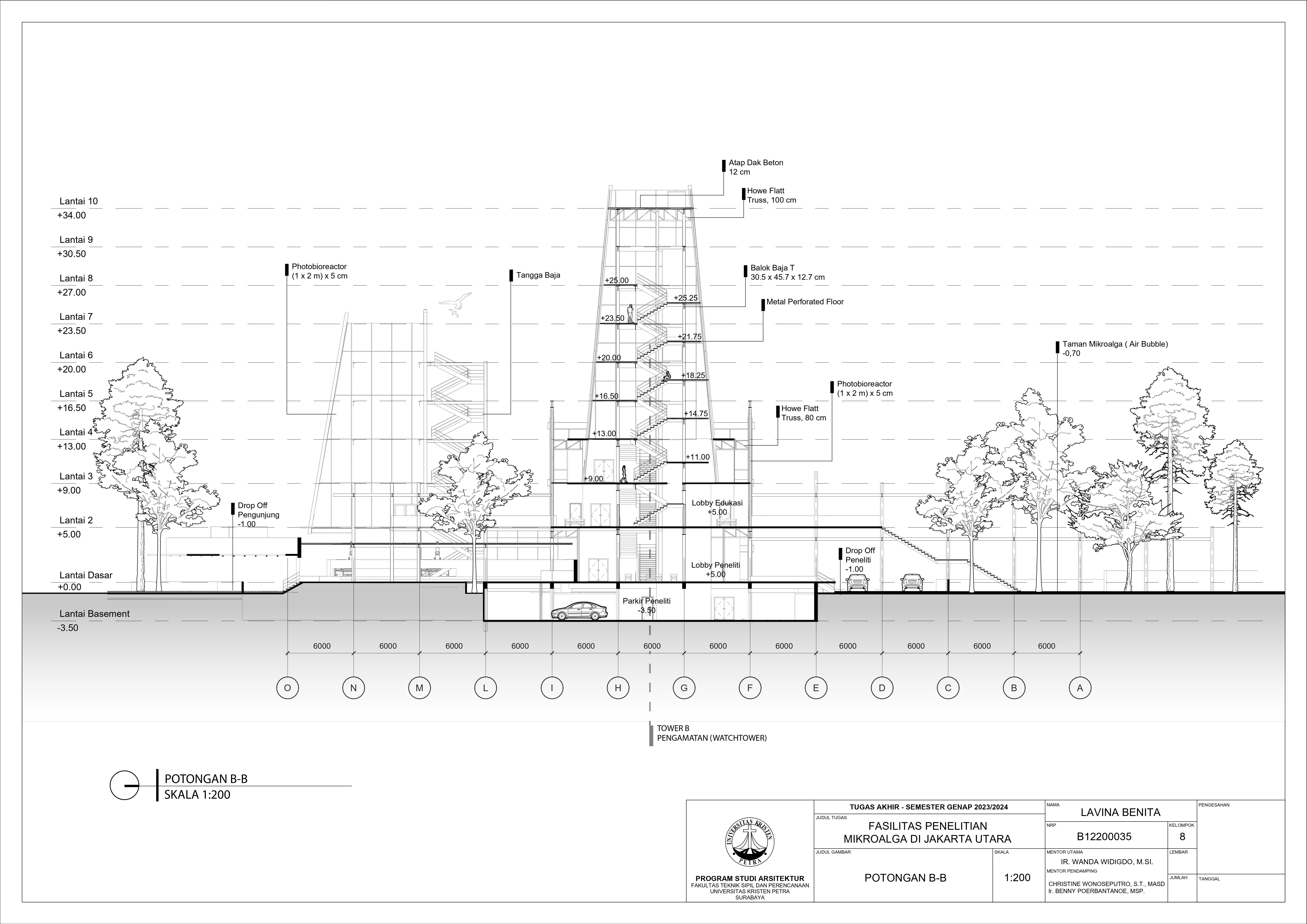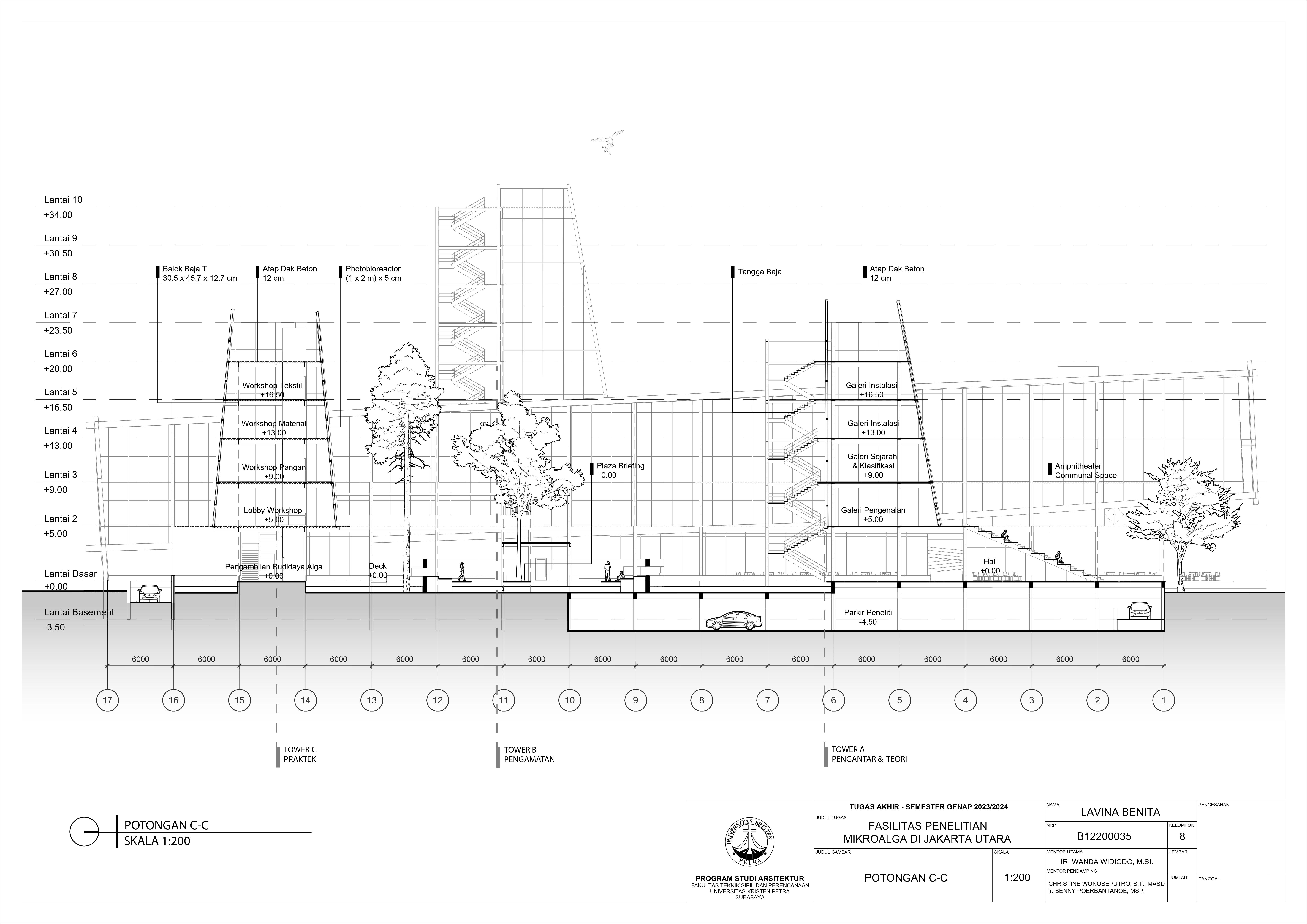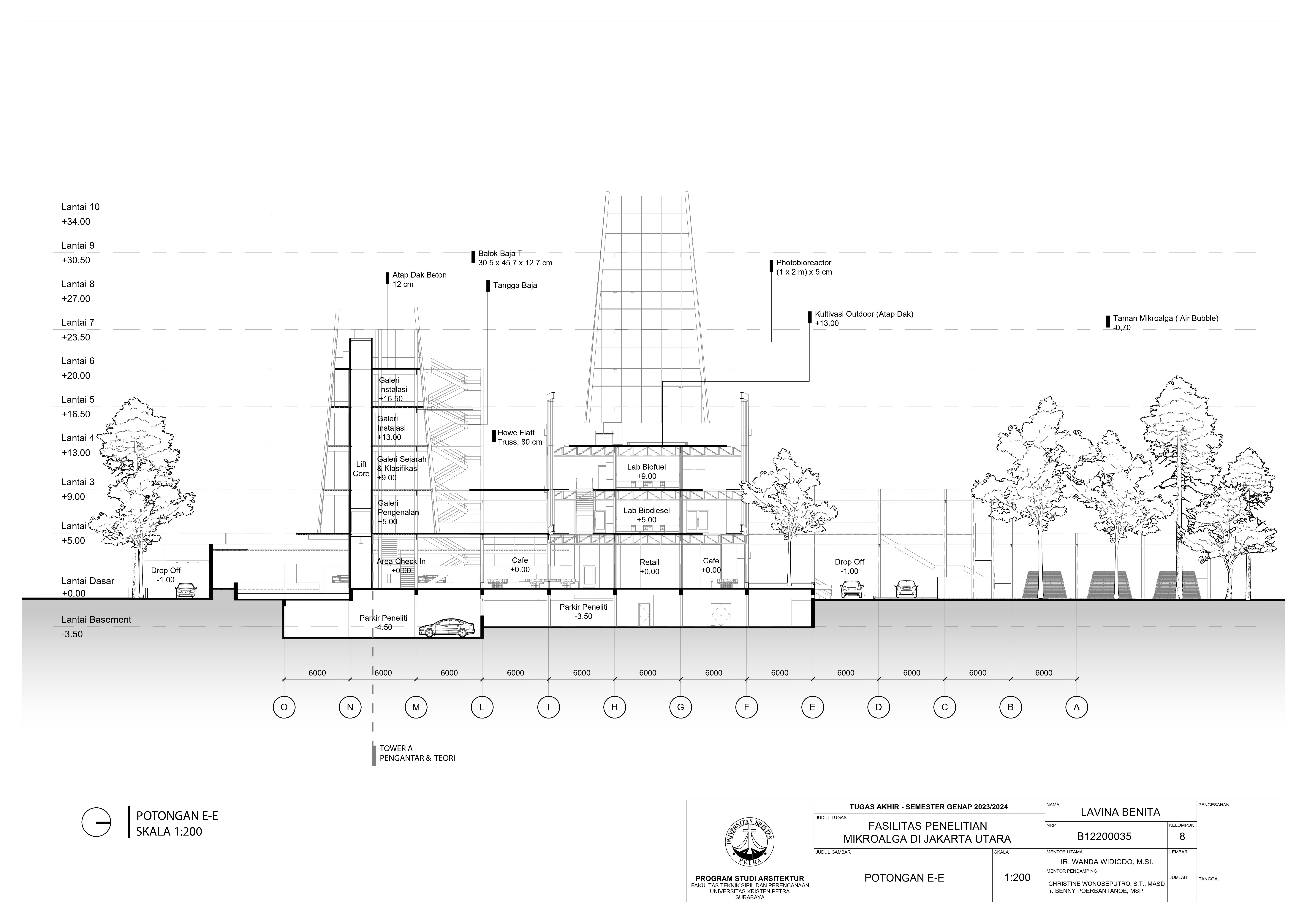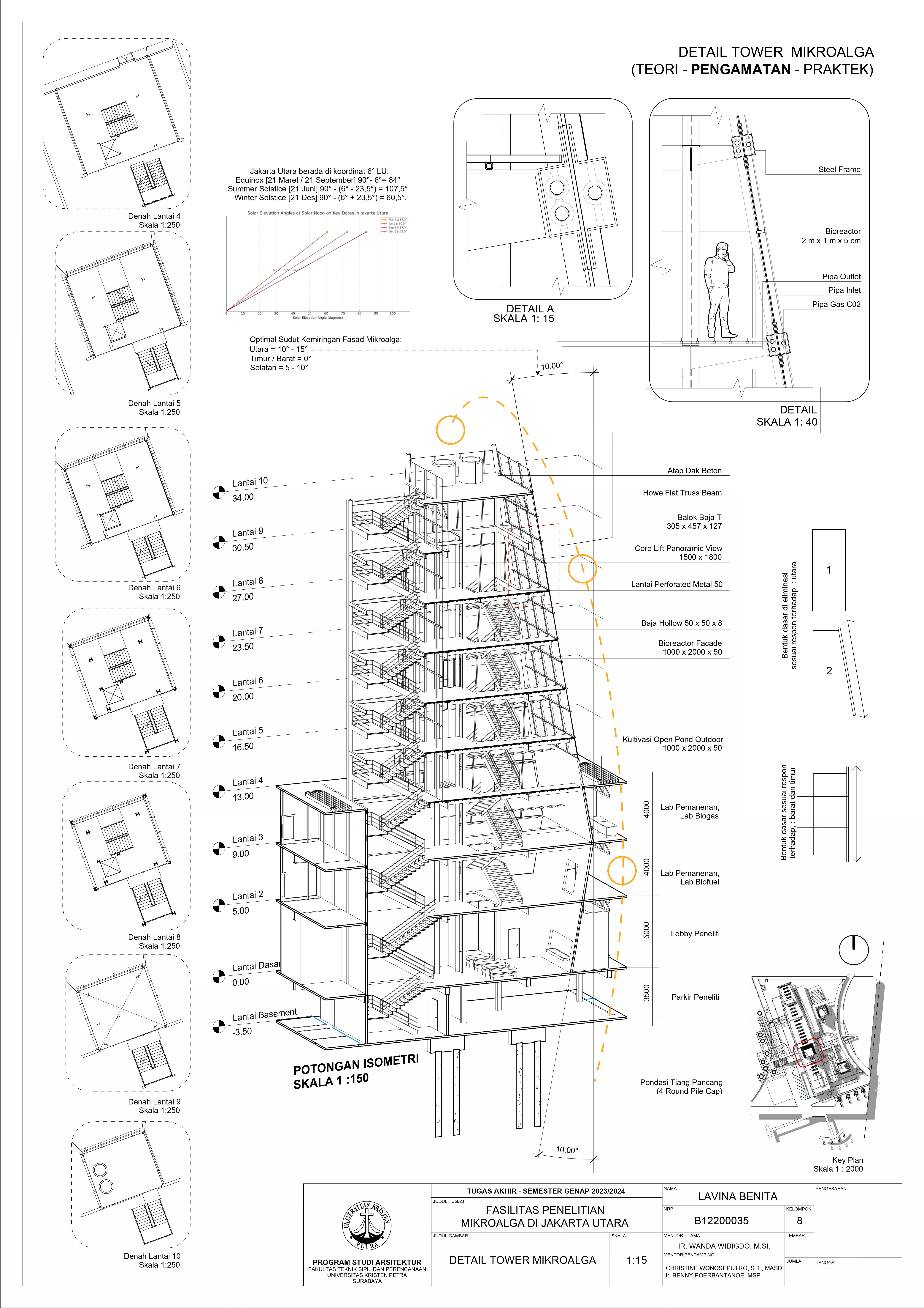 Desain Fasilitas Penelitian Mikroalga di Jakarta Utara dilatarbelakangi oleh masalah lingkungan di Jakarta. Mulai dari populasi penduduk yang terus meningkat, penggunaan energi tidak terbarukan, hingga Jakarta menempati Peringkat 4 polusi udara terburuk di dunia. Untuk mengatasi hal tersebut, pemerintah mulai mengembangkan penelitian bioteknologi dari mikroalga. Fasilitas Penelitian Mikroalga diusulkan berdiri di Jakarta Utara. Permasalahan desain utama dari fasilitas ini adalah bagaimana mewadahi sistem kultivasi mikroalga hingga menjadi energi terbarukan tanpa mengganggu lingkungan sekitar. Oleh karena itu dipilih pendekatan sistem dan pendalaman pencahayaan yang berfokus pada proses serta alur kultivasi mikroalga sebagai penyelesaian dari masalah desain. Hasil rancangan dari pendekatan dan pendalaman adalah desain yang mewadahi proses penelitian mikroalga menjadi energi terbarukan serta mengurangi pencemaran gas CO2 yang berhasil. Hasil dari desain juga meningkatkan kesadaran pengunjung akan kondisi lingkungan dan mendorong penggunaan energi terbarukan di Jakarta.