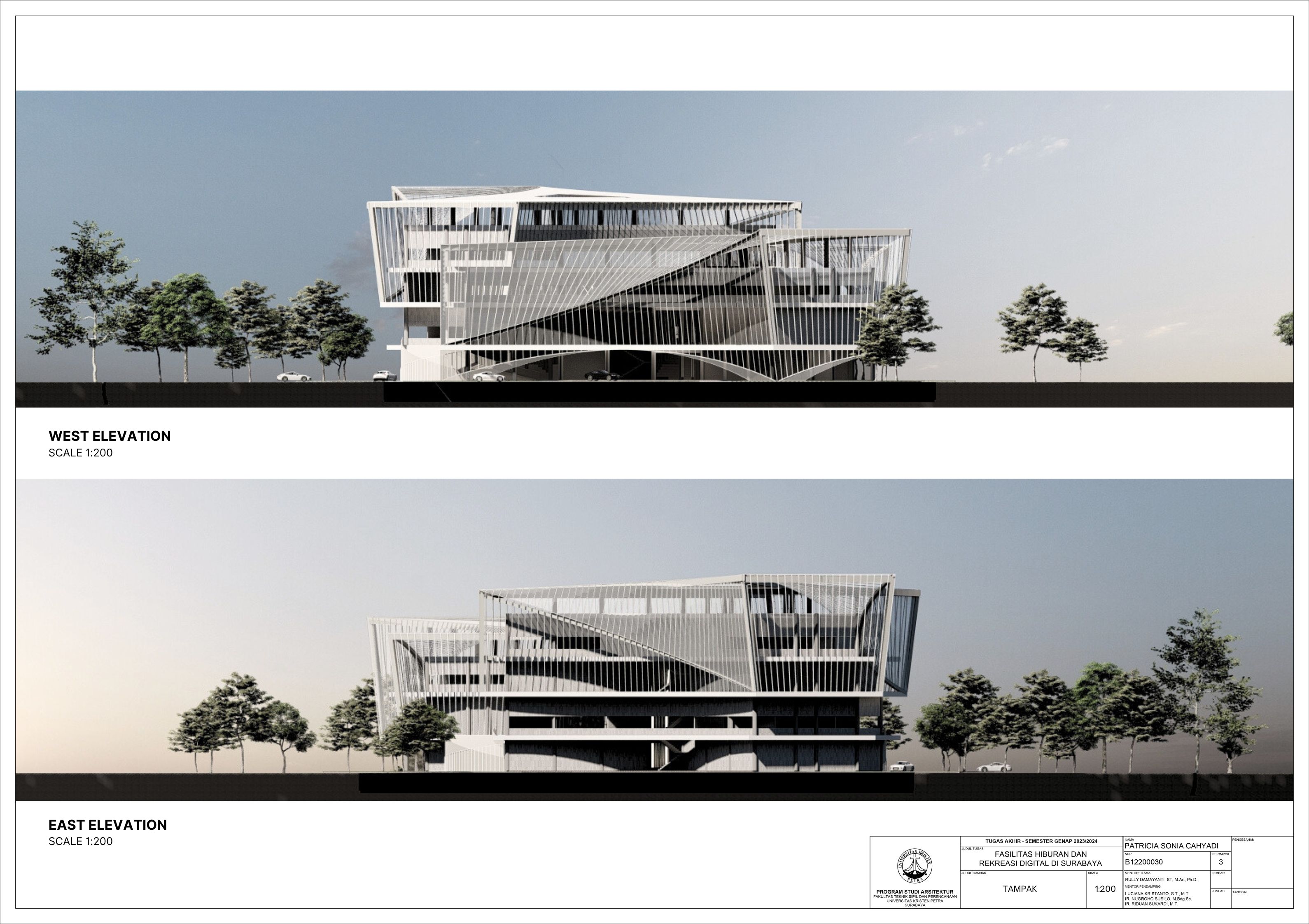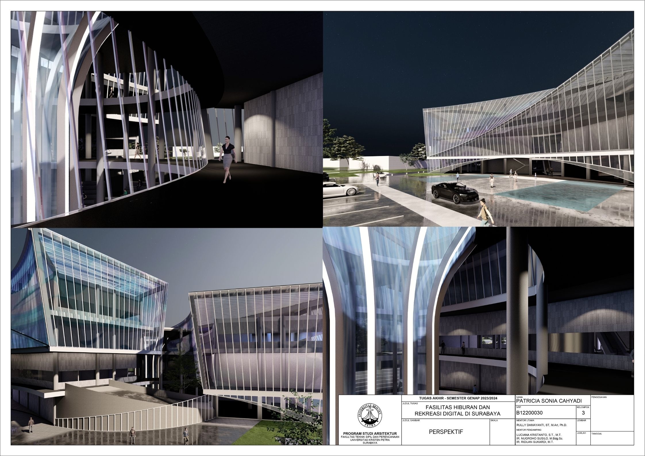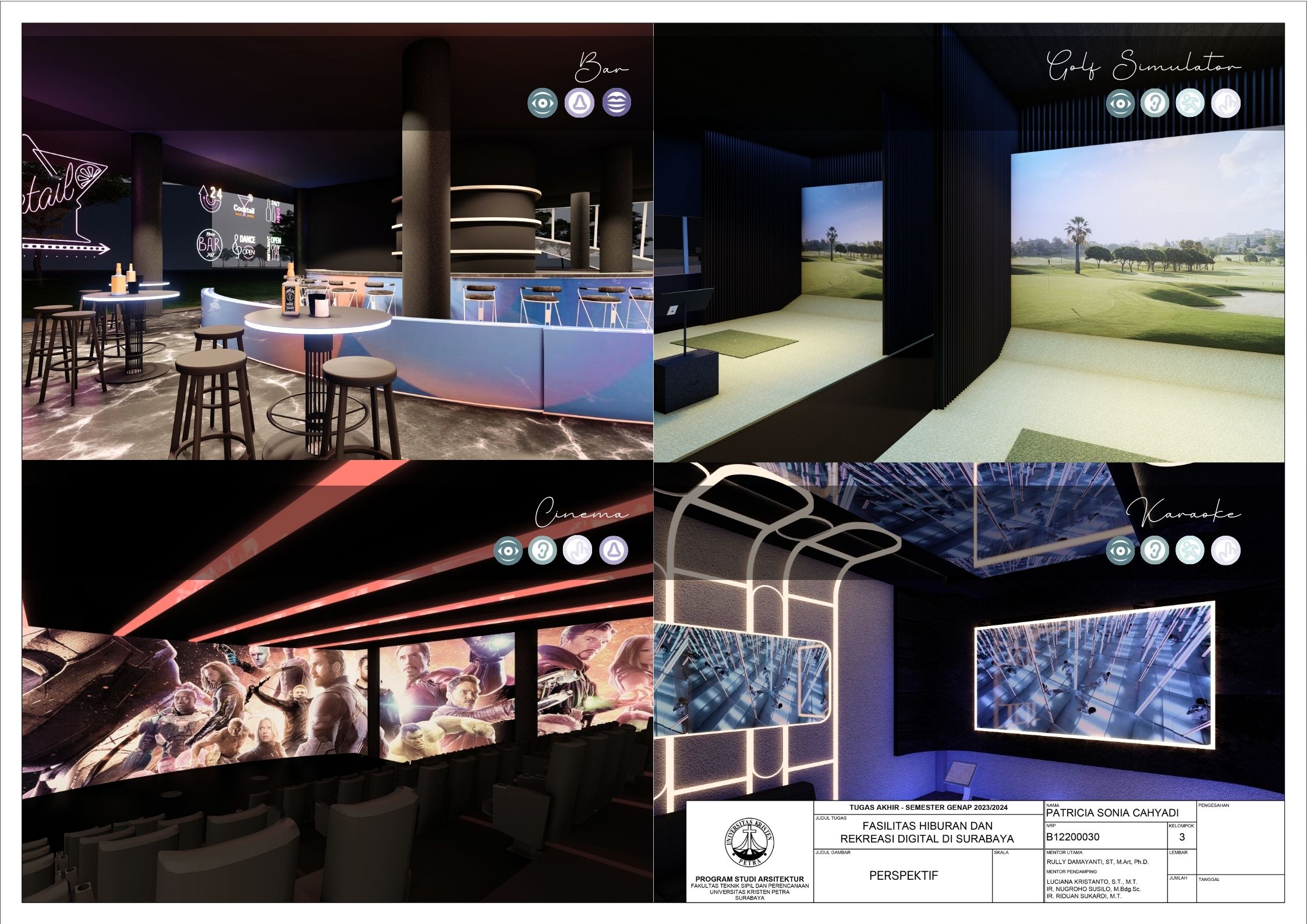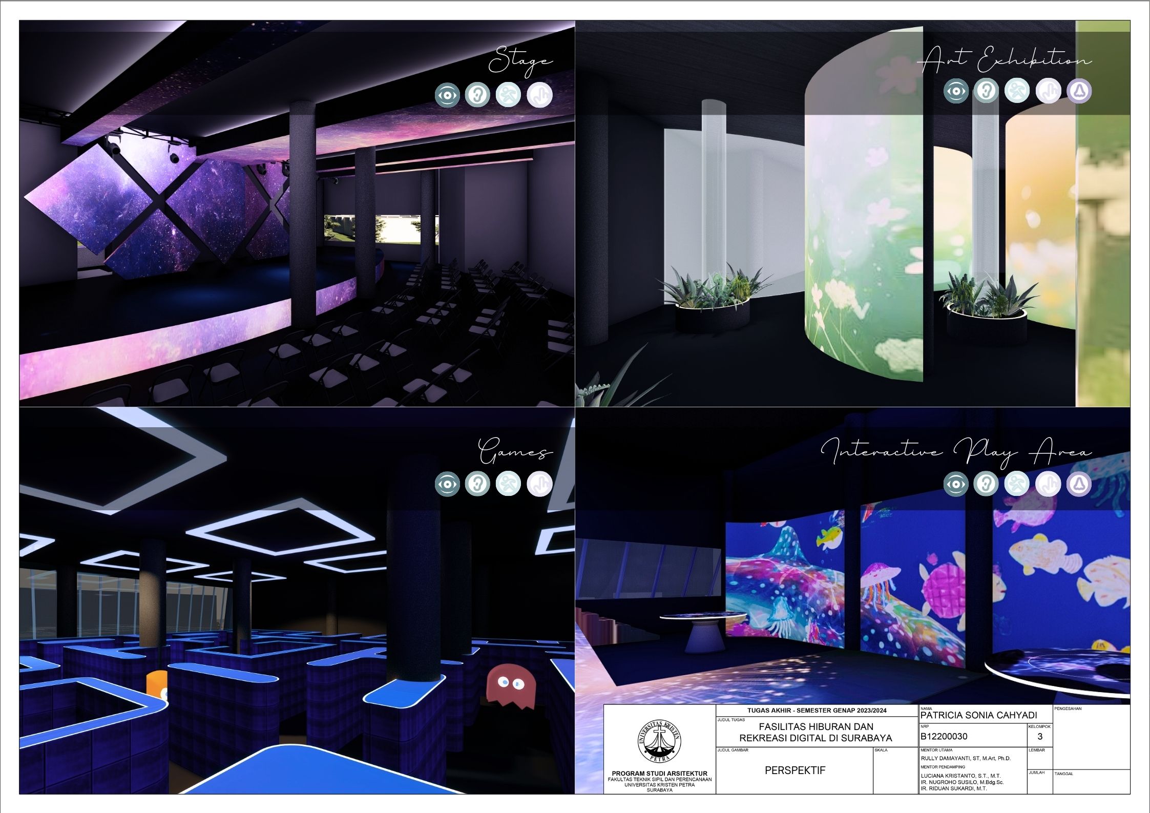 Surabaya merupakan kota dengan pertumbuhan penduduk yang tinggi namun menghadapi tingkat stres yang signifikan; sehingga membutuhkan tempat hiburan dan rekreasi positif dan aktif. Dalam menghadapi tuntutan ini, teknologi digital memainkan peran penting seiring dengan perkembangan zaman yang terus berlangsung. Tujuan dari laporan ini adalah mengusulkan desain arsitektur untuk fasilitas hiburan dan rekreasi digital di Surabaya dengan pendekatan multisensori. Pendekatan multisensori adalah pendekatan arsitektur berbasis pengalaman ruang yang memperhatikan keharmonisan berbagai indra (sensori). Metode perancangan yang dipakai melalui studi fungsional dan arsitektur pada bangunan preseden, dan sintesa hasil analisis tapak, konsep desain, dan program ruang. Konsep desain bangunan ini adalah sensory scape, yang bertujuan untuk menciptakan pengalaman multisensori yang mendalam bagi para pengunjung. Desain bangunan memberikan kesempatan pada setiap pengunjung untuk menikmati momen pemulihan dan kesenangan yang akan menyegarkan pikiran dan tubuh. Fasilitas terbagi menjadi tujuh zona utama yaitu makanan, film, olahraga, musik, pertunjukan, permaian, dan seni. Setiap zona dirancang dengan memanfaatkan teknologi digital secara optimal, sehingga dapat memberikan pengalaman interaktif dan menarik bagi masyarakat. Hasil rancangan yang menekankan pada pengolahan ruang publik dengan memanfaatkan teknologi digital ini diharapkan dapat memberikan usulan desain untuk menurunkan tingkat stres para pelajar dan pekerja di kota Surabaya.