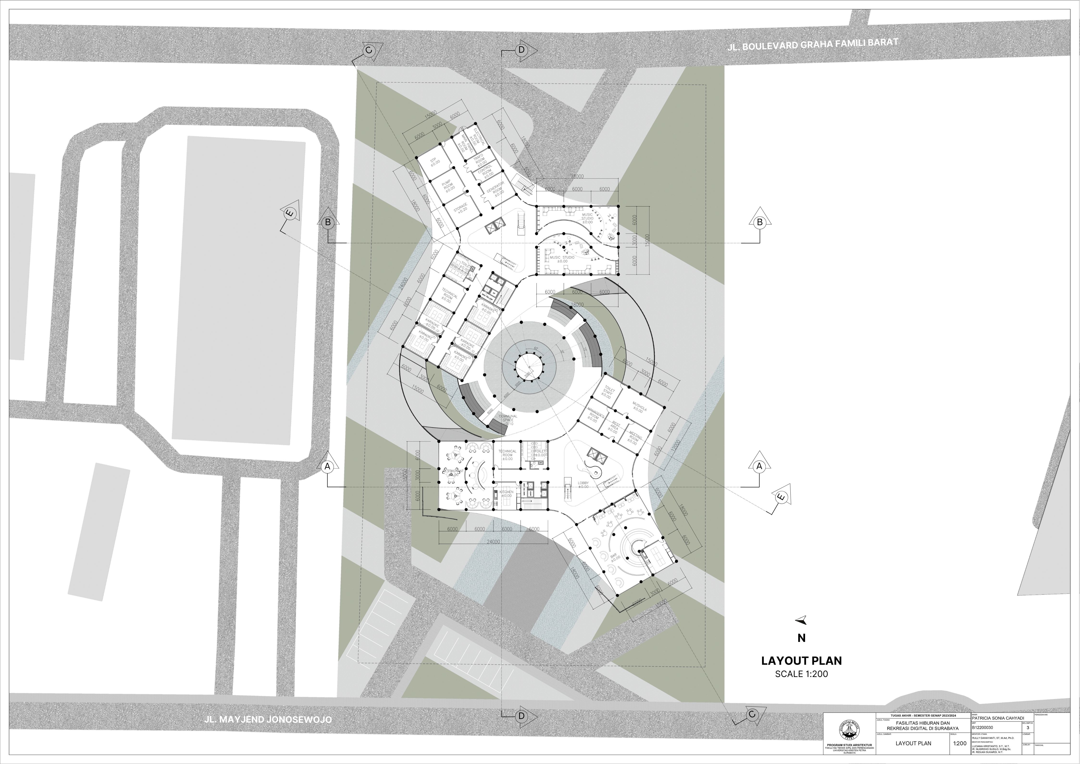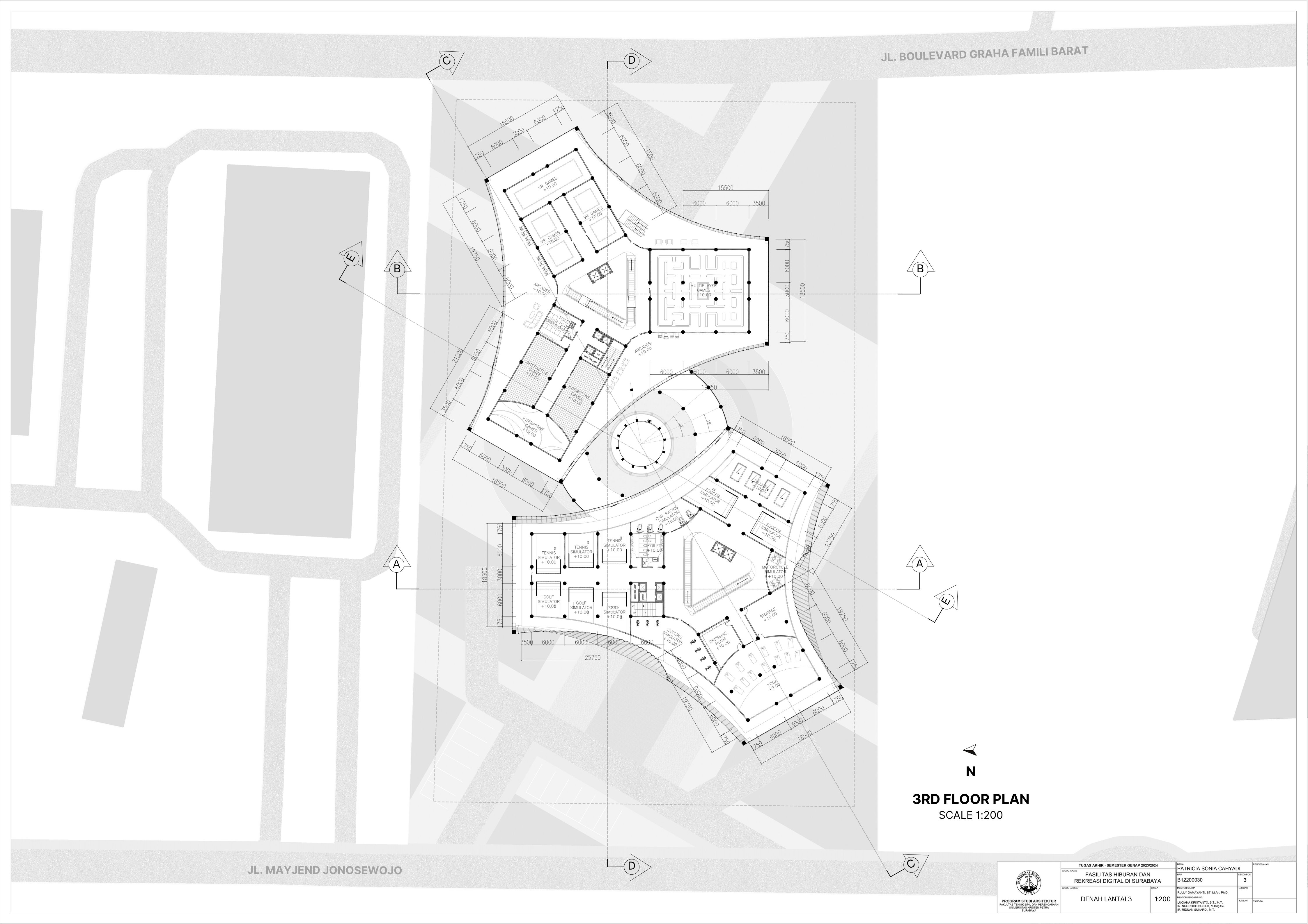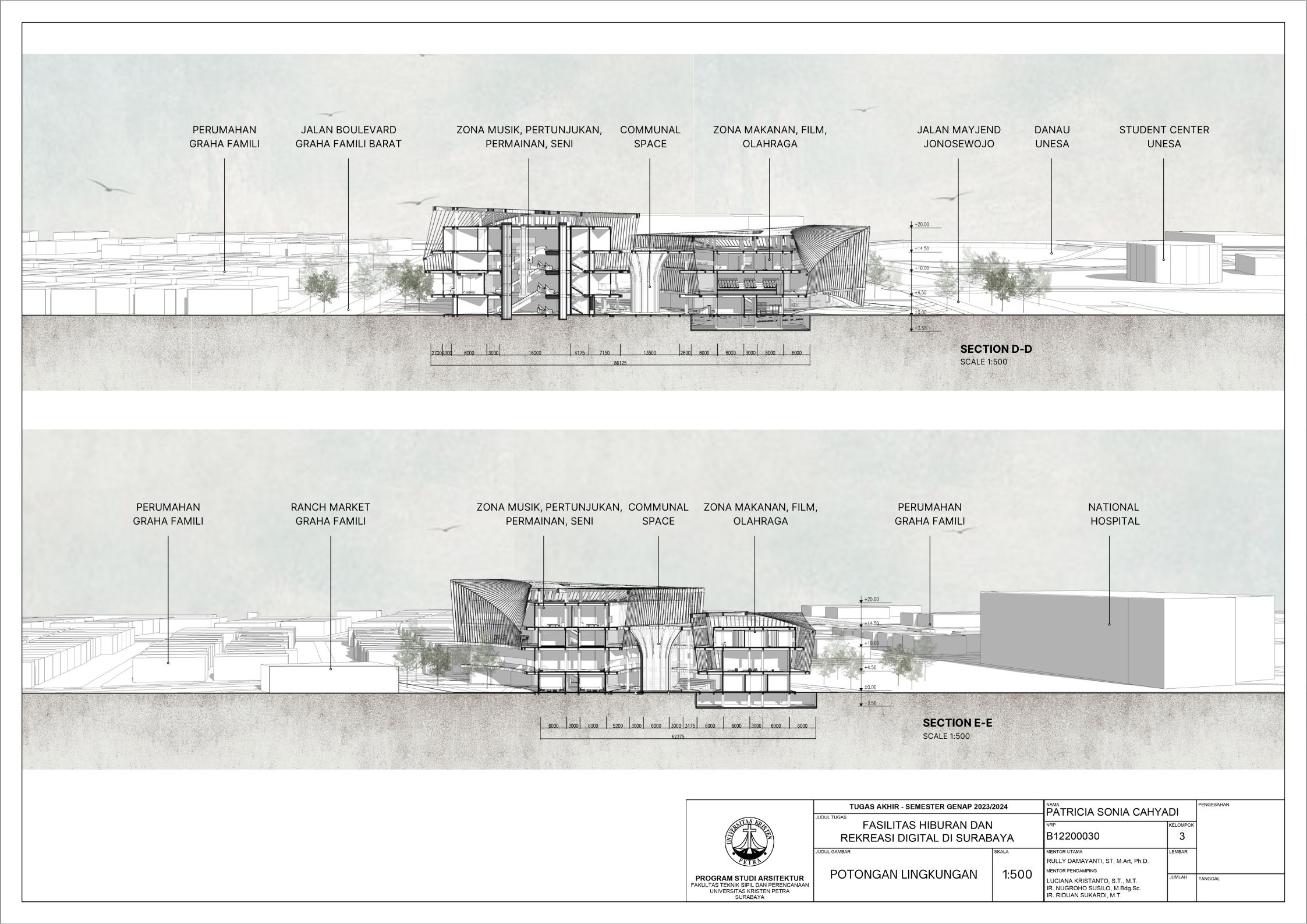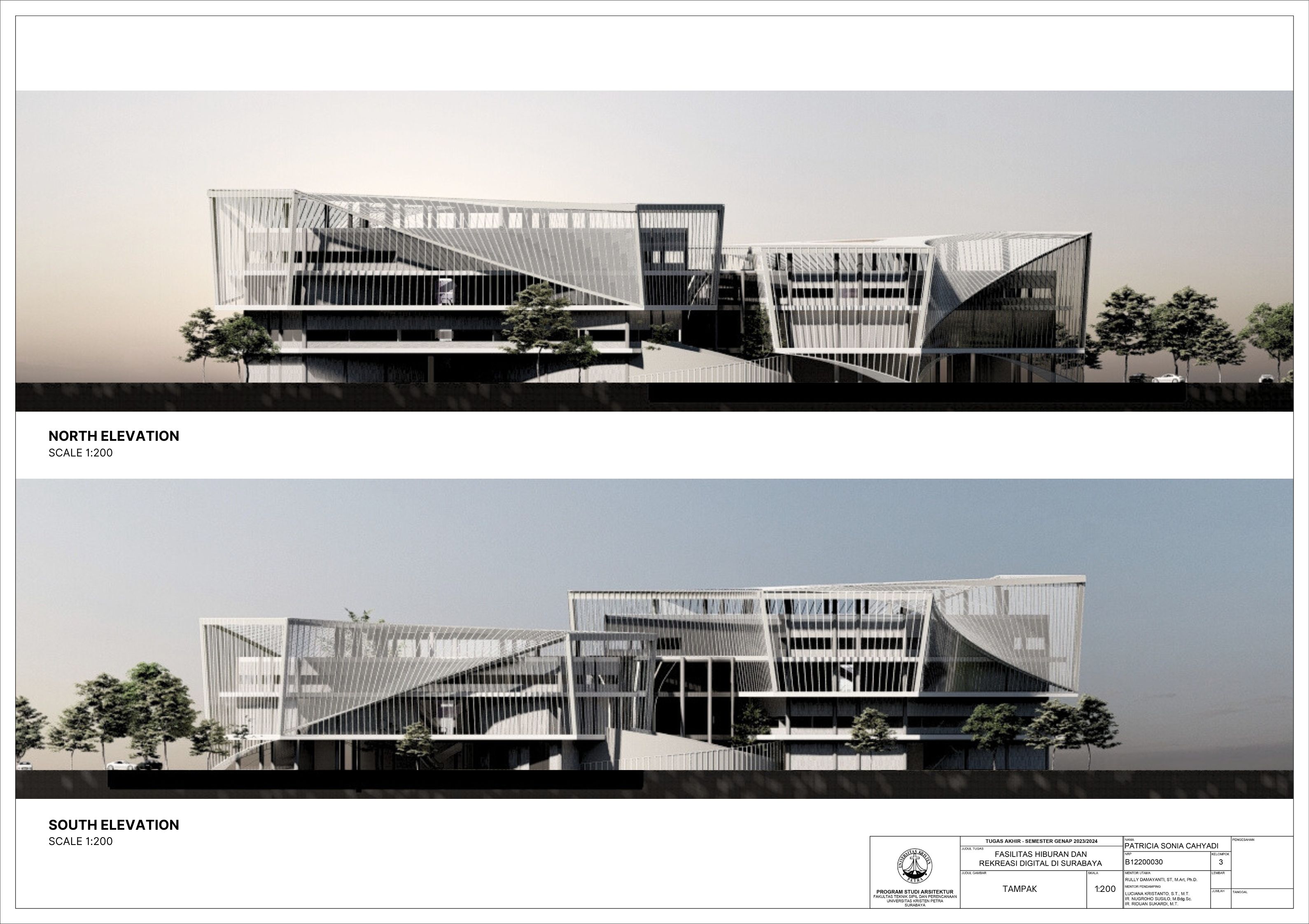 Surabaya merupakan kota dengan pertumbuhan penduduk yang tinggi namun menghadapi tingkat stres yang signifikan; sehingga membutuhkan tempat hiburan dan rekreasi positif dan aktif. Dalam menghadapi tuntutan ini, teknologi digital memainkan peran penting seiring dengan perkembangan zaman yang terus berlangsung. Tujuan dari laporan ini adalah mengusulkan desain arsitektur untuk fasilitas hiburan dan rekreasi digital di Surabaya dengan pendekatan multisensori. Pendekatan multisensori adalah pendekatan arsitektur berbasis pengalaman ruang yang memperhatikan keharmonisan berbagai indra (sensori). Metode perancangan yang dipakai melalui studi fungsional dan arsitektur pada bangunan preseden, dan sintesa hasil analisis tapak, konsep desain, dan program ruang. Konsep desain bangunan ini adalah sensory scape, yang bertujuan untuk menciptakan pengalaman multisensori yang mendalam bagi para pengunjung. Desain bangunan memberikan kesempatan pada setiap pengunjung untuk menikmati momen pemulihan dan kesenangan yang akan menyegarkan pikiran dan tubuh. Fasilitas terbagi menjadi tujuh zona utama yaitu makanan, film, olahraga, musik, pertunjukan, permaian, dan seni. Setiap zona dirancang dengan memanfaatkan teknologi digital secara optimal, sehingga dapat memberikan pengalaman interaktif dan menarik bagi masyarakat. Hasil rancangan yang menekankan pada pengolahan ruang publik dengan memanfaatkan teknologi digital ini diharapkan dapat memberikan usulan desain untuk menurunkan tingkat stres para pelajar dan pekerja di kota Surabaya.