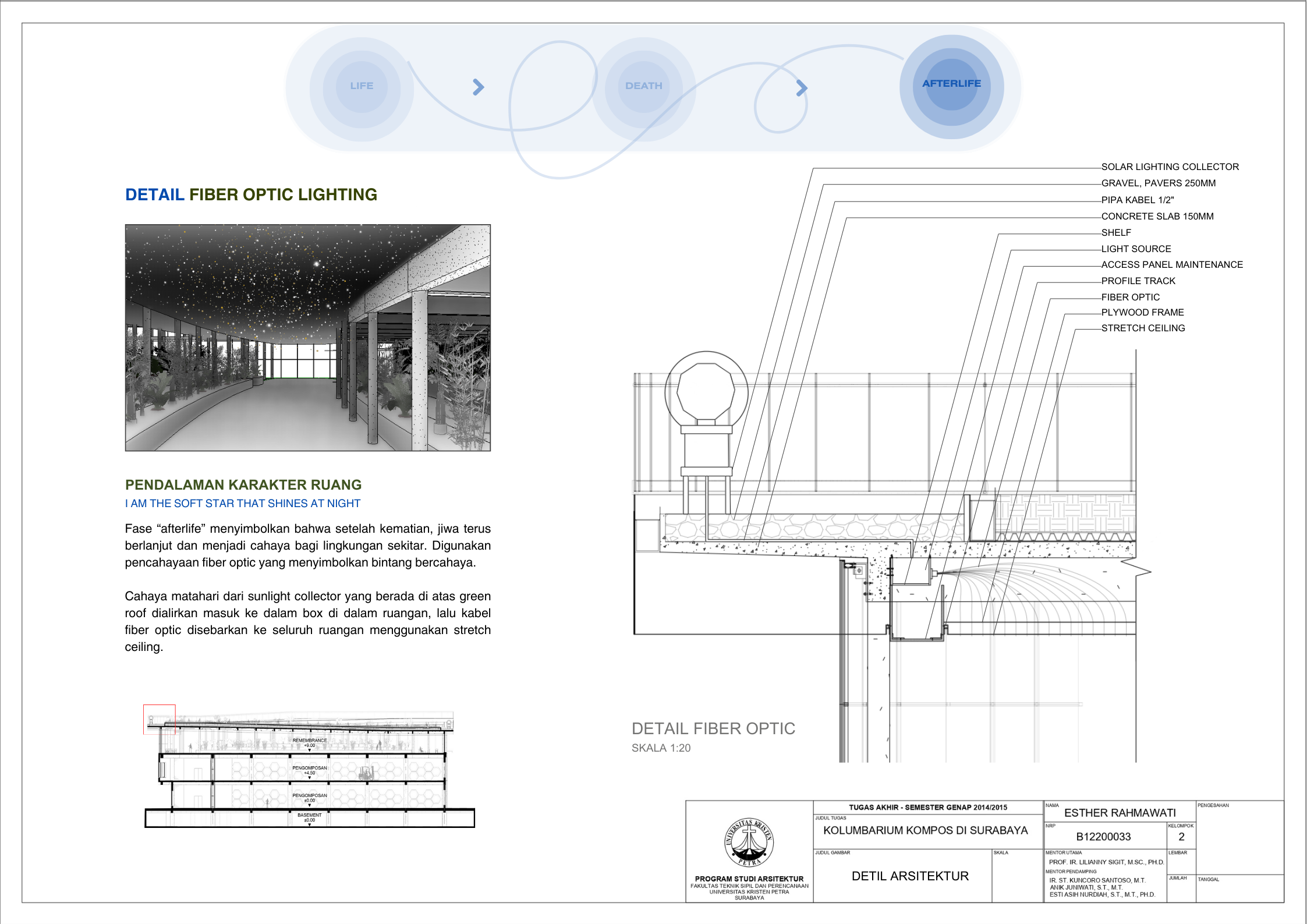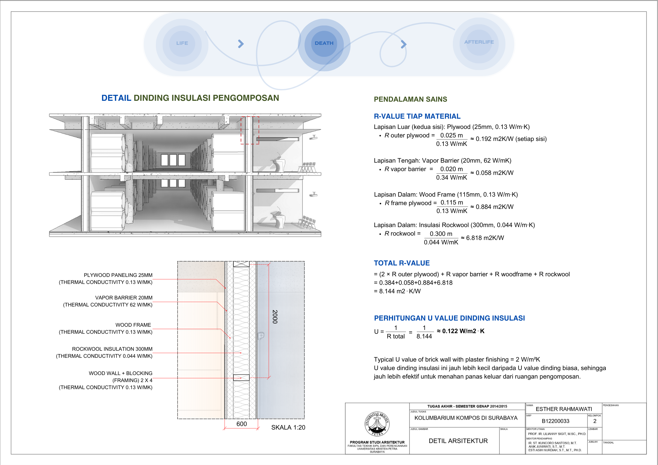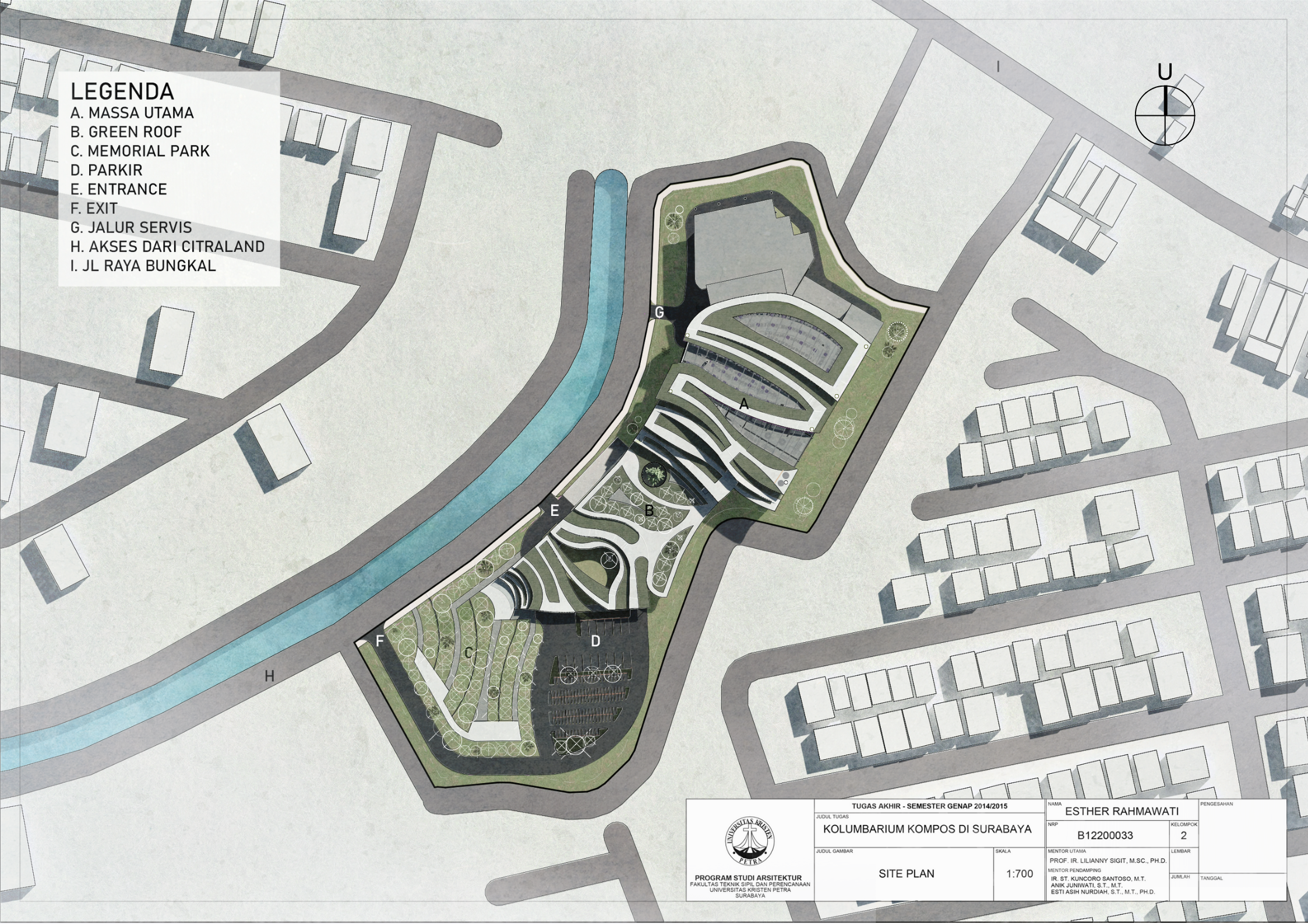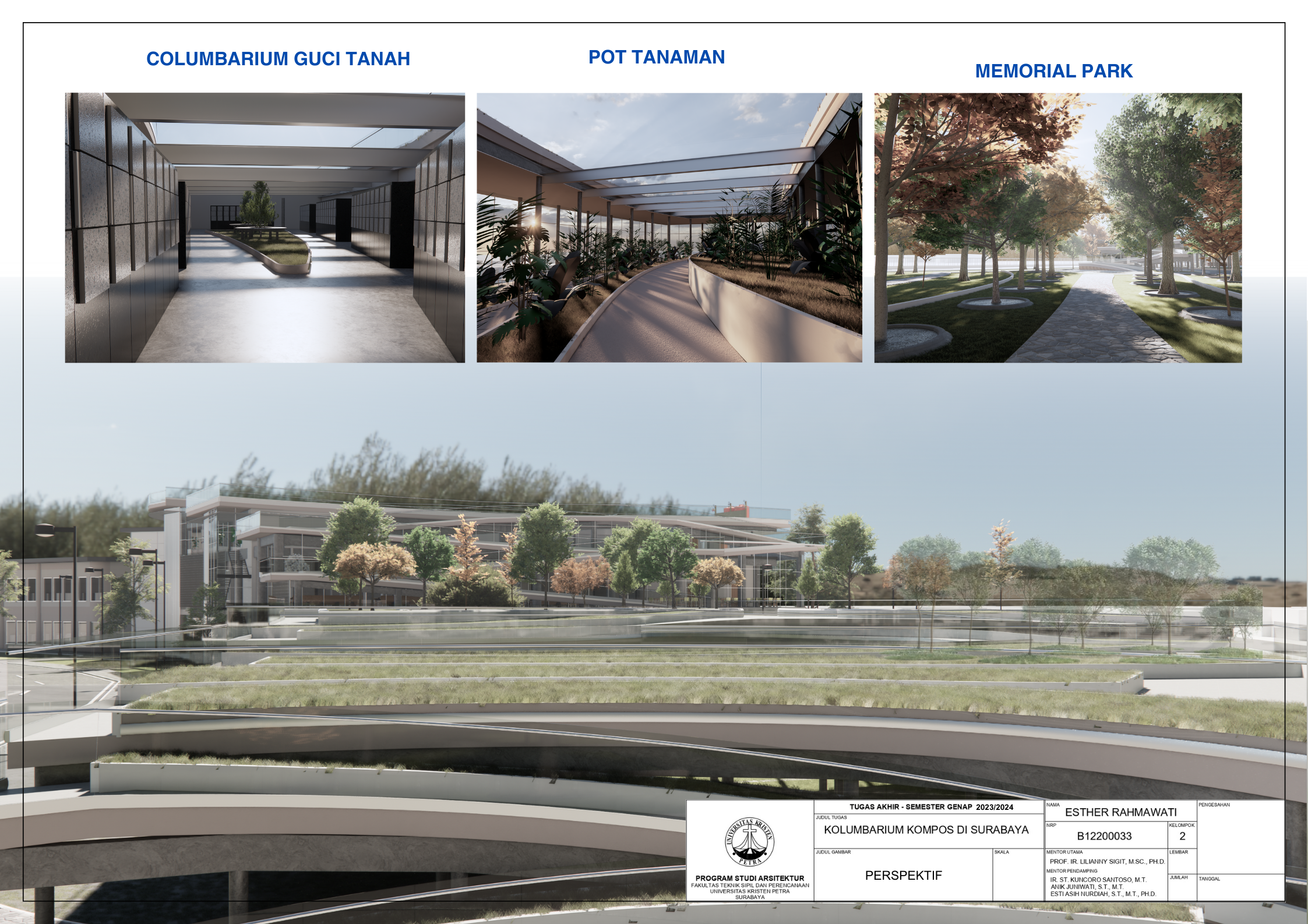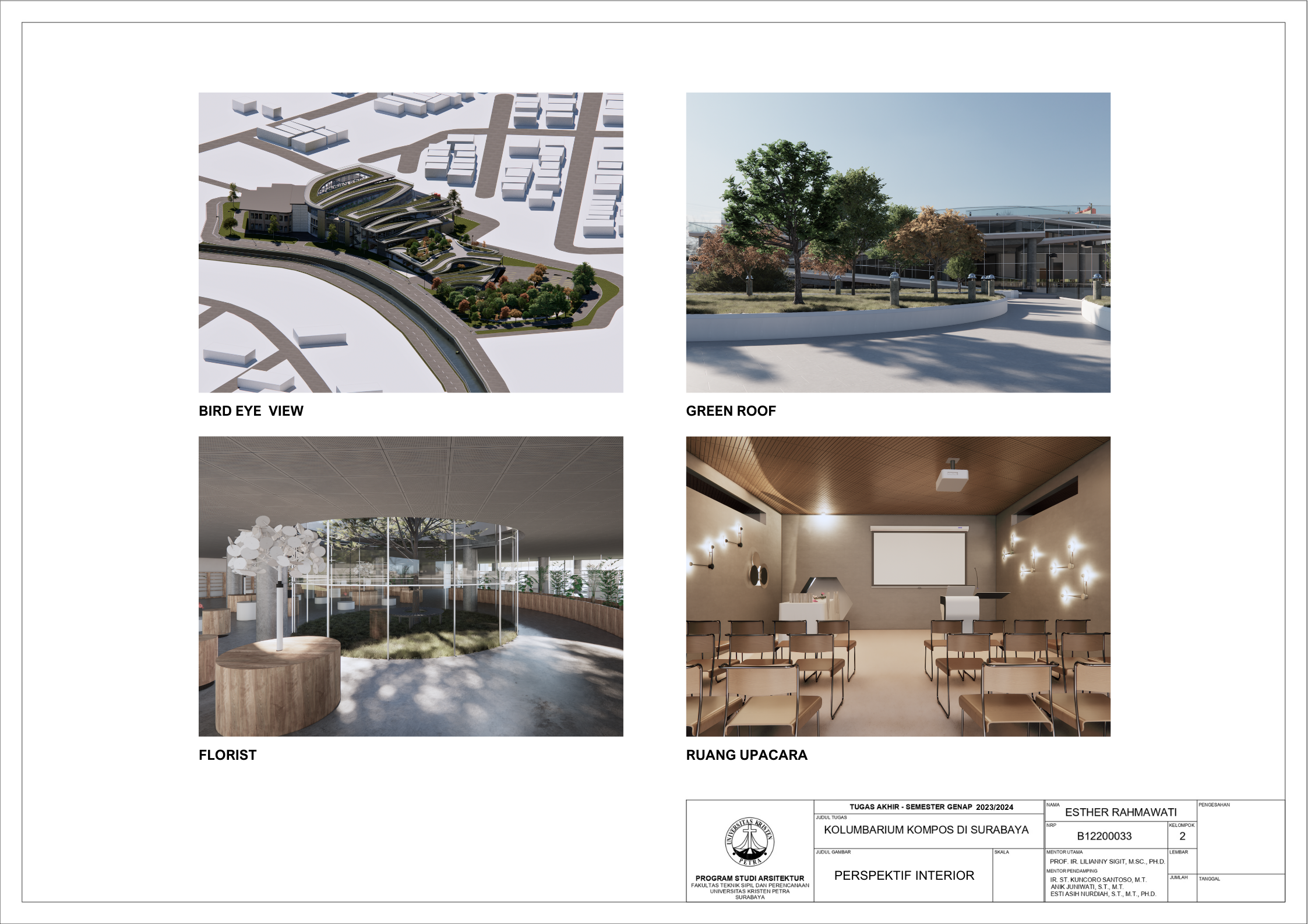Kebutuhan akan pemakaman adalah hal yang mutlak, tetapi seiring berjalannya waktu, jumlah lahan untuk pemakaman di Surabaya semakin minim. Hal ini mengarah kepada pemakaman vertikal, tetapi mausoleum memiliki resiko kebocoran cairan tubuh yang tinggi. Alternatif kremasi sering menjadi pilihan, tetapi menghasilkan jutaan emisi karbon setiap tahunnya. Pengomposan manusia merupakan alternatif baru yang lebih ramah lingkungan dibandingkan dengan kremasi atau penguburan di tanah, membantu menurunkan output karbon sebesar 1,2 juta metrik ton dari proses tradisional. Perancangan kolumbarium kompos ditujukan untuk memfasilitasi kebutuhan pemakaman vertikal yang aman sekaligus ramah lingkungan. Kolumbarium kompos ini memiliki 2 fungsi utama, yaitu fasilitas pengomposan manusia dan fasilitas peringatan. Fasilitas peringatan yang berupa tanah kompos dan tanaman diharapkan dapat membantu mengurangi polusi kota Surabaya sekaligus mengurangi stigma negatif mengenai pemakaman. Perasaan baik ketika pengguna melakukan ziarah adalah aspek yang penting dalam desain bangunan ini. Sains bangunan seperti pencahayaan, suhu, dan kelembaban juga perlu diperhatikan untuk memastikan tanaman dapat tumbuh dengan sehat. Dari aspek-aspek tersebut, digunakan pendekatan sains dan pendekatan simbolik secara intangible dengan dimana kematian adalah awal, bukanlah akhir.