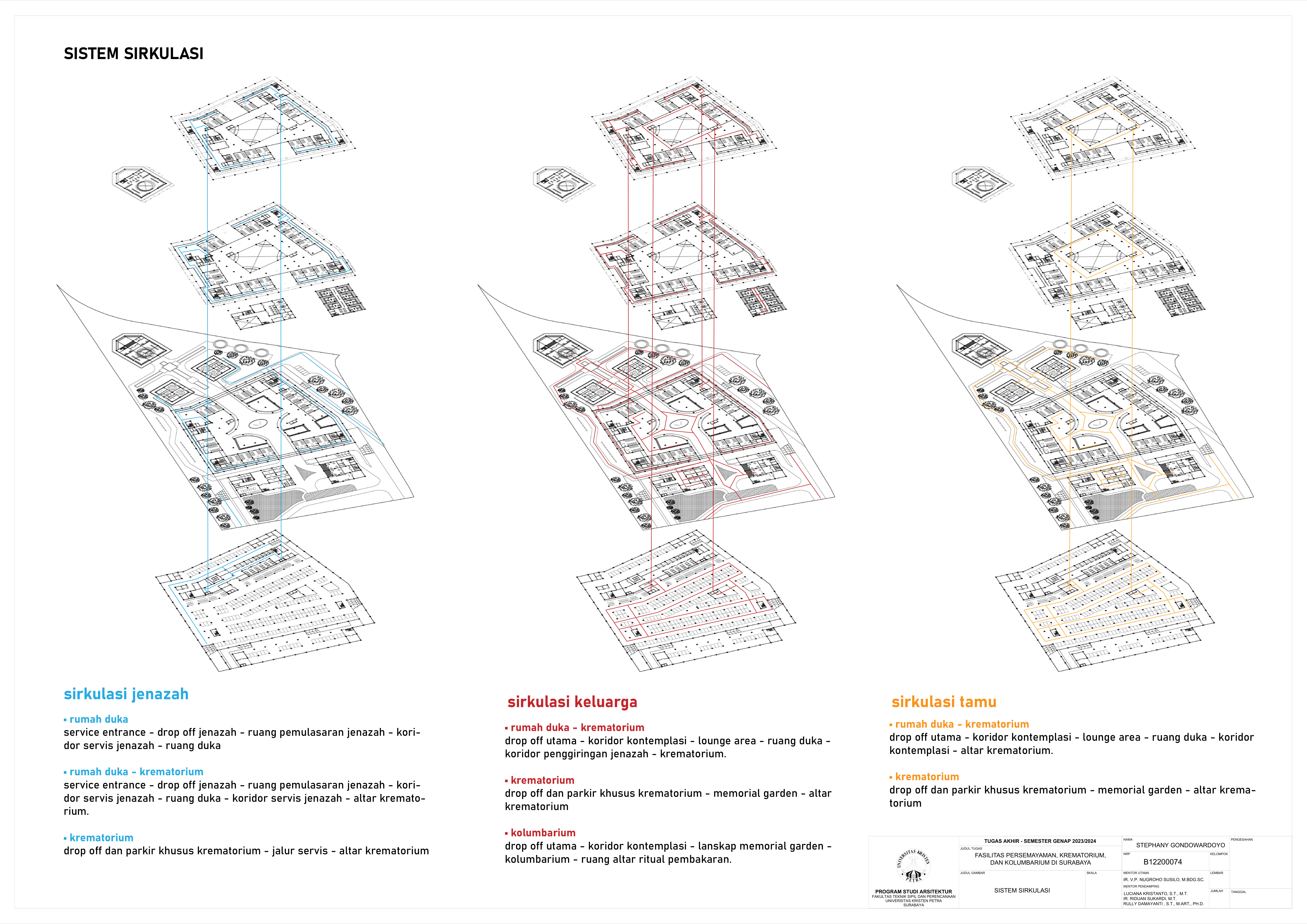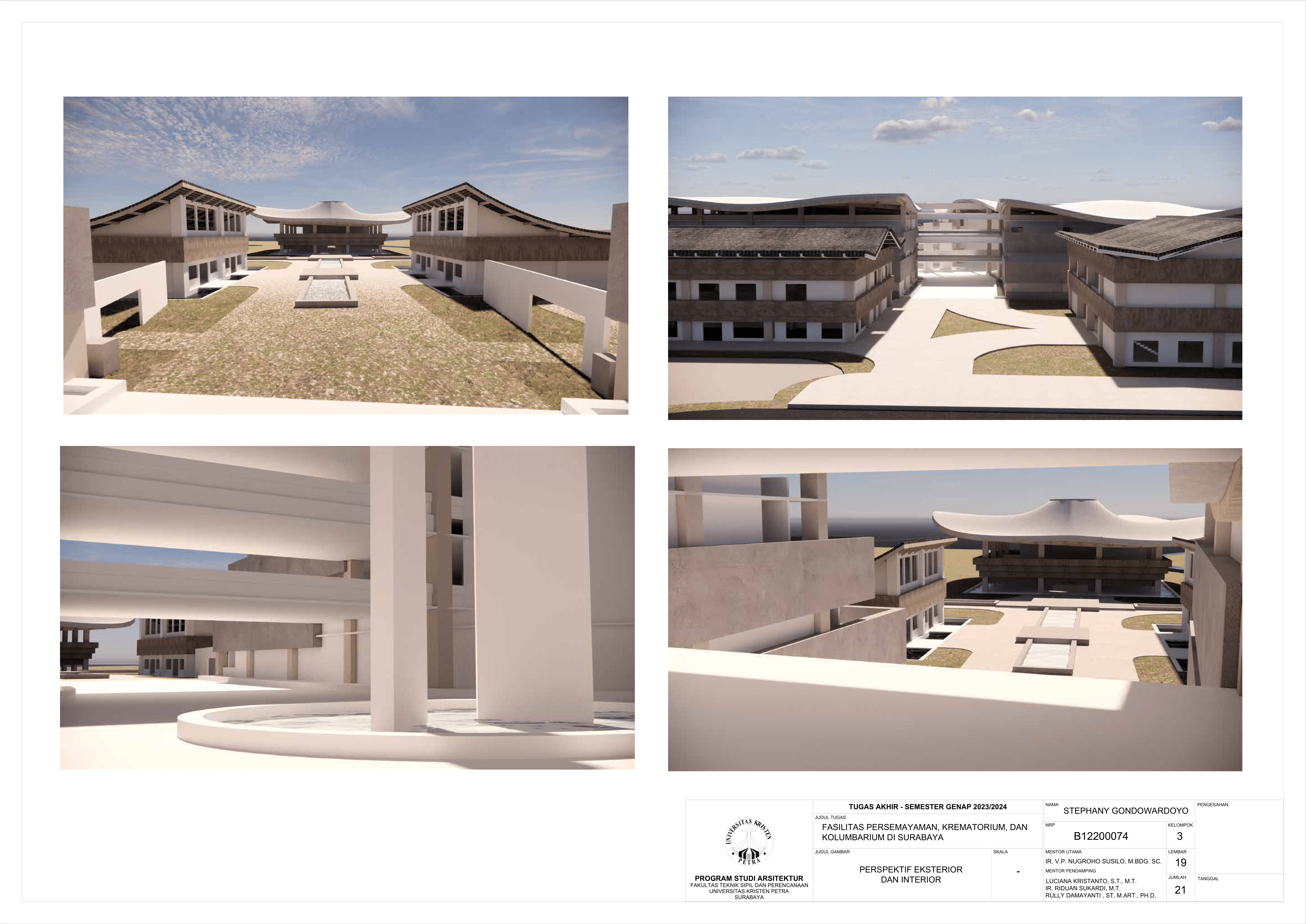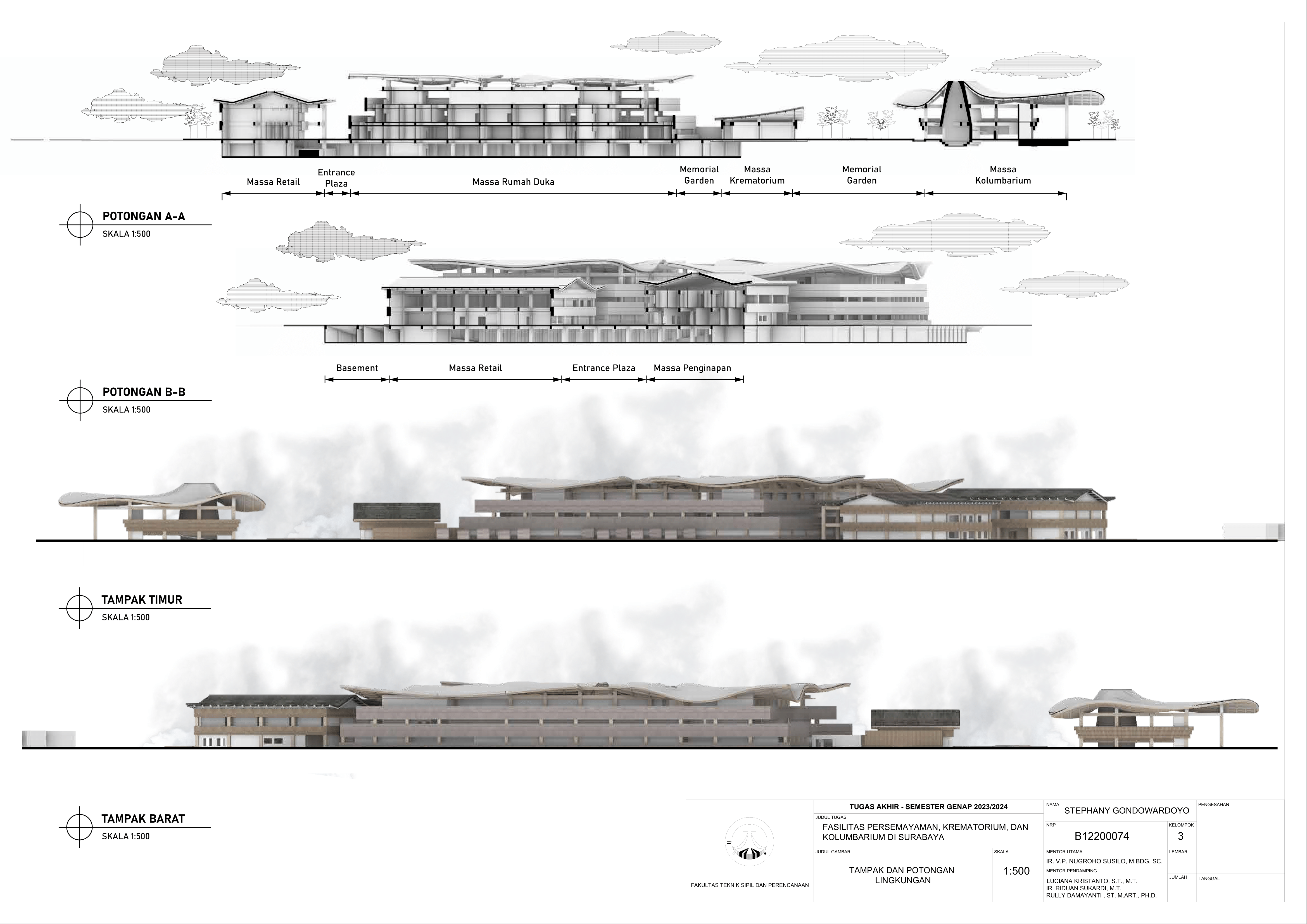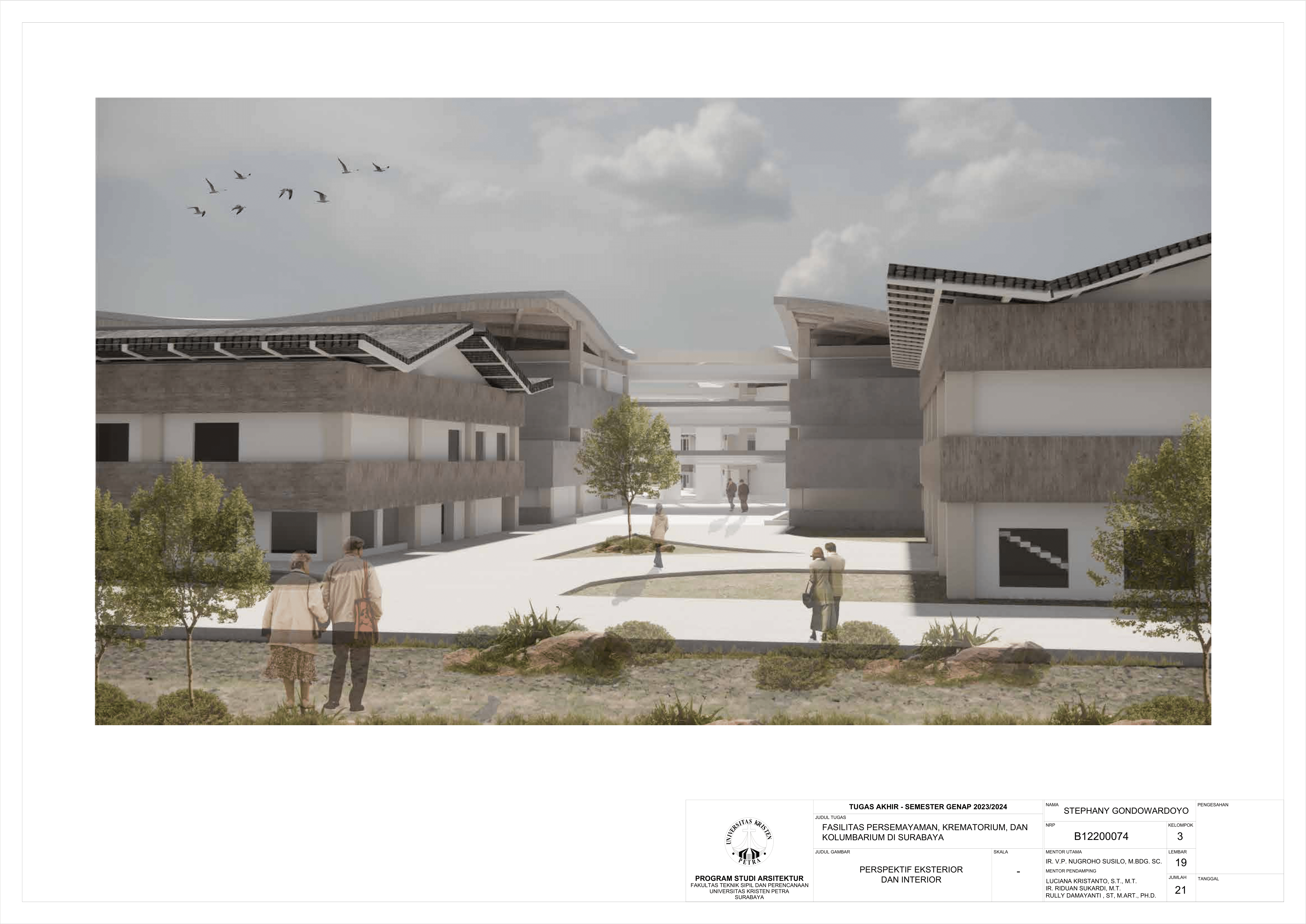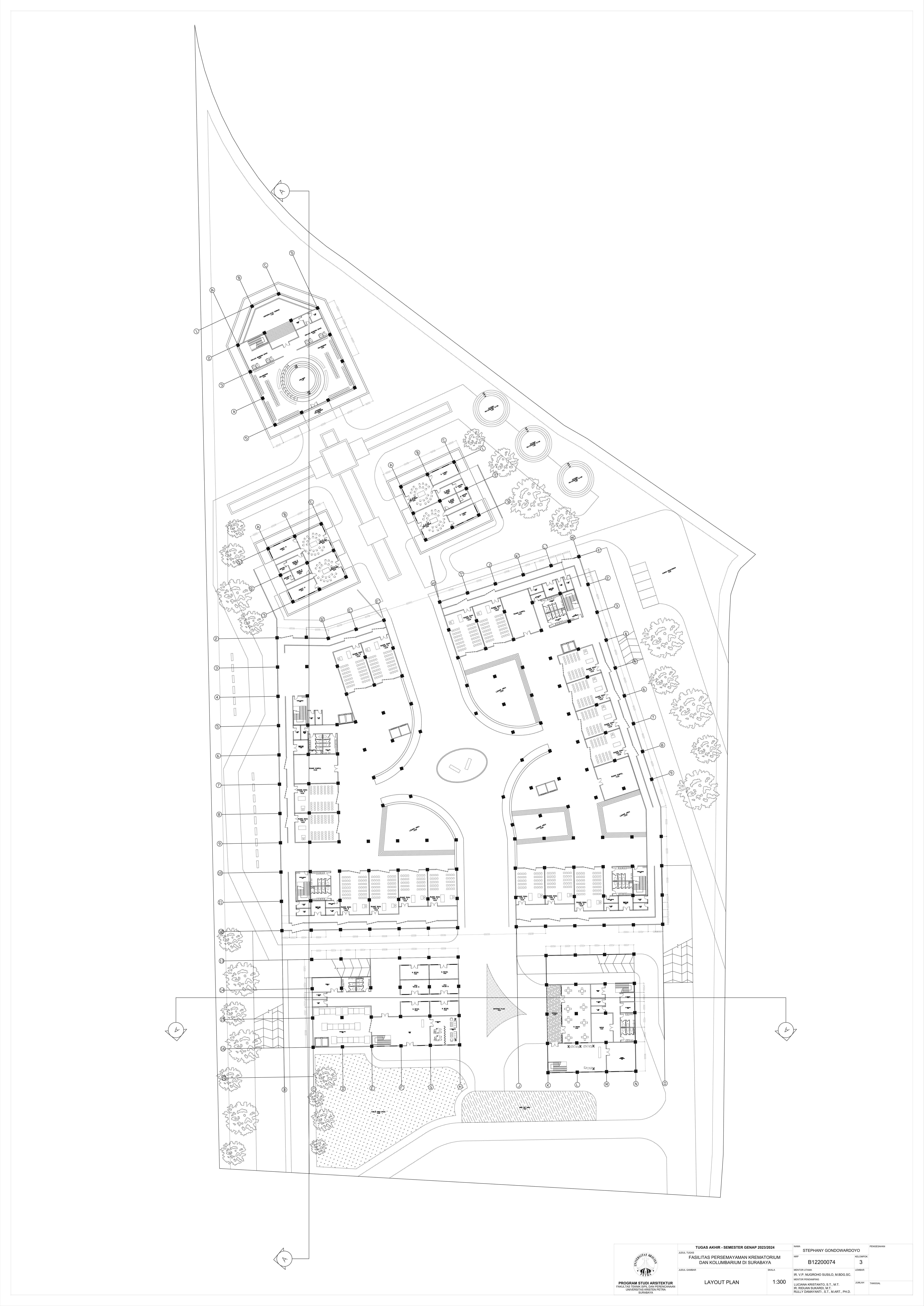 Kematian merupakan fase tak terhindarkan dalam kehidupan semua makhluk hidup, termasuk manusia. Sebagai kota terbesar di Jawa Timur, Kota Surabaya yang padat penduduk kian mengalami pertumbuhan angka kematian sehingga dibutuhkan fasilitas duka yang dapat menampung kebutuhan berkabung masyarakat. Namun, pada fasilitas eksisting didapati adanya beberapa kekurangan yakni, tata letak dan kapasitas fasilitas eksisting yang belum mencukupi kebutuhan masyarakat dan kurangnya pertimbangan terhadap kebutuhan emosional keluarga berduka. Selain itu, fasilitas duka eksisting hanya menawarkan metode pemakaman konvensional yang menimbulkan polusi lingkungan, baik melalui penguburan maupun perabuan jenazah. Oleh karena itu, dibutuhkanlah fasilitas duka yang mampu memenuhi kebutuhan duka masyarakat Kota Surabaya secara terpadu, kontekstual, serta mewadahi perubahan emosional pengguna selama proses duka. Perancangan fasilitas duka berupa fasilitas persemayaman, krematorium, dan kolumbarium bertujuan memenuhi kebutuhan akan ruang duka yang mempertimbangkan aspek manusia dan aspek sistem. Aspek manusia meliputi; kebutuhan akan persemayaman dan proses berkabung yang layak bagi jenazah maupun keluarga berduka melalui fasilitas duka dengan karakter ruang sakral serta interaksi bangunan dengan lingkungan sekitarnya. Aspek sistem meliputi tatanan sistem sirkulasi dalam kawasan fasilitas duka serta penerapan metode pemakaman yang ramah lingkungan melalui sistem kremasi air (aquamation). Oleh karena itu, pendekatan perancangan yang digunakan merupakan pendekatan arsitektur transenden.