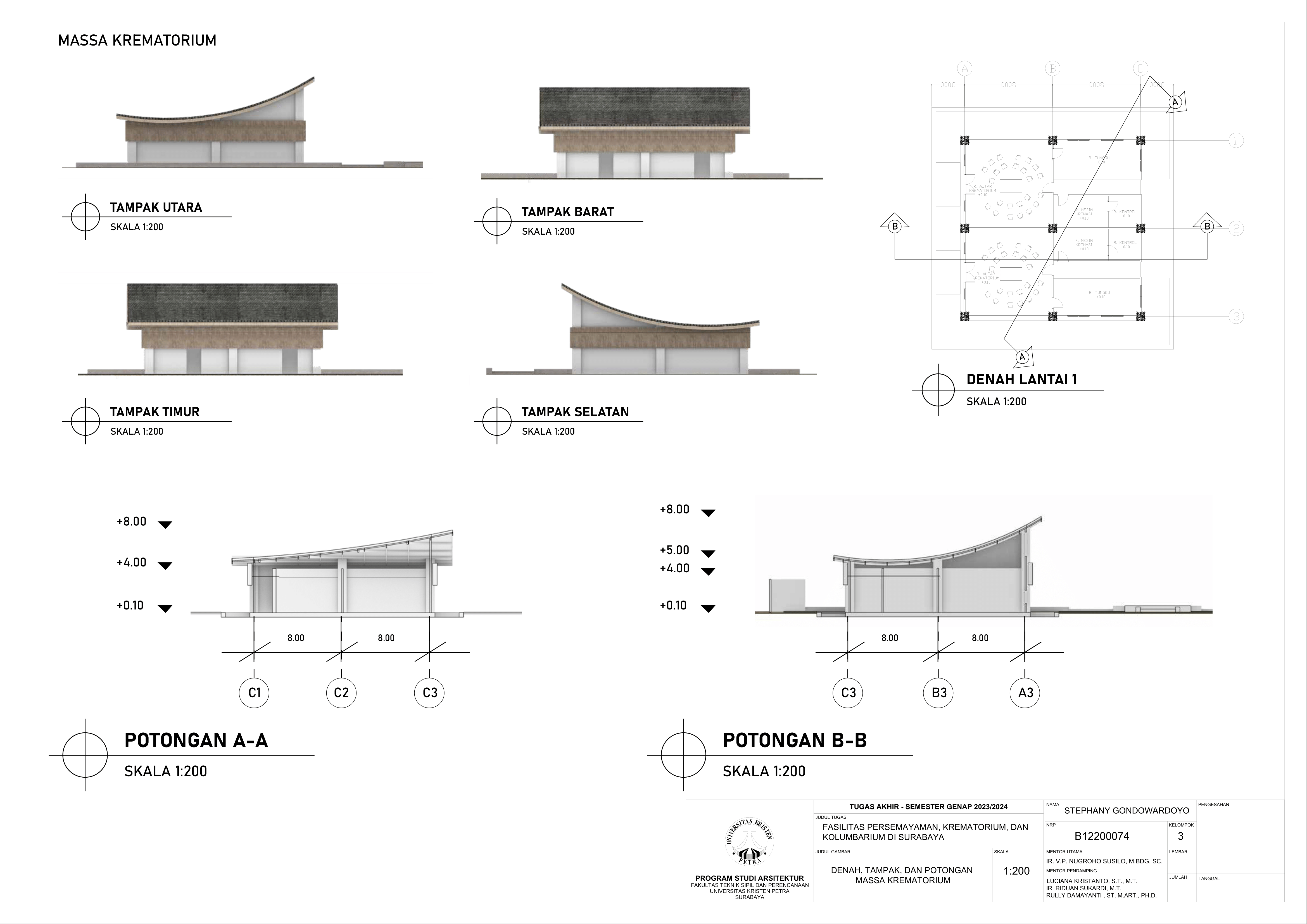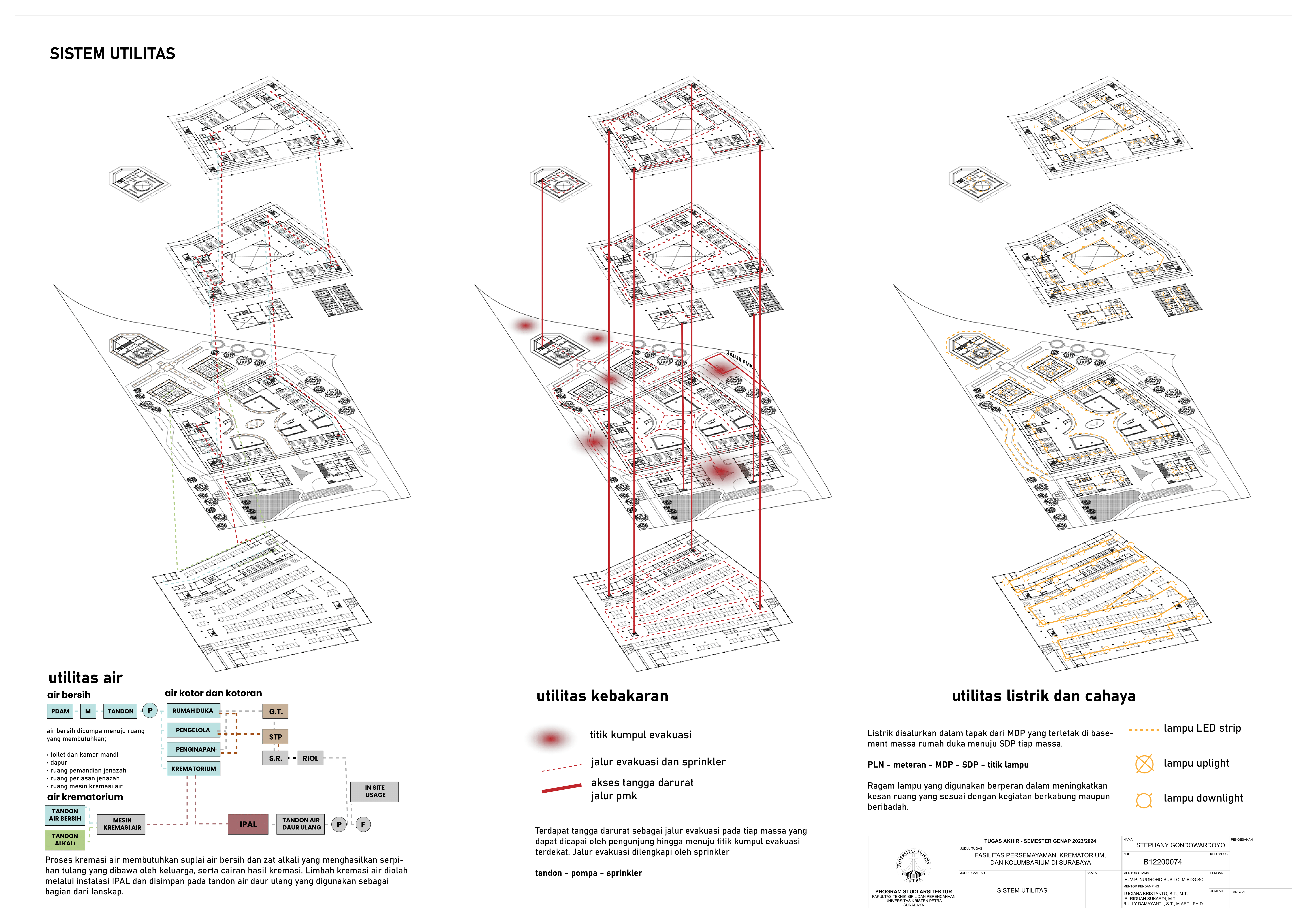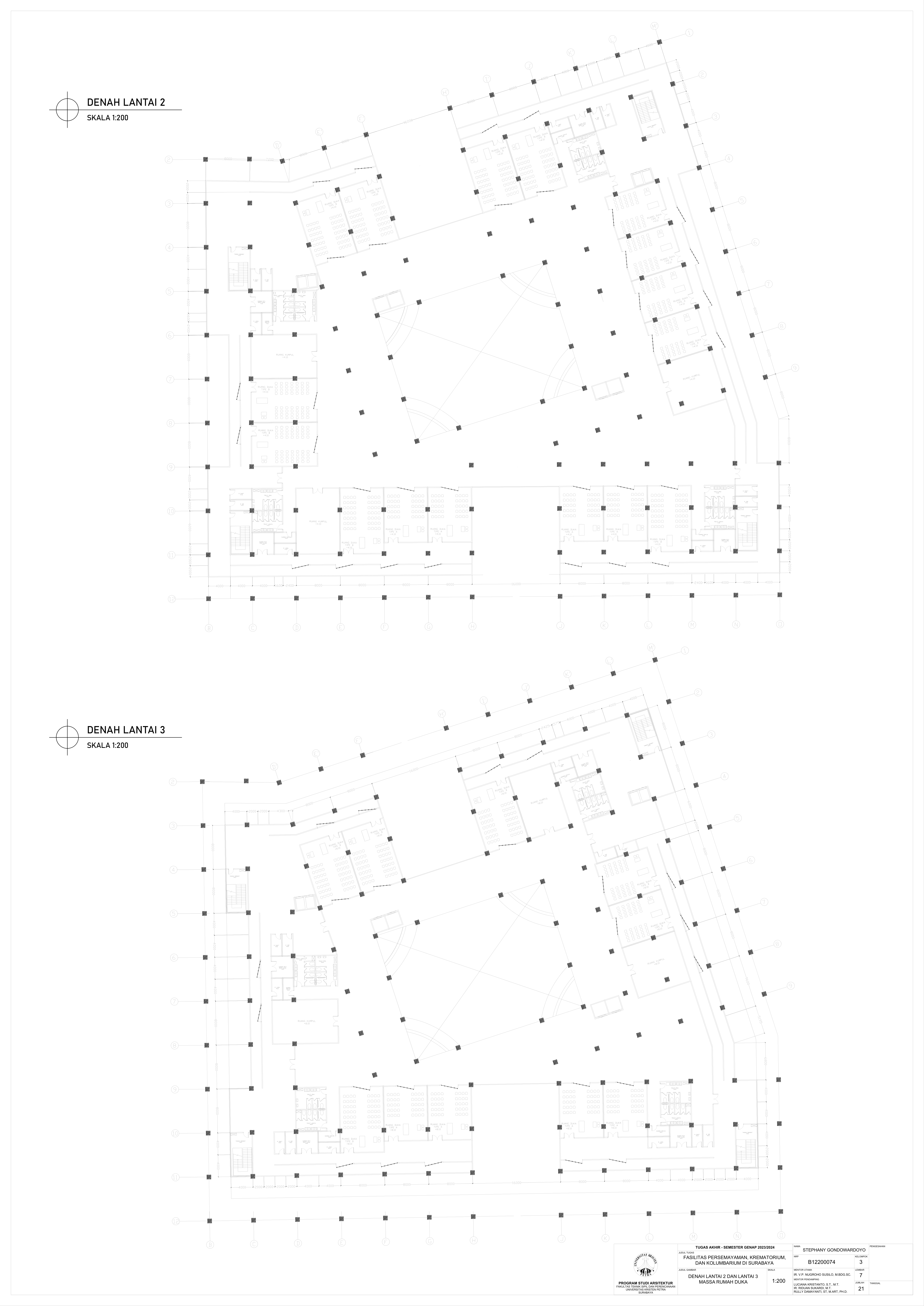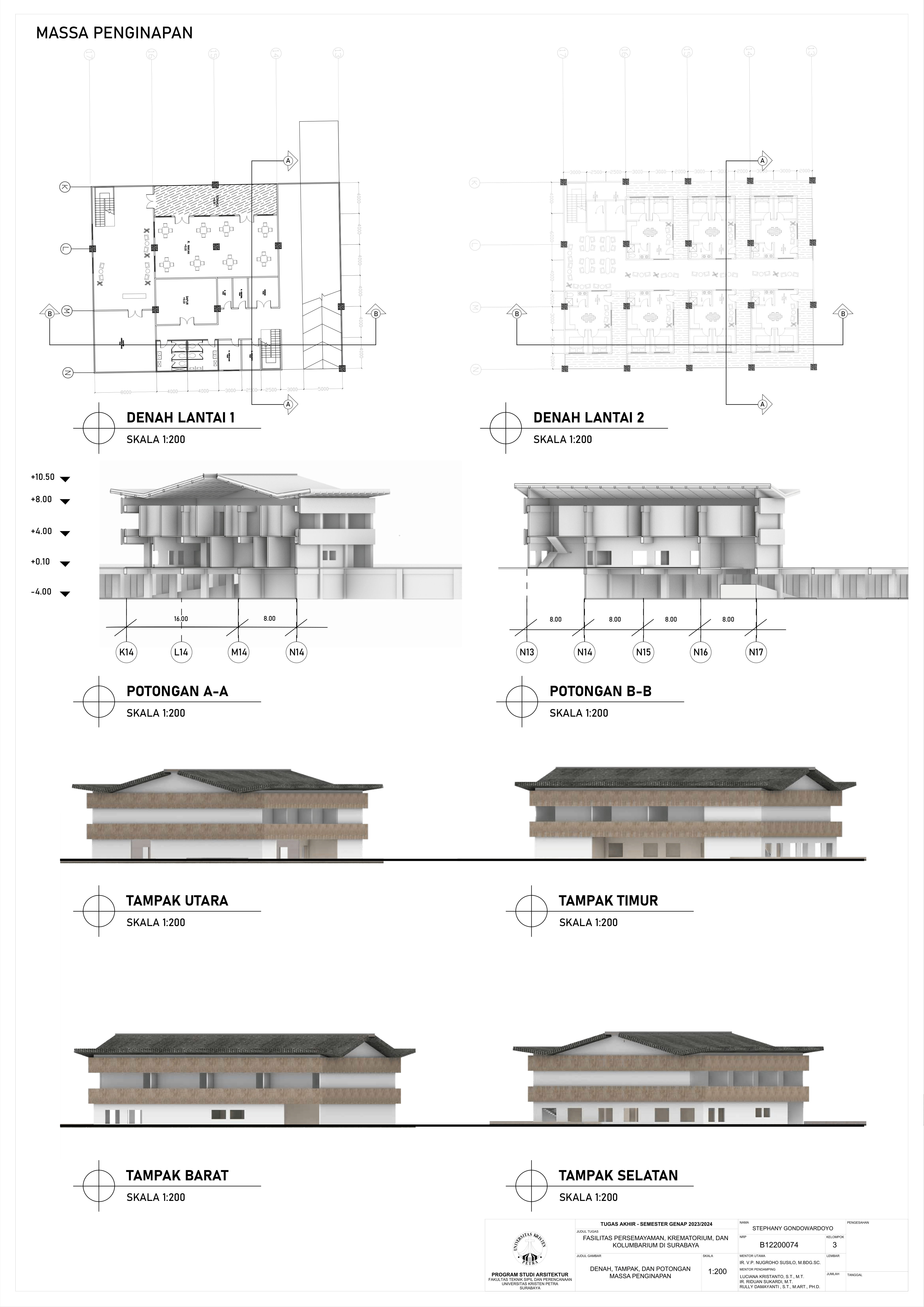 Kematian merupakan fase tak terhindarkan dalam kehidupan semua makhluk hidup, termasuk manusia. Sebagai kota terbesar di Jawa Timur, Kota Surabaya yang padat penduduk kian mengalami pertumbuhan angka kematian sehingga dibutuhkan fasilitas duka yang dapat menampung kebutuhan berkabung masyarakat. Namun, pada fasilitas eksisting didapati adanya beberapa kekurangan yakni, tata letak dan kapasitas fasilitas eksisting yang belum mencukupi kebutuhan masyarakat dan kurangnya pertimbangan terhadap kebutuhan emosional keluarga berduka. Selain itu, fasilitas duka eksisting hanya menawarkan metode pemakaman konvensional yang menimbulkan polusi lingkungan, baik melalui penguburan maupun perabuan jenazah. Oleh karena itu, dibutuhkanlah fasilitas duka yang mampu memenuhi kebutuhan duka masyarakat Kota Surabaya secara terpadu, kontekstual, serta mewadahi perubahan emosional pengguna selama proses duka. Perancangan fasilitas duka berupa fasilitas persemayaman, krematorium, dan kolumbarium bertujuan memenuhi kebutuhan akan ruang duka yang mempertimbangkan aspek manusia dan aspek sistem. Aspek manusia meliputi; kebutuhan akan persemayaman dan proses berkabung yang layak bagi jenazah maupun keluarga berduka melalui fasilitas duka dengan karakter ruang sakral serta interaksi bangunan dengan lingkungan sekitarnya. Aspek sistem meliputi tatanan sistem sirkulasi dalam kawasan fasilitas duka serta penerapan metode pemakaman yang ramah lingkungan melalui sistem kremasi air (aquamation). Oleh karena itu, pendekatan perancangan yang digunakan merupakan pendekatan arsitektur transenden.