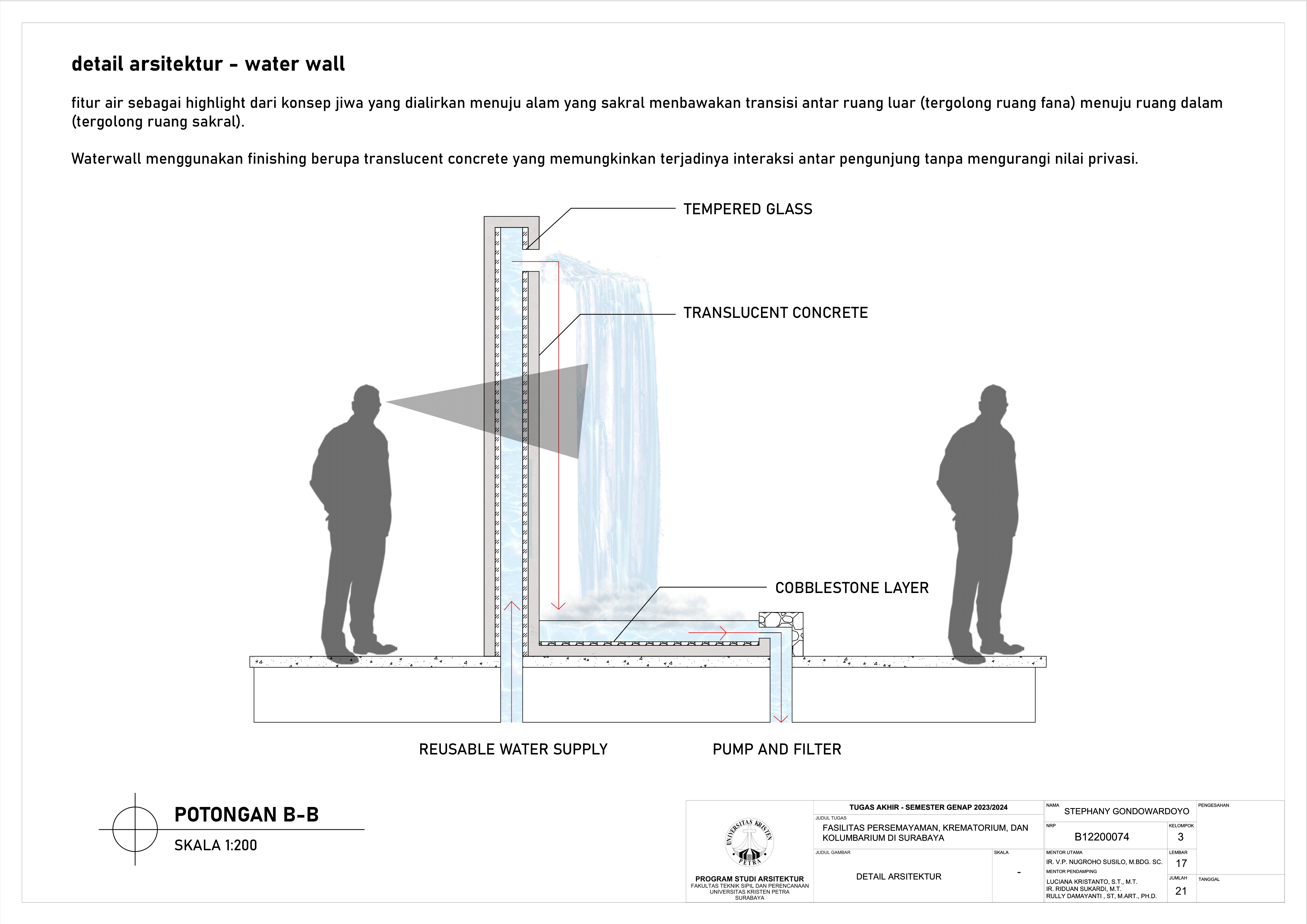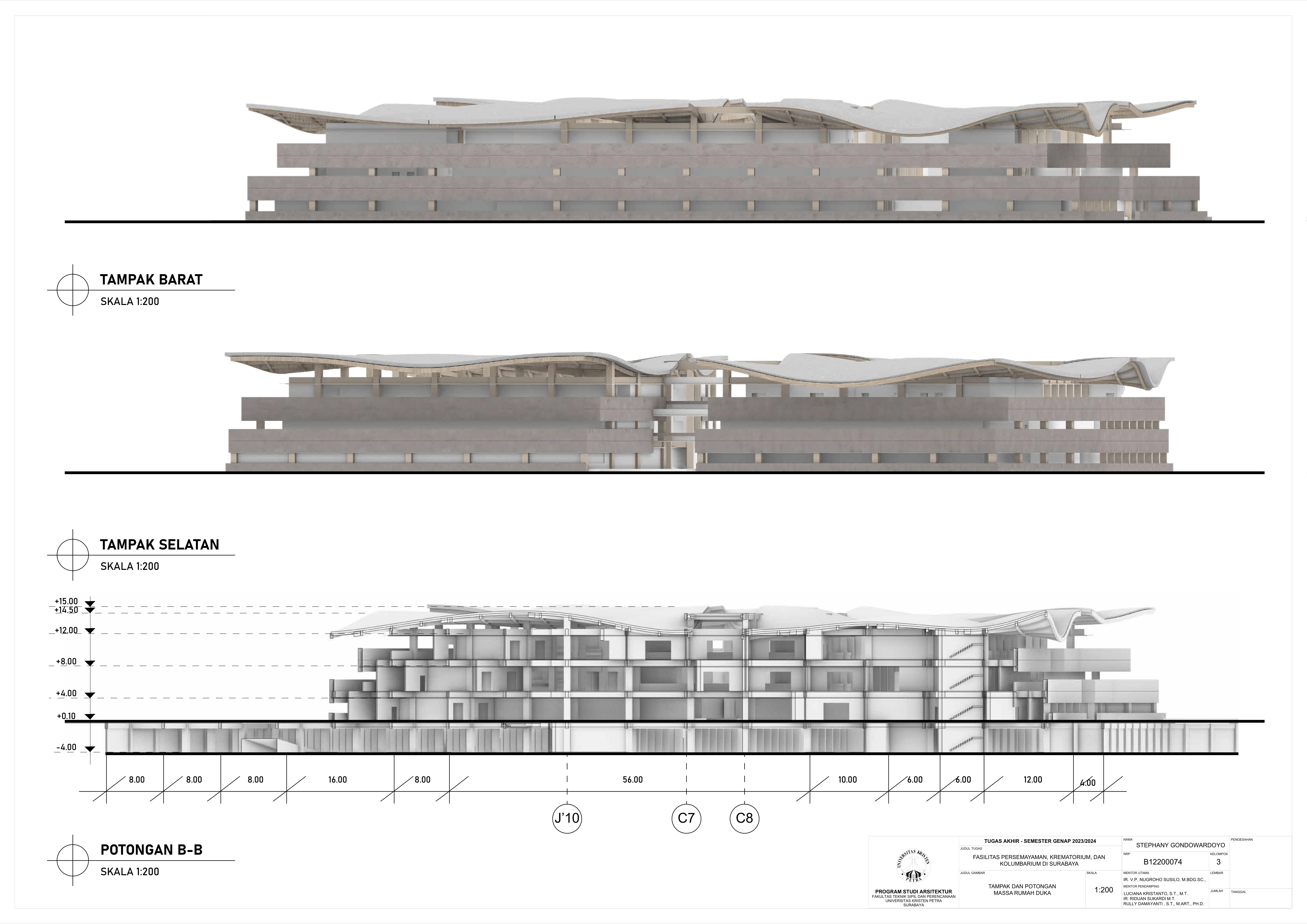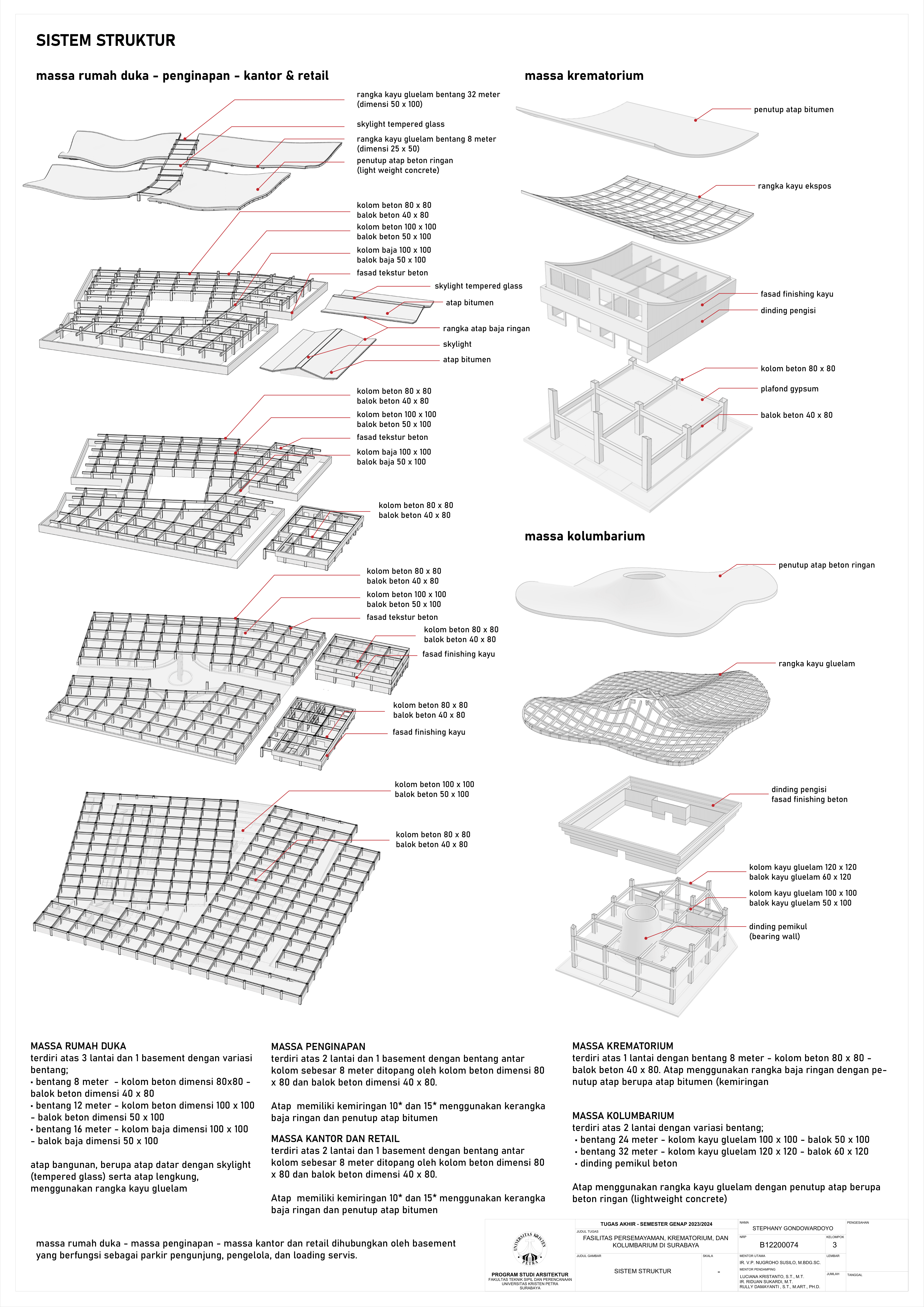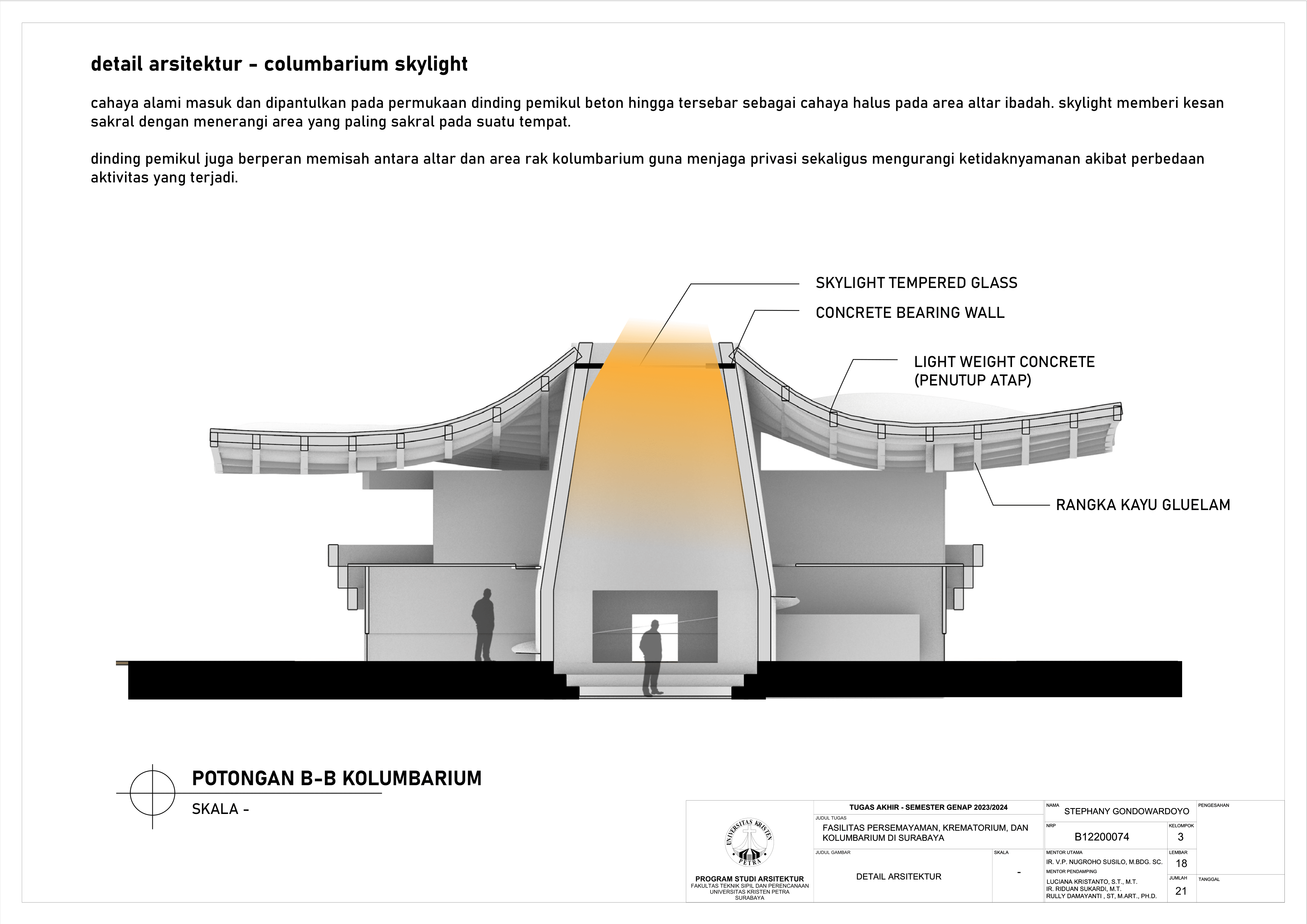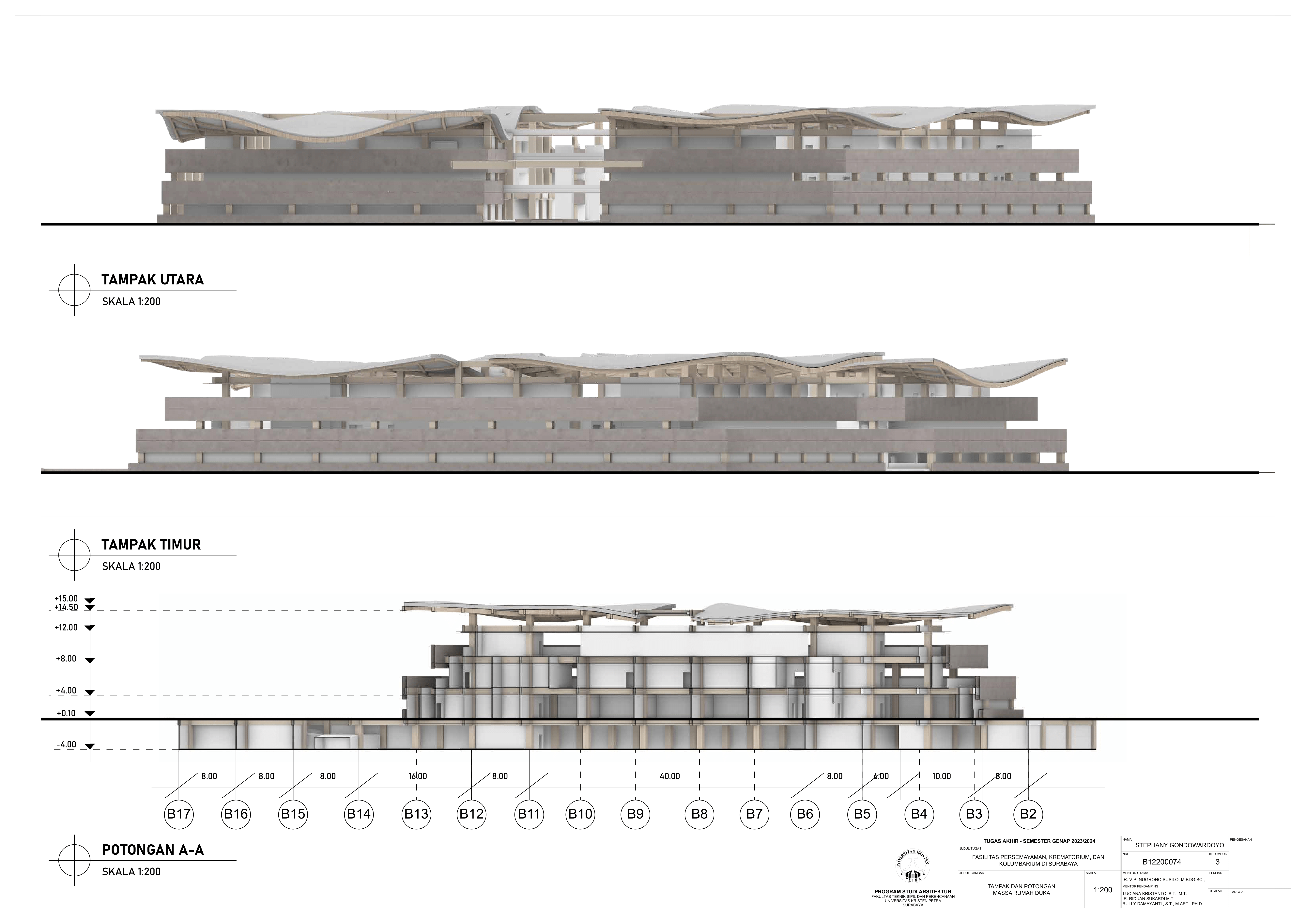 Kematian merupakan fase tak terhindarkan dalam kehidupan semua makhluk hidup, termasuk manusia. Sebagai kota terbesar di Jawa Timur, Kota Surabaya yang padat penduduk kian mengalami pertumbuhan angka kematian sehingga dibutuhkan fasilitas duka yang dapat menampung kebutuhan berkabung masyarakat. Namun, pada fasilitas eksisting didapati adanya beberapa kekurangan yakni, tata letak dan kapasitas fasilitas eksisting yang belum mencukupi kebutuhan masyarakat dan kurangnya pertimbangan terhadap kebutuhan emosional keluarga berduka. Selain itu, fasilitas duka eksisting hanya menawarkan metode pemakaman konvensional yang menimbulkan polusi lingkungan, baik melalui penguburan maupun perabuan jenazah. Oleh karena itu, dibutuhkanlah fasilitas duka yang mampu memenuhi kebutuhan duka masyarakat Kota Surabaya secara terpadu, kontekstual, serta mewadahi perubahan emosional pengguna selama proses duka. Perancangan fasilitas duka berupa fasilitas persemayaman, krematorium, dan kolumbarium bertujuan memenuhi kebutuhan akan ruang duka yang mempertimbangkan aspek manusia dan aspek sistem. Aspek manusia meliputi; kebutuhan akan persemayaman dan proses berkabung yang layak bagi jenazah maupun keluarga berduka melalui fasilitas duka dengan karakter ruang sakral serta interaksi bangunan dengan lingkungan sekitarnya. Aspek sistem meliputi tatanan sistem sirkulasi dalam kawasan fasilitas duka serta penerapan metode pemakaman yang ramah lingkungan melalui sistem kremasi air (aquamation). Oleh karena itu, pendekatan perancangan yang digunakan merupakan pendekatan arsitektur transenden.