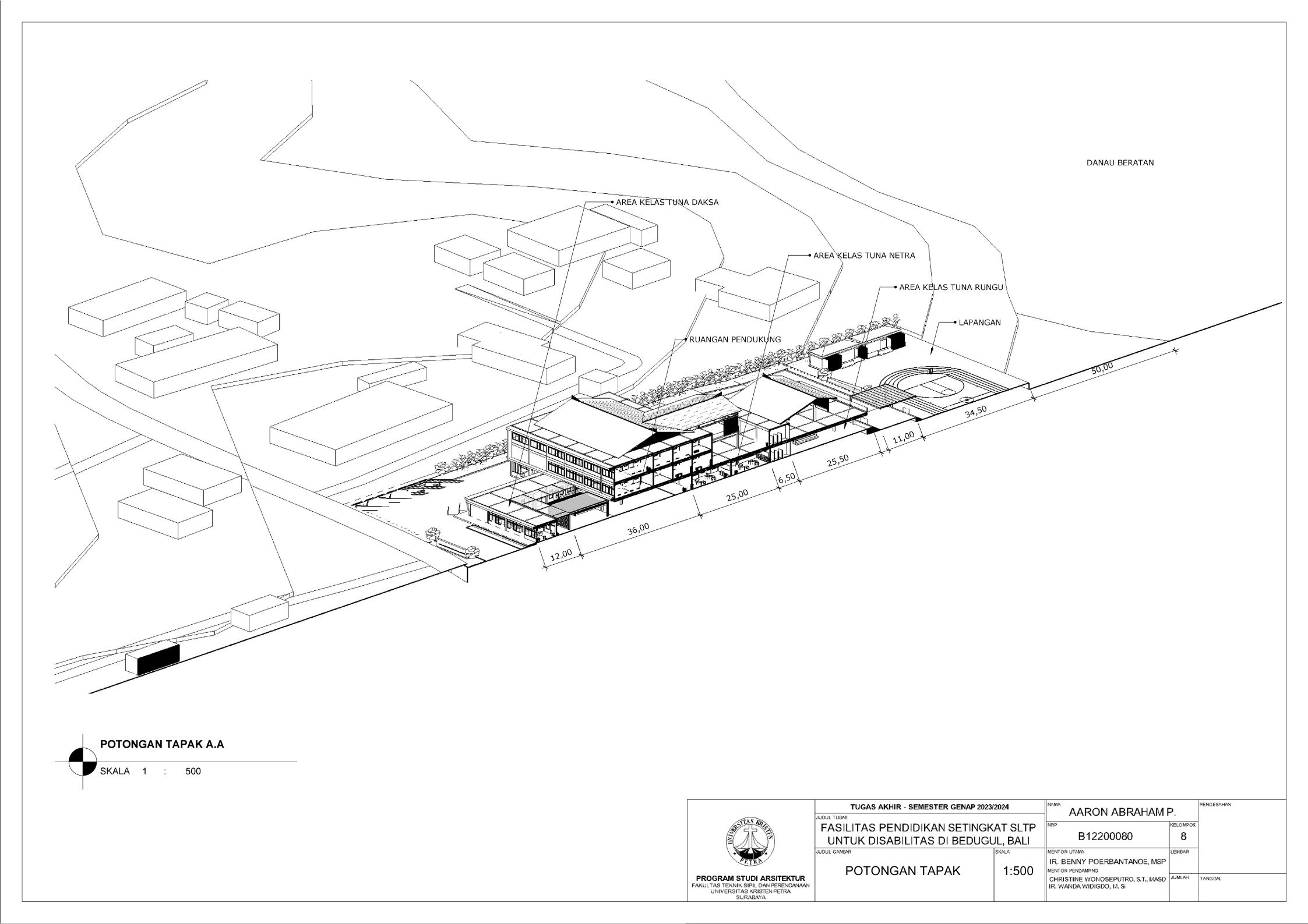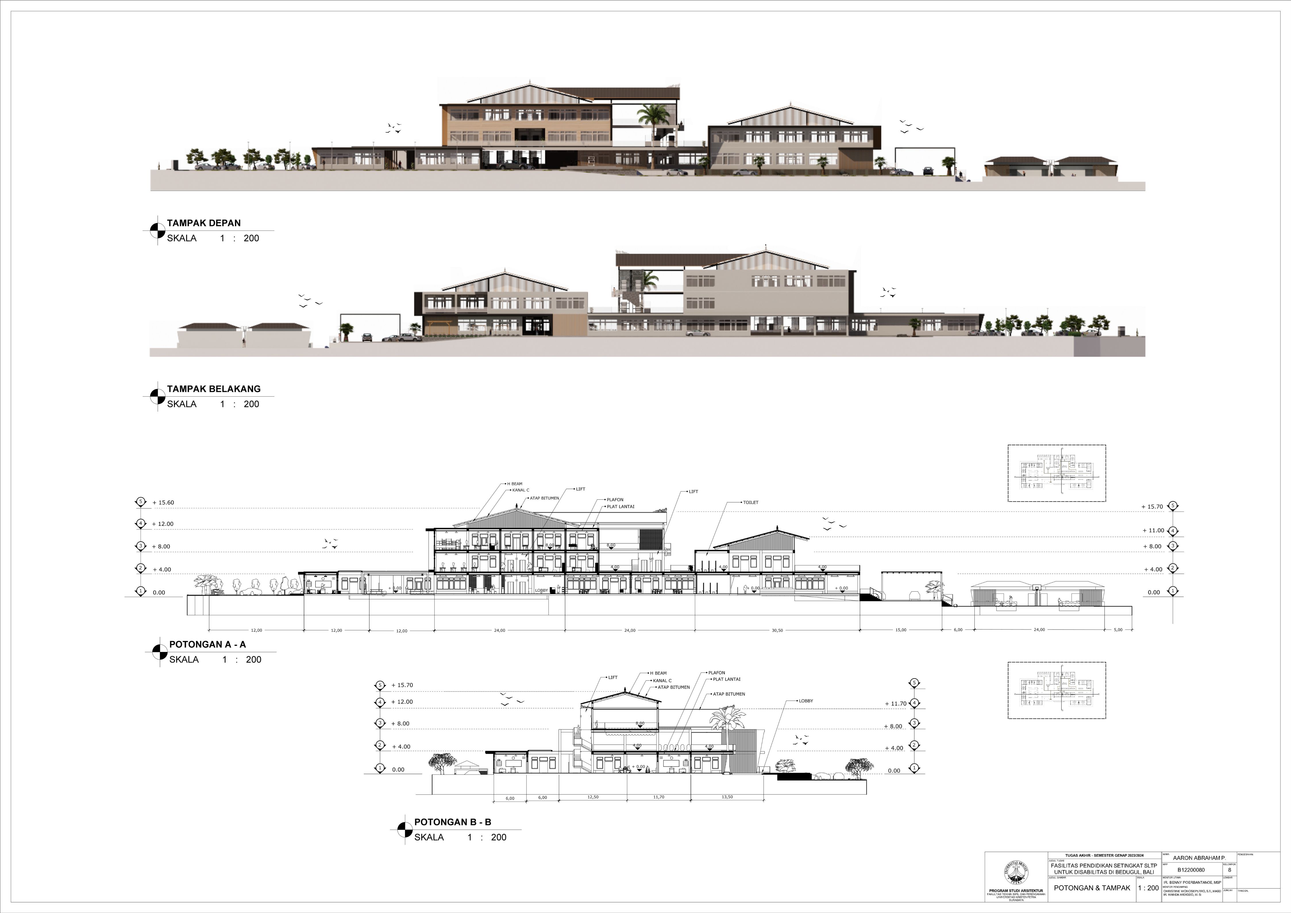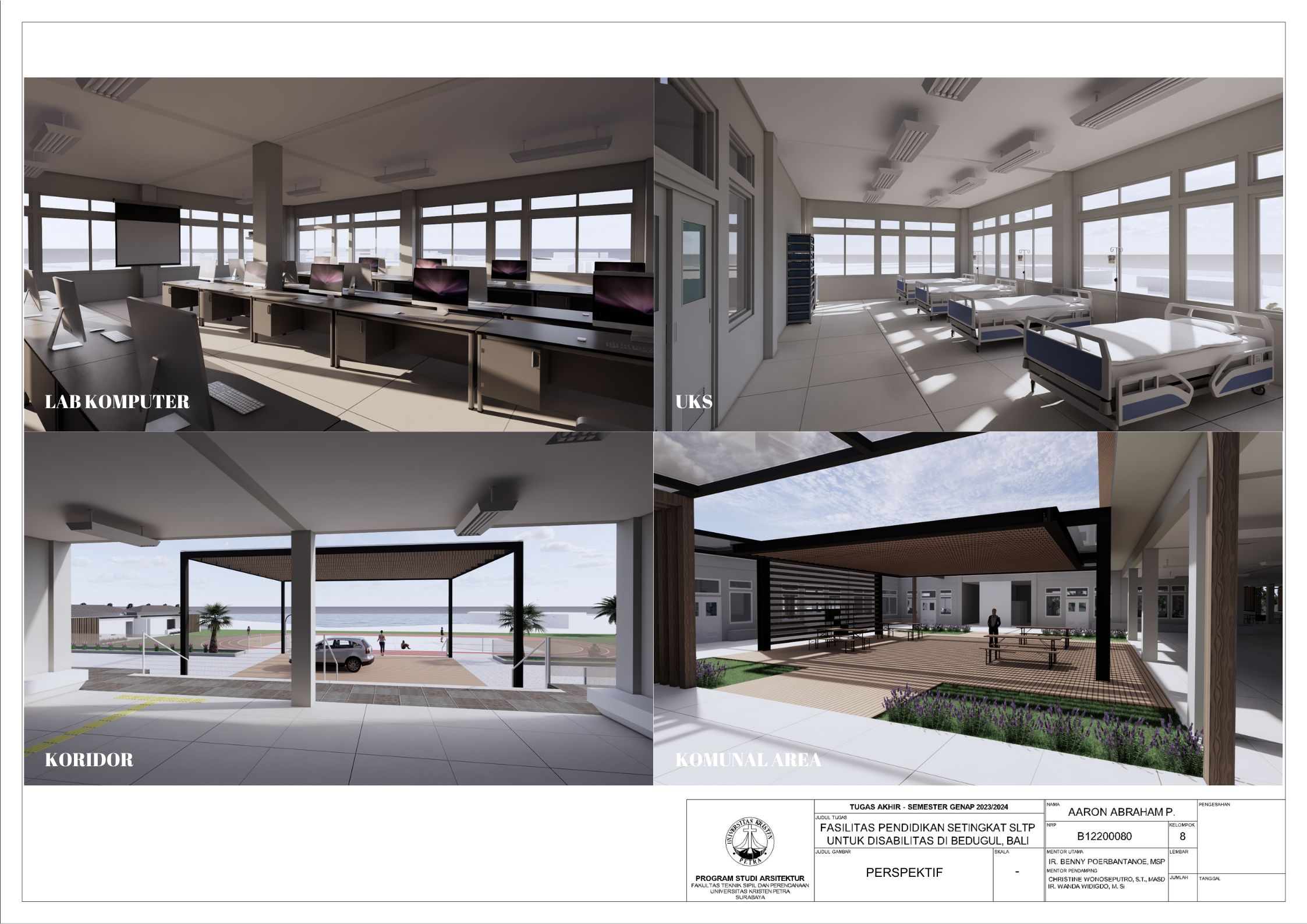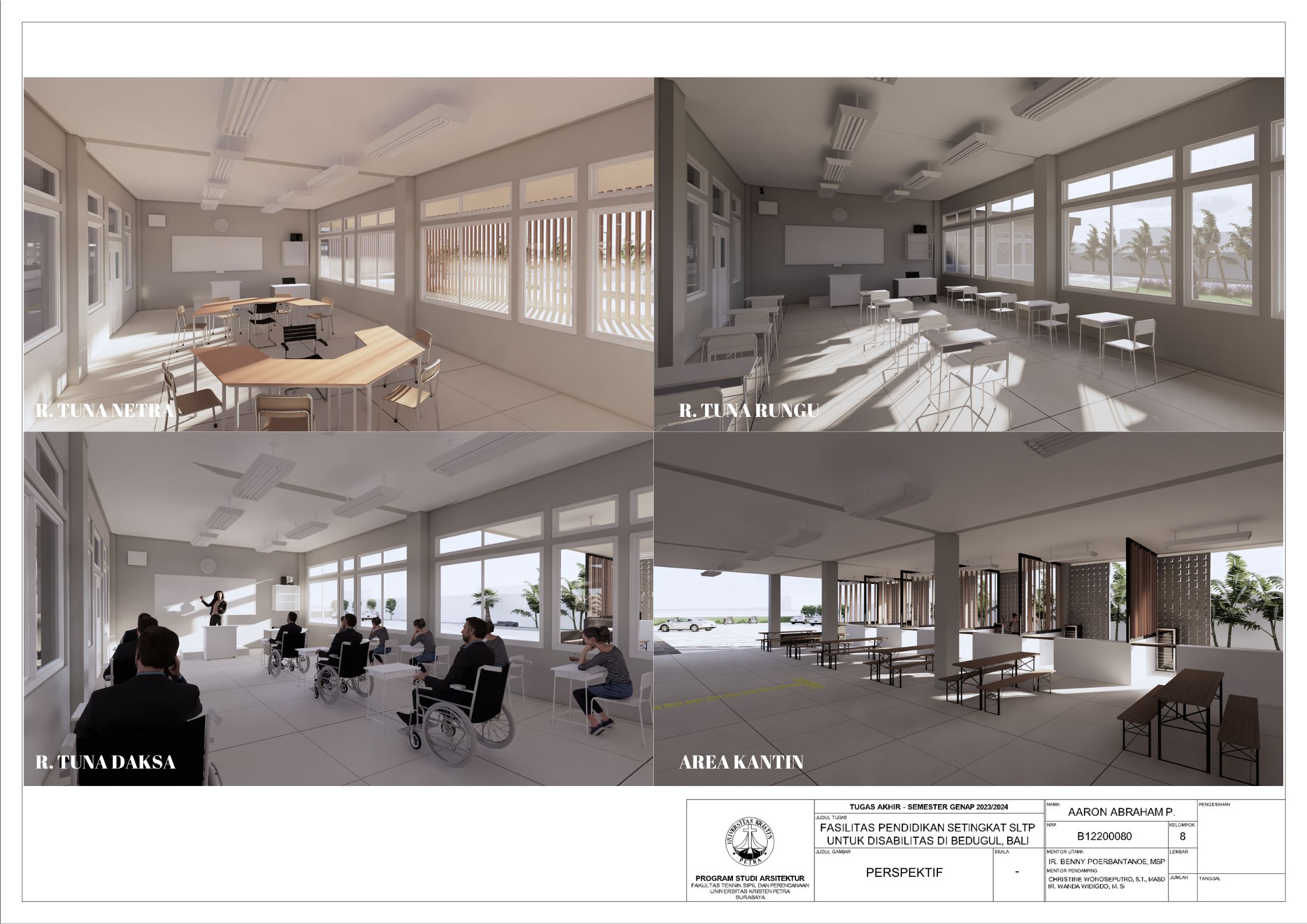 Sekolah disabilitas adalah sekolah yang menyediakan sarana pendidikan bagi penyandang disabilitas agar penyandang disabilitas memiliki kesempatan pendidikan yang sama dengan non-disabilitas. Sekolah disabilitas yang dirancang adalah sekolah tingkat SMP atau SLTP, yang memiliki 3 tingkat kelas, yaitu kelas 1, kelas 2, dan kelas 3. Setiap kelas terbagi menjadi 3 ketunaan yang didalami yaitu tuna daksa, tuna rungu, dan tuna netra, dengan kebutuhan yang berbeda. Tuna daksa yang memerlukan desain yang dapat diakses setiap ruangannya dengan desain khusus seperti ramp yang sesuai dengan standar, tuna netra dengan guide path yang memadai, dan tuna rungu dengan desain kelas yang kedap suara agar siswa dapat berkonsentrasi dengan maksimal. Dengan adanya kebutuhan khusus masing-masing ketunaan, maka harus memperdalami perilaku siswa. Maka dari itu pendekatan yang digunakan adalah metode pendekatan perilaku disabilitas agar dapat menciptakan sebuah sekolah yang dapat menyesuaikan perilaku dan sesuai dengan kebutuhan siswa disabilitas. Sekolah yang dirancang sesuai dengan perilaku siswa dapat melatih kemandirian, pemberdayaan, dan integrasi siswa dalam masyarakat.