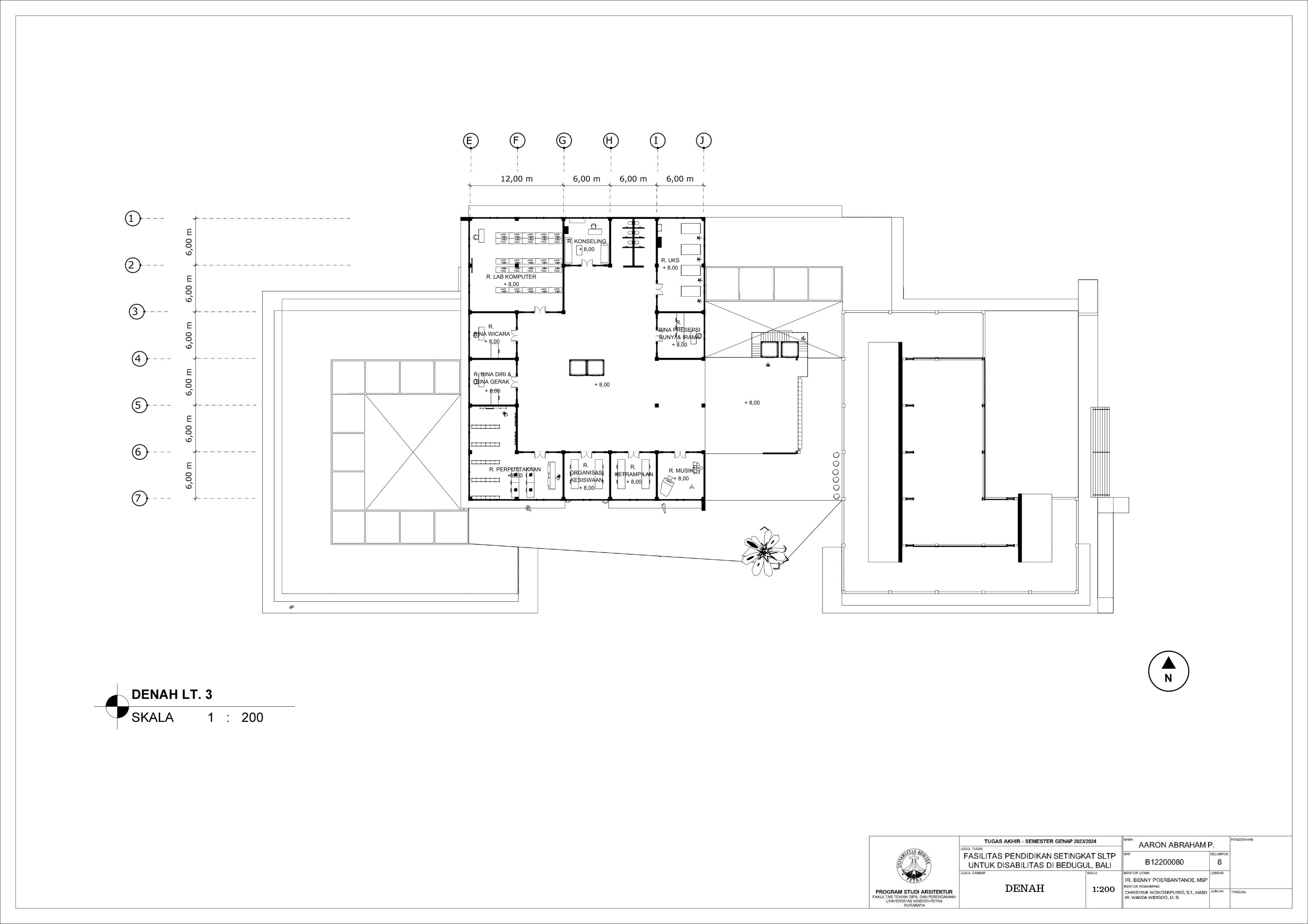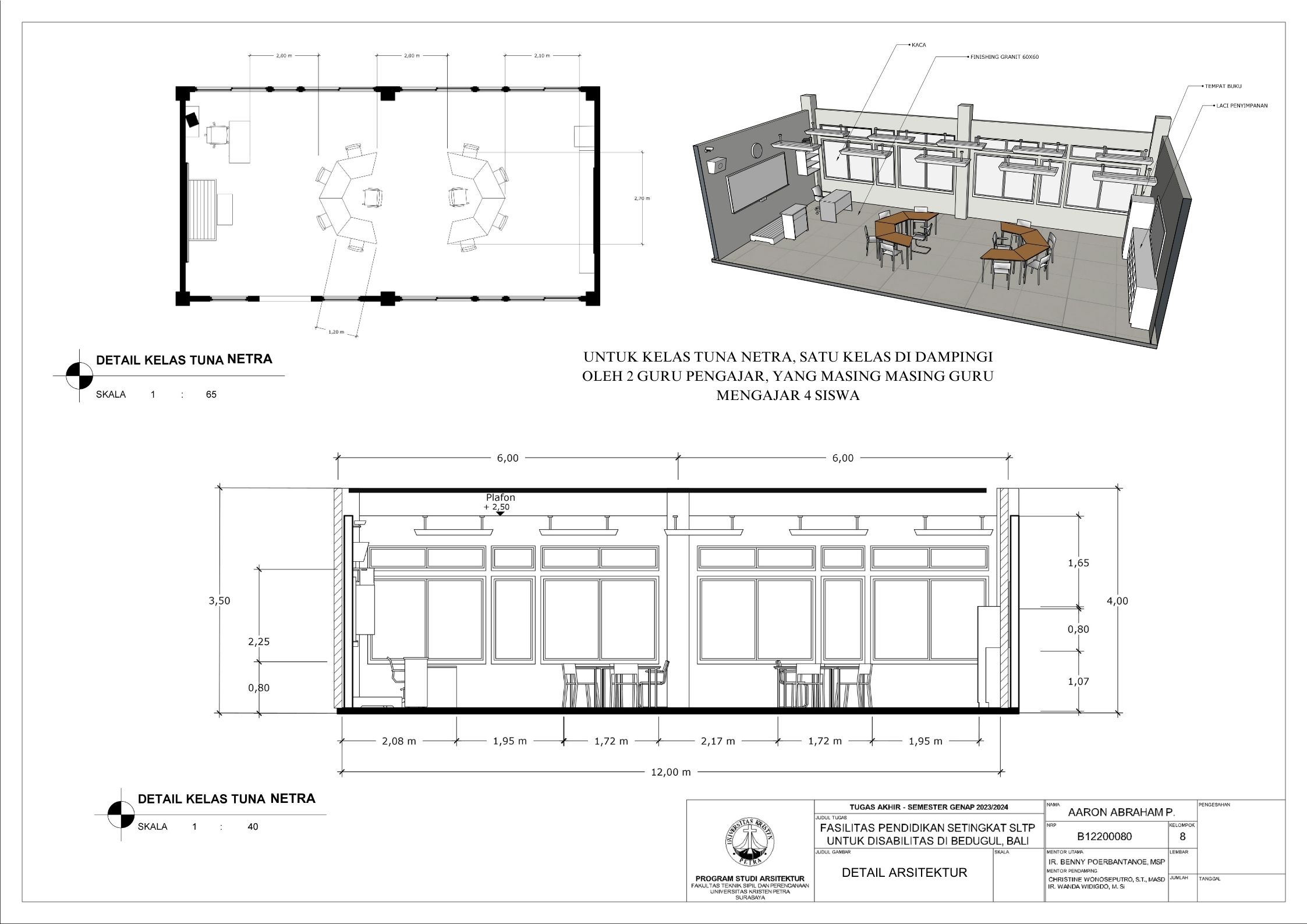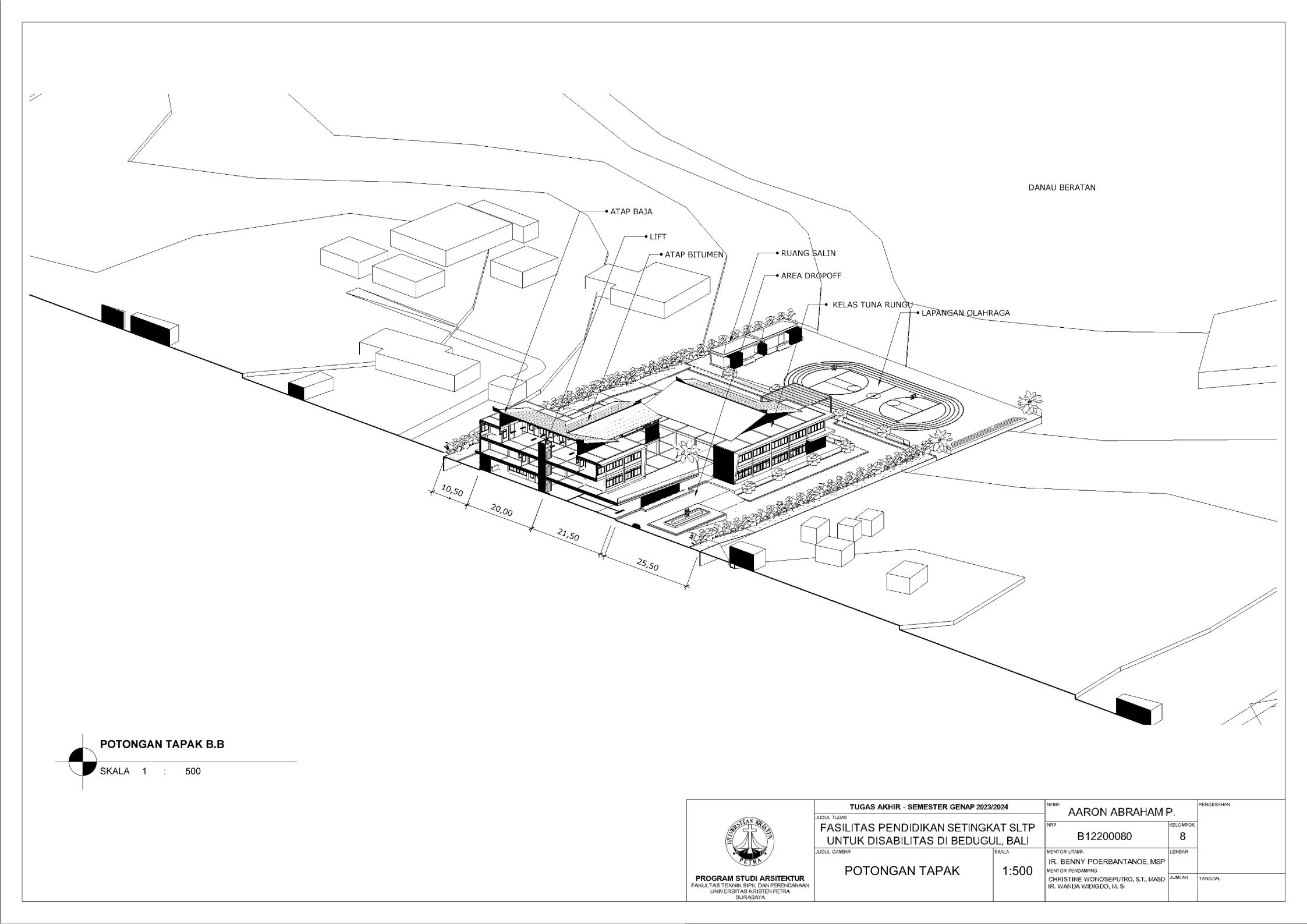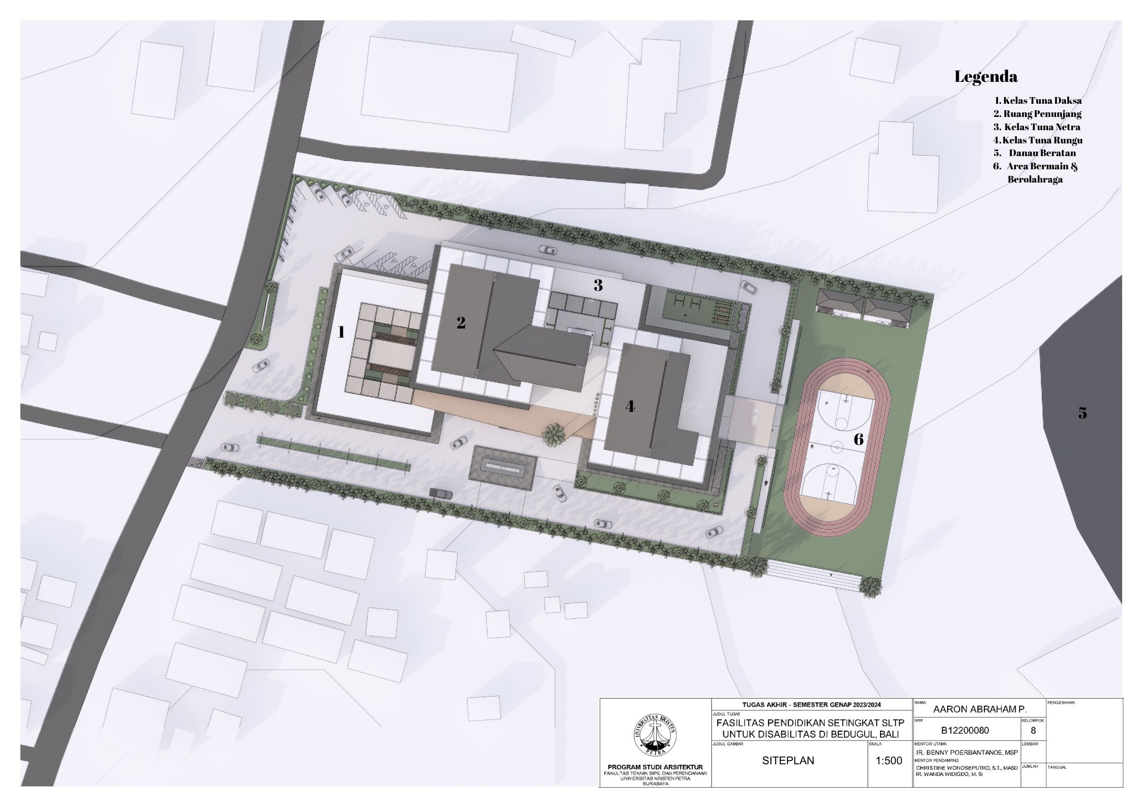 Sekolah disabilitas adalah sekolah yang menyediakan sarana pendidikan bagi penyandang disabilitas agar penyandang disabilitas memiliki kesempatan pendidikan yang sama dengan non-disabilitas. Sekolah disabilitas yang dirancang adalah sekolah tingkat SMP atau SLTP, yang memiliki 3 tingkat kelas, yaitu kelas 1, kelas 2, dan kelas 3. Setiap kelas terbagi menjadi 3 ketunaan yang didalami yaitu tuna daksa, tuna rungu, dan tuna netra, dengan kebutuhan yang berbeda. Tuna daksa yang memerlukan desain yang dapat diakses setiap ruangannya dengan desain khusus seperti ramp yang sesuai dengan standar, tuna netra dengan guide path yang memadai, dan tuna rungu dengan desain kelas yang kedap suara agar siswa dapat berkonsentrasi dengan maksimal. Dengan adanya kebutuhan khusus masing-masing ketunaan, maka harus memperdalami perilaku siswa. Maka dari itu pendekatan yang digunakan adalah metode pendekatan perilaku disabilitas agar dapat menciptakan sebuah sekolah yang dapat menyesuaikan perilaku dan sesuai dengan kebutuhan siswa disabilitas. Sekolah yang dirancang sesuai dengan perilaku siswa dapat melatih kemandirian, pemberdayaan, dan integrasi siswa dalam masyarakat.
