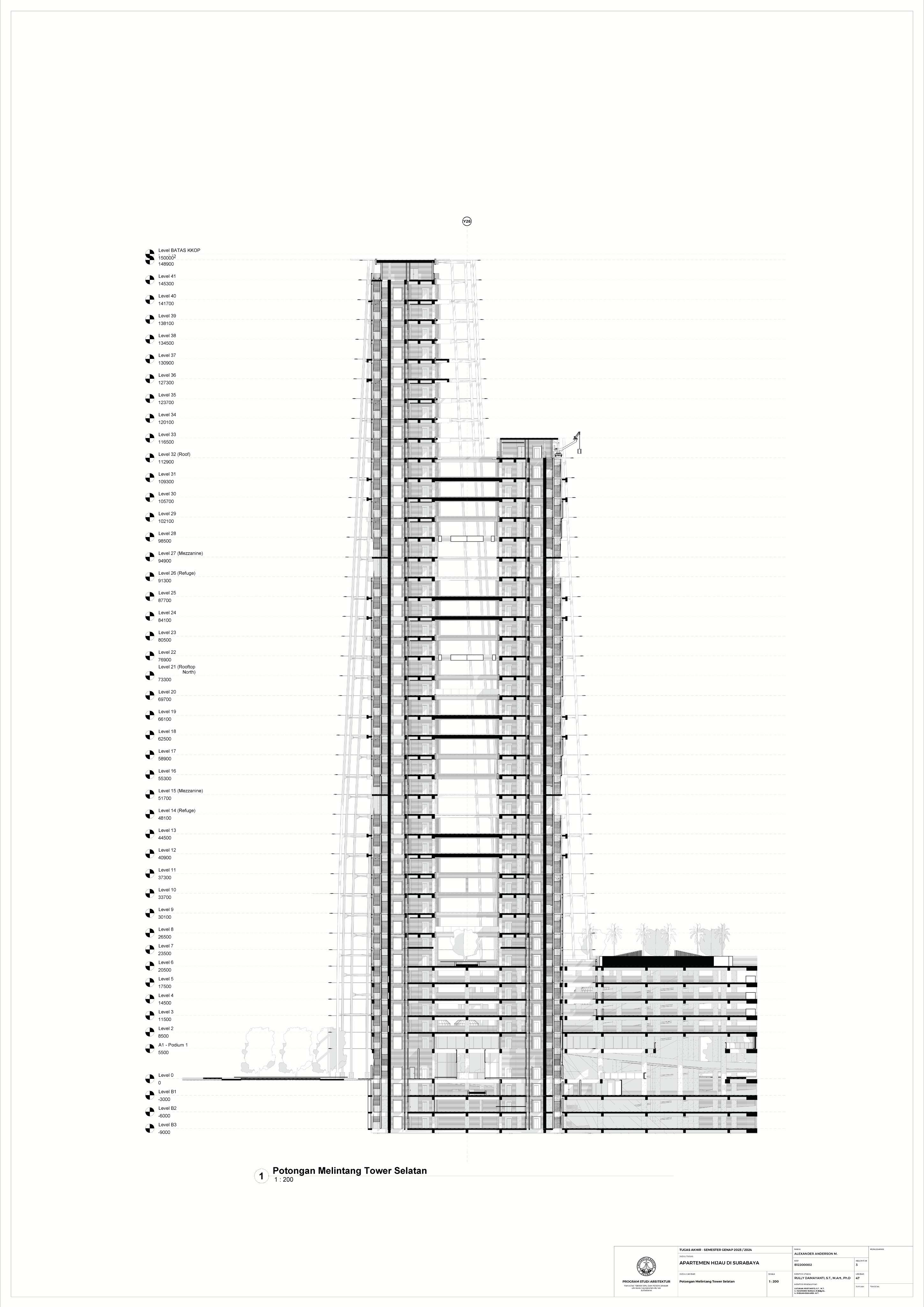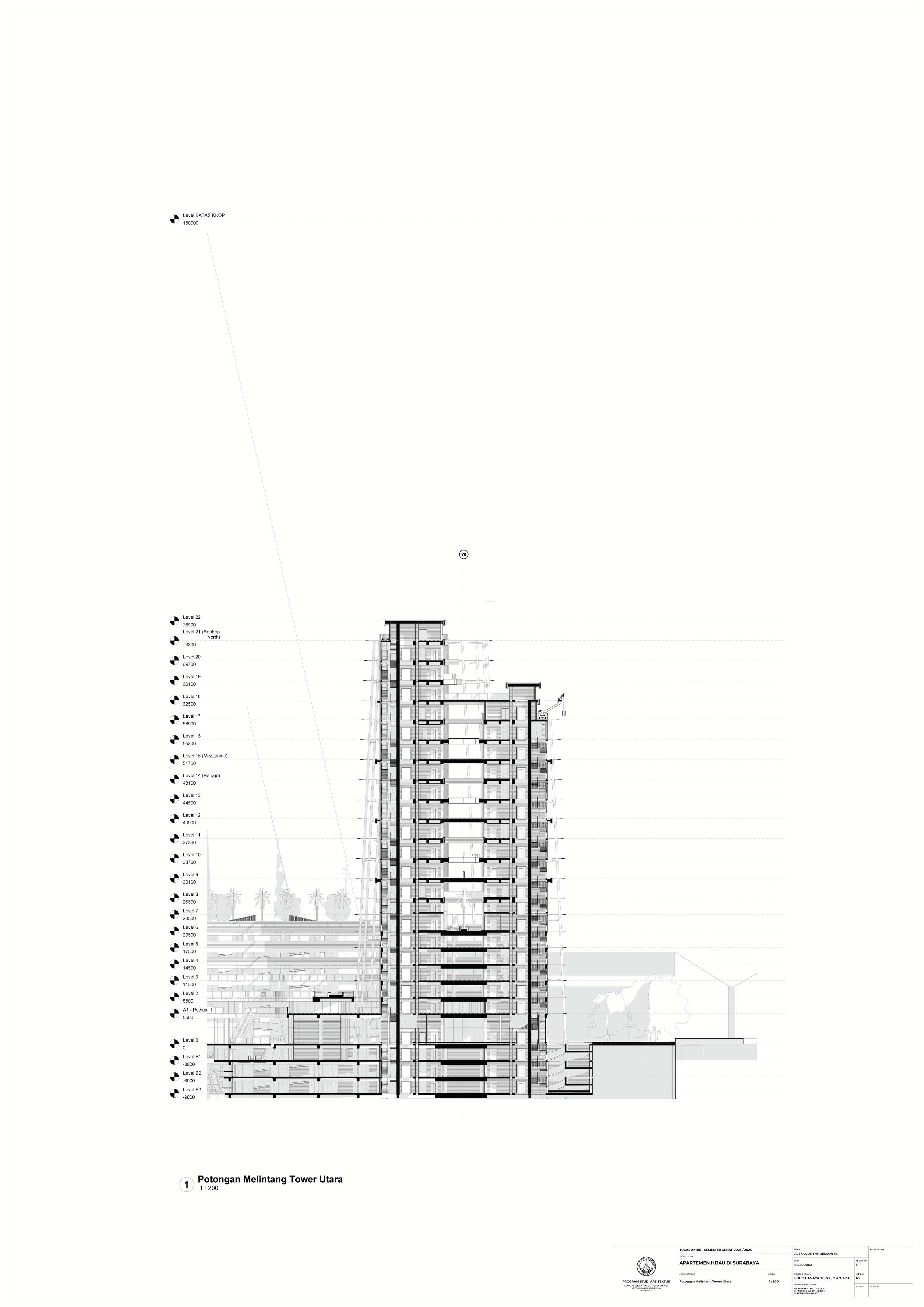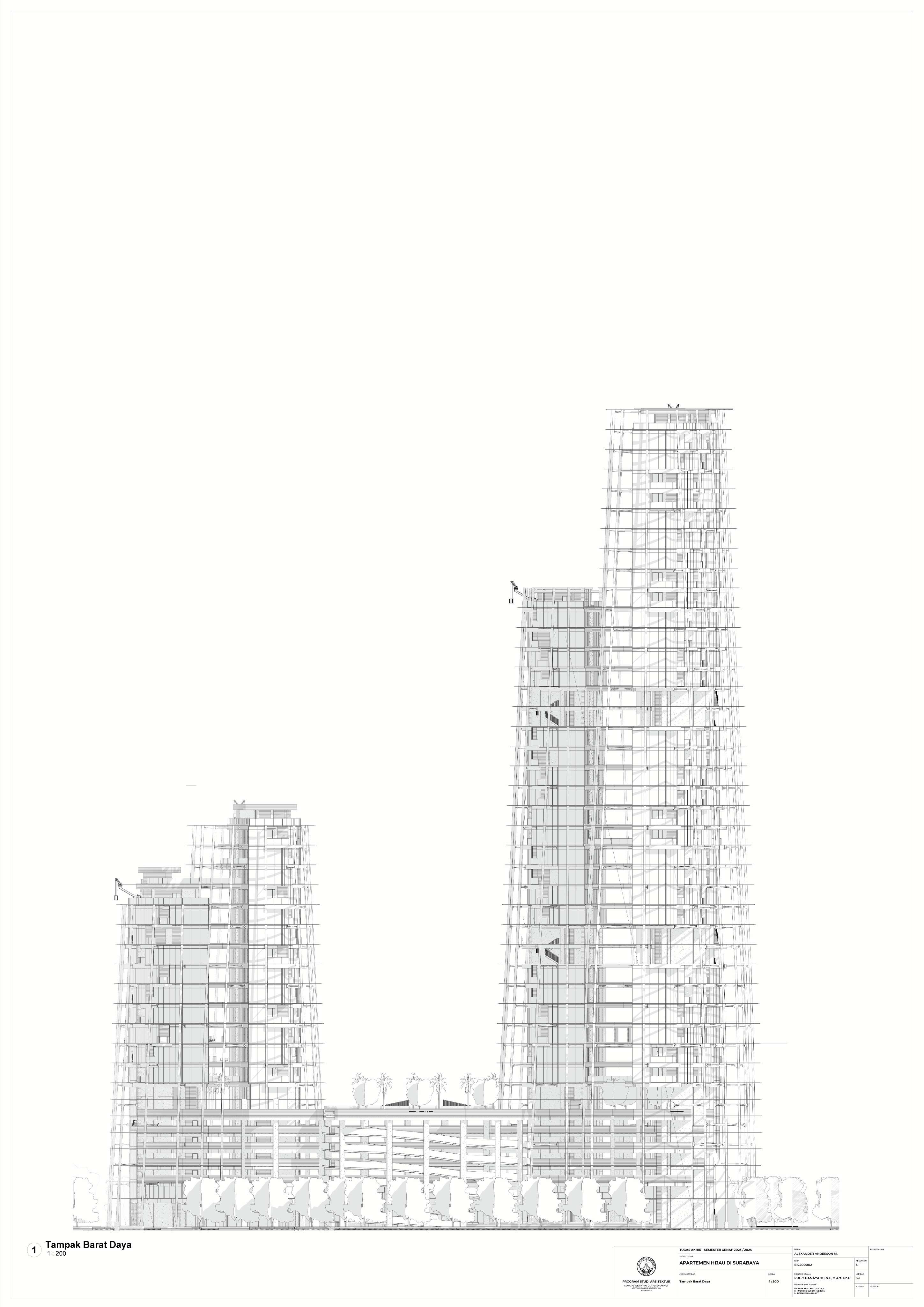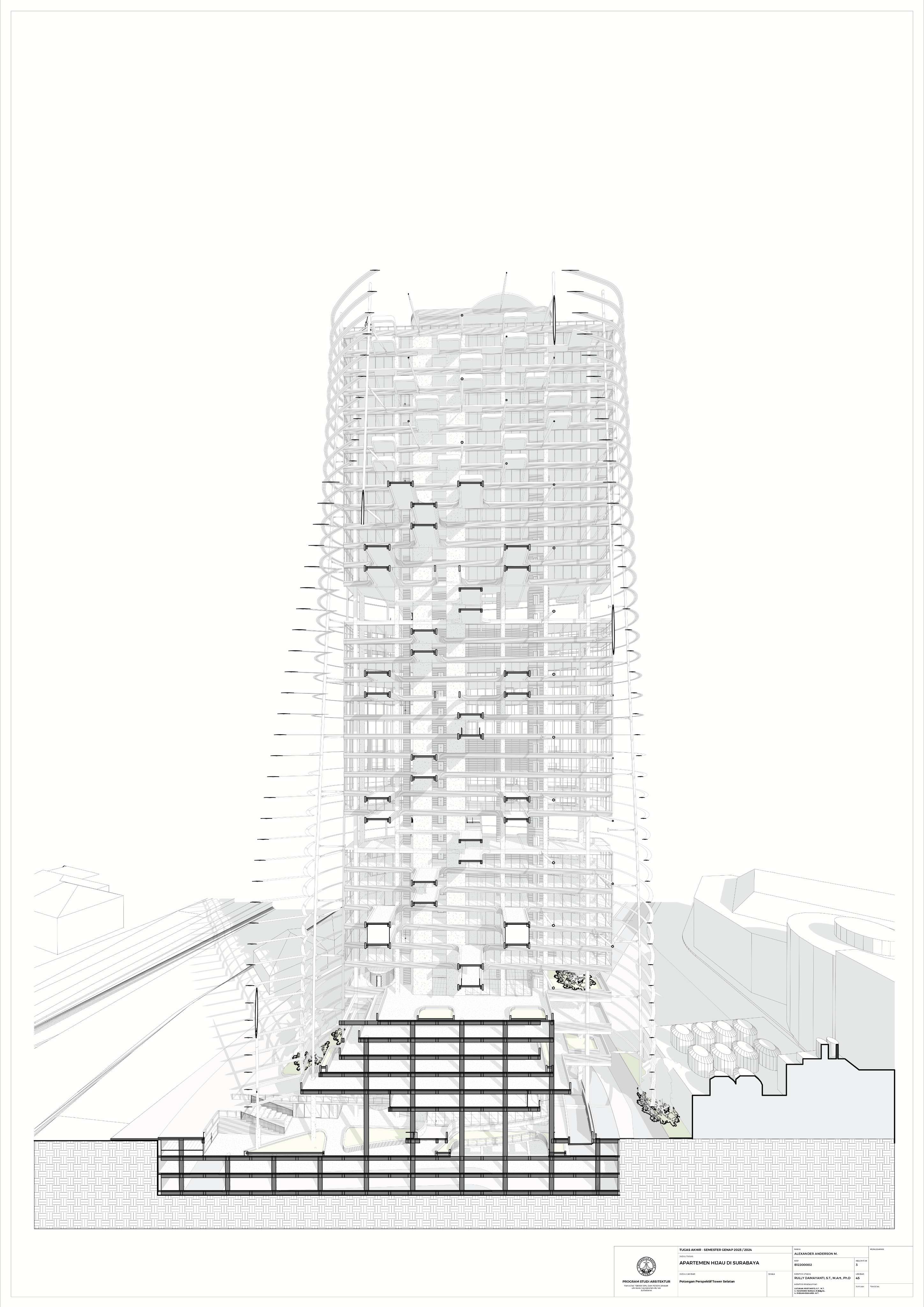 Kota Surabaya merupakan pusat perekonomian regional yang mengalami pertumbuhan populasi dan ekonomi setiap tahunnya. Meskipun telah bertumbuh meluas, Surabaya Pusat tetap merupakan salah satu pusat kegiatan terpenting di Kota Surabaya; hal ini ditunjukkan oleh kehadiran pengembangan-pengembangan baru di Surabaya Pusat. Namun, Surabaya Pusat sedang menghadapi tantangan tersembunyi, yakni kenaikan suhu area urban yang disebabkan oleh konstruksi serta minimnya ruang hijau terbuka. Fenomena yang diberi nama efek Urban Heat Island (UHI) ini semakin diperparah dengan pertumbuhan kota yang menimbulkan banyak pengembangan baru; menciptakan sebuah lingkaran umpan balik positif yang semakin memperparah efek UHI di Surabaya Pusat. Pengembangan-pengembangan baru sebaiknya mampu merespons pertumbuhan kota, namun dalam waktu yang sama, sekaligus merespons UHI. Proyek ini menawarkan sebuah pengembangan mixed-use berbasis hunian yang mengintegrasikan alam (cahaya, udara, vista, air, vegetasi) melalui pendekatan Nature-based Placemaking (NBP). Analisis pergerakan udara (CFD) mendasari orientasi dan bentuk bangunan untuk memperoleh penghawaan yang optimal. Dua buah tower hunian dengan segala fasilitas penunjangnya dihubungkan dengan podium komersil. Celah yang menerus secara diagonal pada setiap tower mempermudah laluan vista, cahaya dan udara; dan taman-taman gantung menyediakan ruang-ruang bagi penghijauan vertikal dan aktivitas luar ruangan di seluruh bangunan. Desain ini menciptakan sebuah kompleks baru yang merespons pertumbuhan kota sekaligus permasalahan iklim.