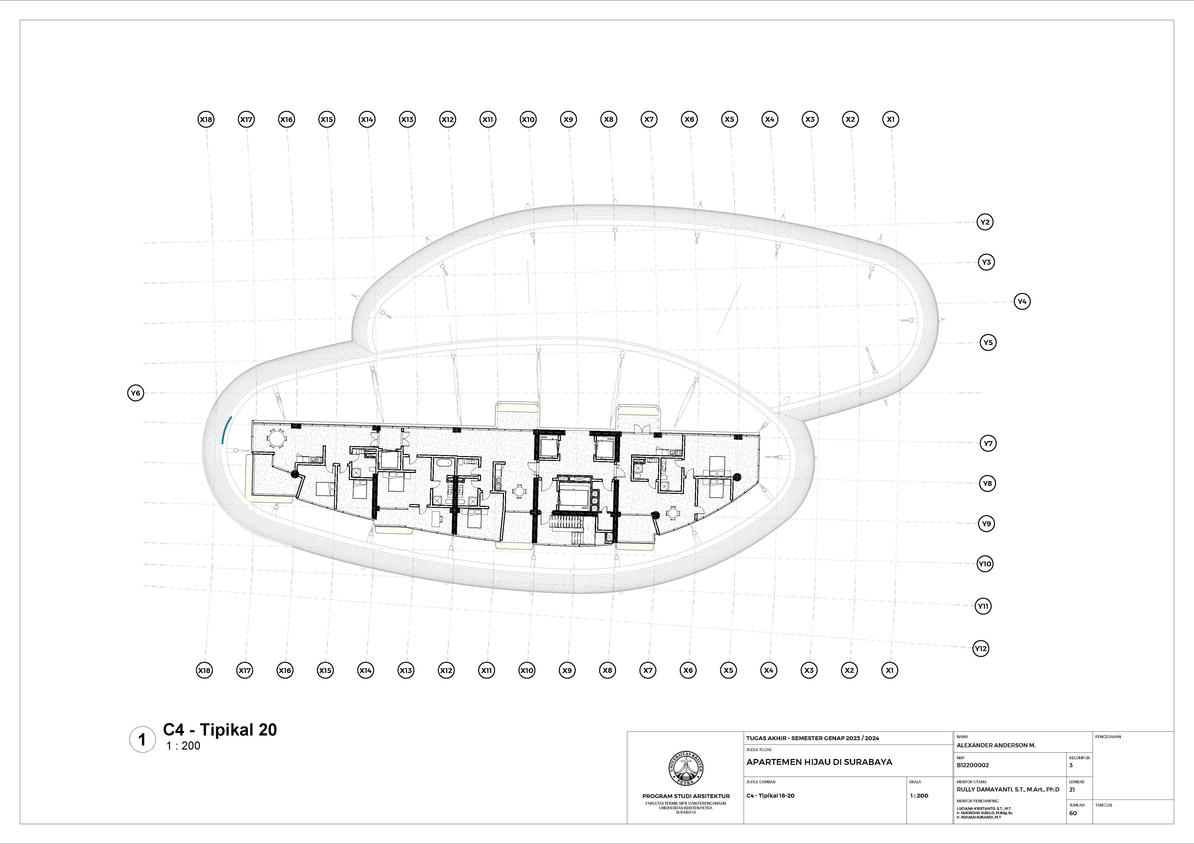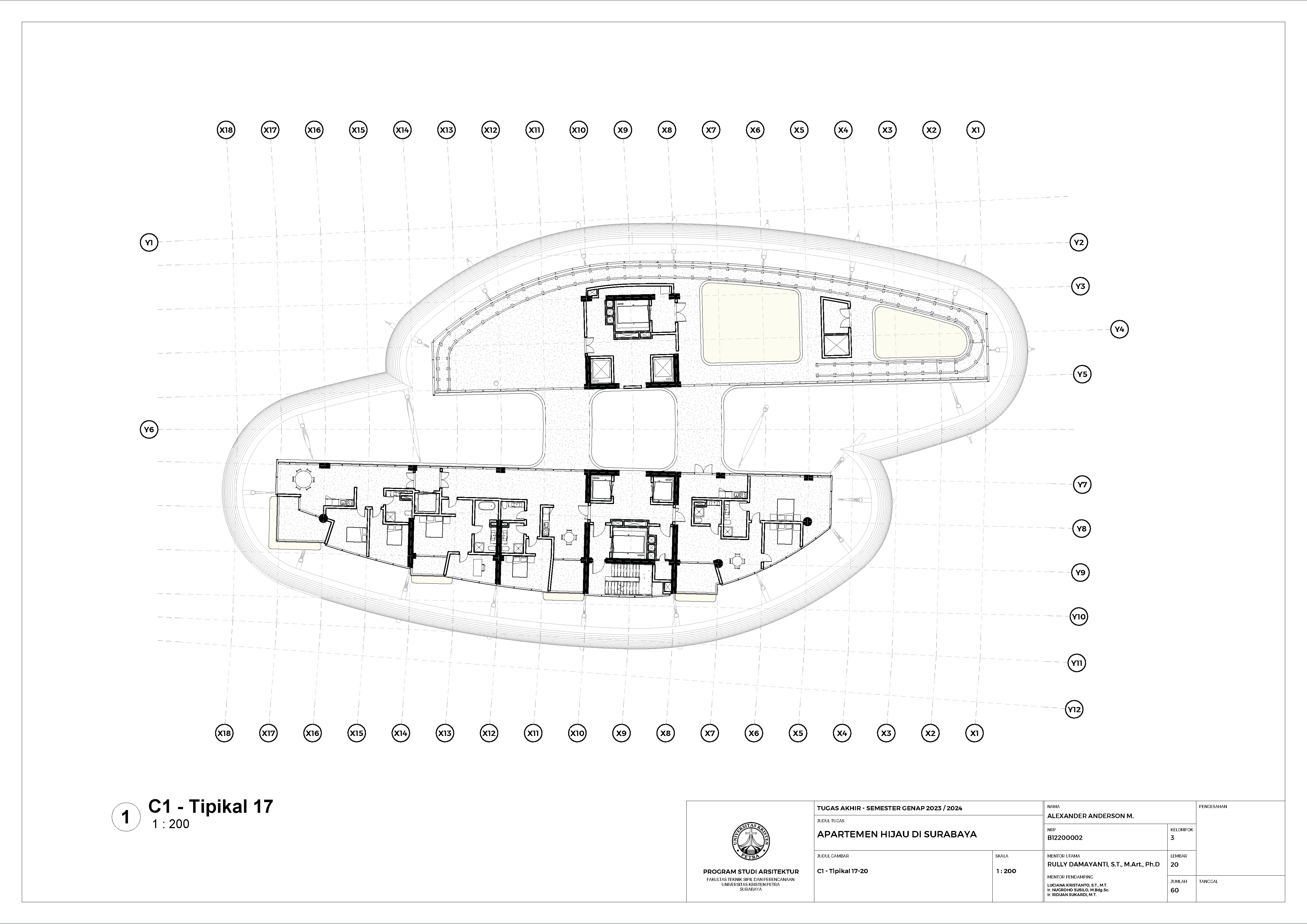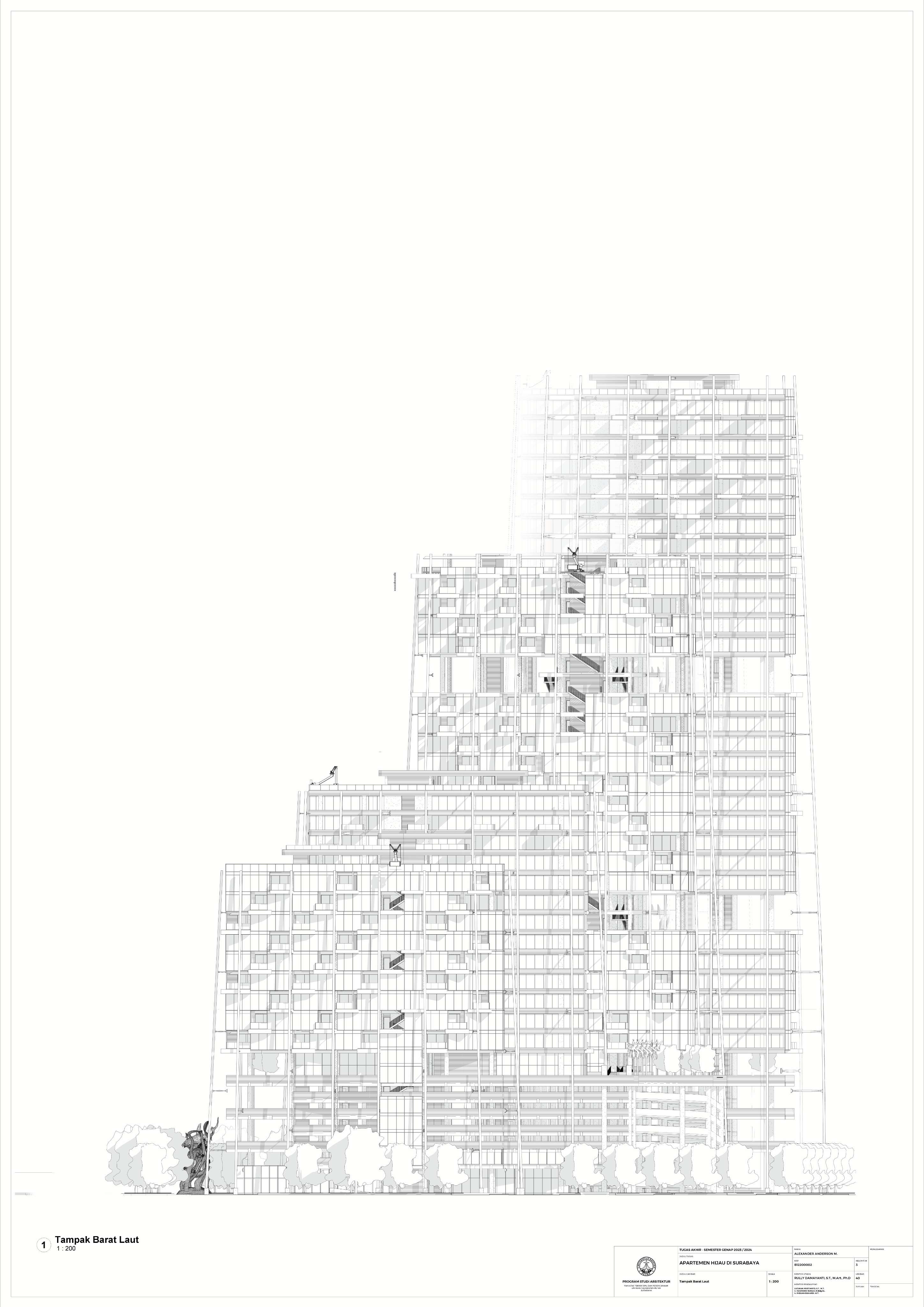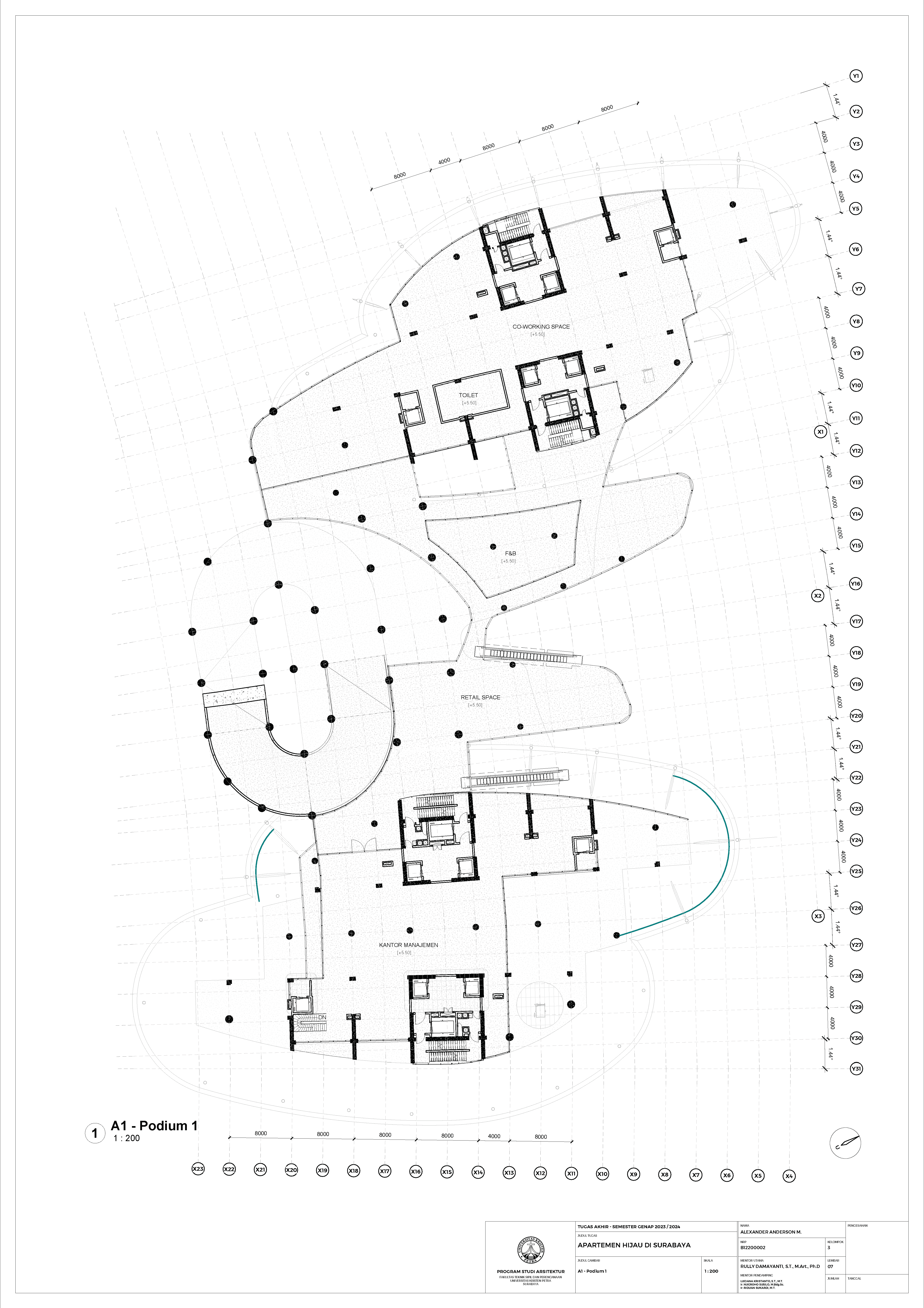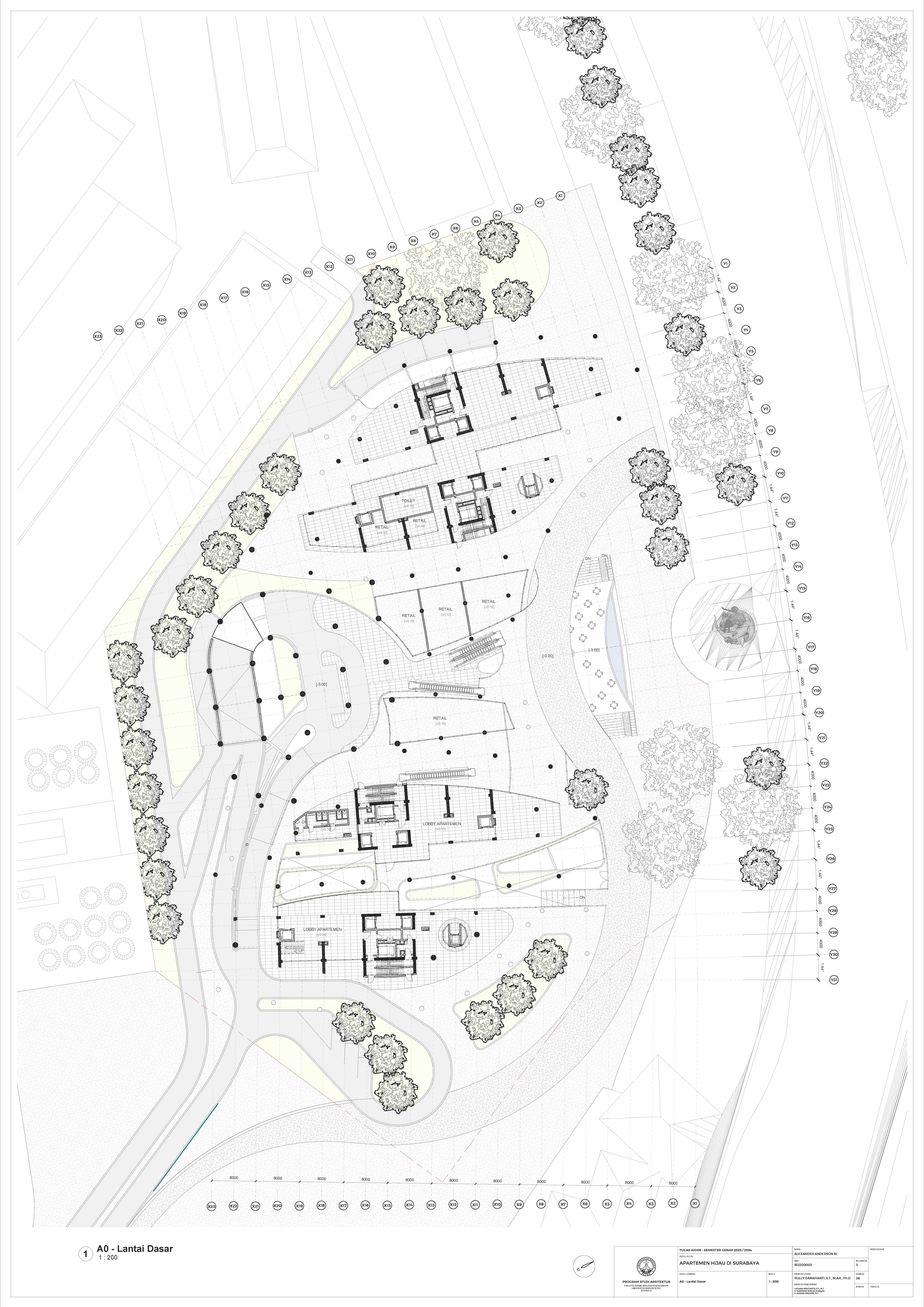 Kota Surabaya merupakan pusat perekonomian regional yang mengalami pertumbuhan populasi dan ekonomi setiap tahunnya. Meskipun telah bertumbuh meluas, Surabaya Pusat tetap merupakan salah satu pusat kegiatan terpenting di Kota Surabaya; hal ini ditunjukkan oleh kehadiran pengembangan-pengembangan baru di Surabaya Pusat. Namun, Surabaya Pusat sedang menghadapi tantangan tersembunyi, yakni kenaikan suhu area urban yang disebabkan oleh konstruksi serta minimnya ruang hijau terbuka. Fenomena yang diberi nama efek Urban Heat Island (UHI) ini semakin diperparah dengan pertumbuhan kota yang menimbulkan banyak pengembangan baru; menciptakan sebuah lingkaran umpan balik positif yang semakin memperparah efek UHI di Surabaya Pusat. Pengembangan-pengembangan baru sebaiknya mampu merespons pertumbuhan kota, namun dalam waktu yang sama, sekaligus merespons UHI. Proyek ini menawarkan sebuah pengembangan mixed-use berbasis hunian yang mengintegrasikan alam (cahaya, udara, vista, air, vegetasi) melalui pendekatan Nature-based Placemaking (NBP). Analisis pergerakan udara (CFD) mendasari orientasi dan bentuk bangunan untuk memperoleh penghawaan yang optimal. Dua buah tower hunian dengan segala fasilitas penunjangnya dihubungkan dengan podium komersil. Celah yang menerus secara diagonal pada setiap tower mempermudah laluan vista, cahaya dan udara; dan taman-taman gantung menyediakan ruang-ruang bagi penghijauan vertikal dan aktivitas luar ruangan di seluruh bangunan. Desain ini menciptakan sebuah kompleks baru yang merespons pertumbuhan kota sekaligus permasalahan iklim.