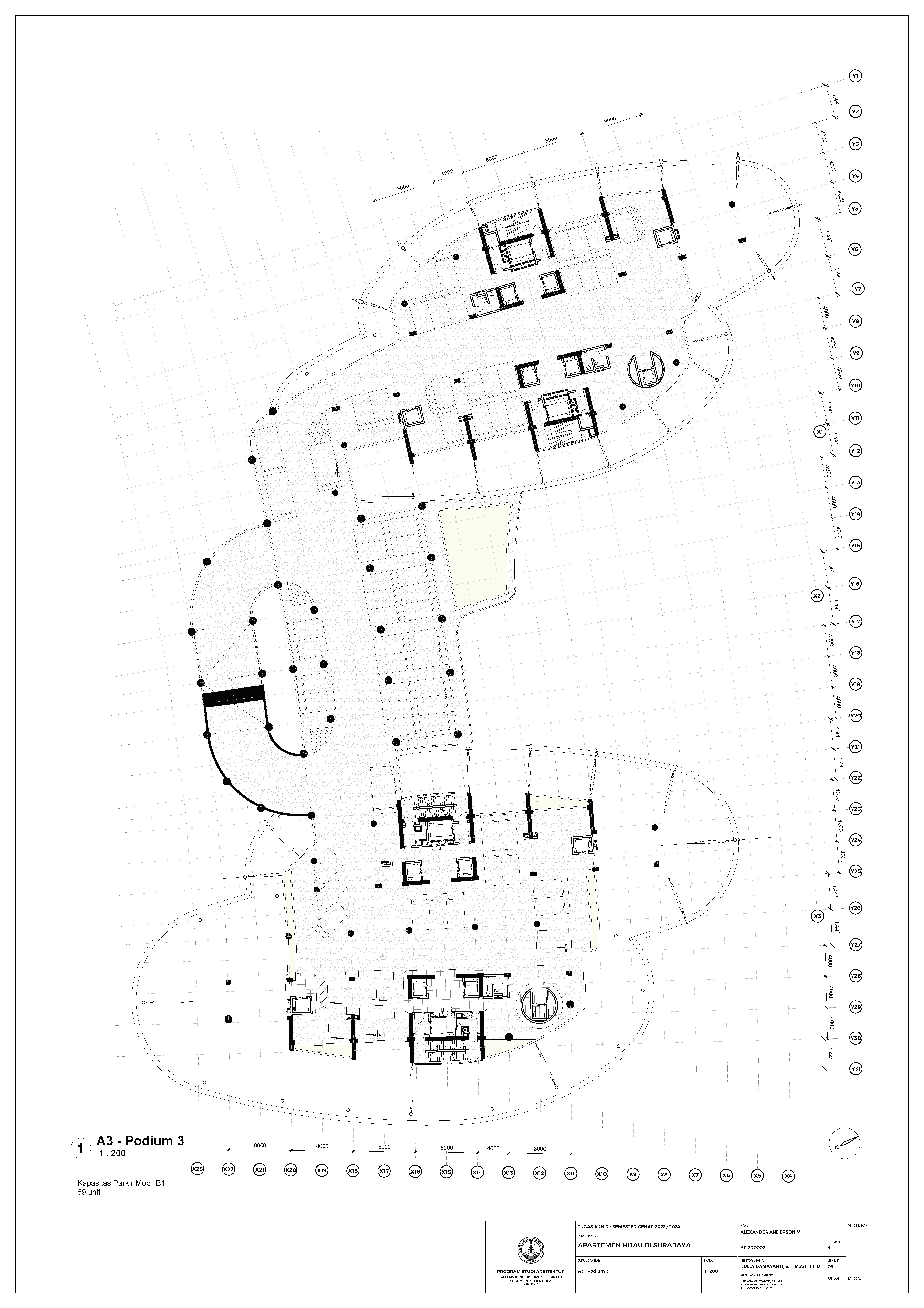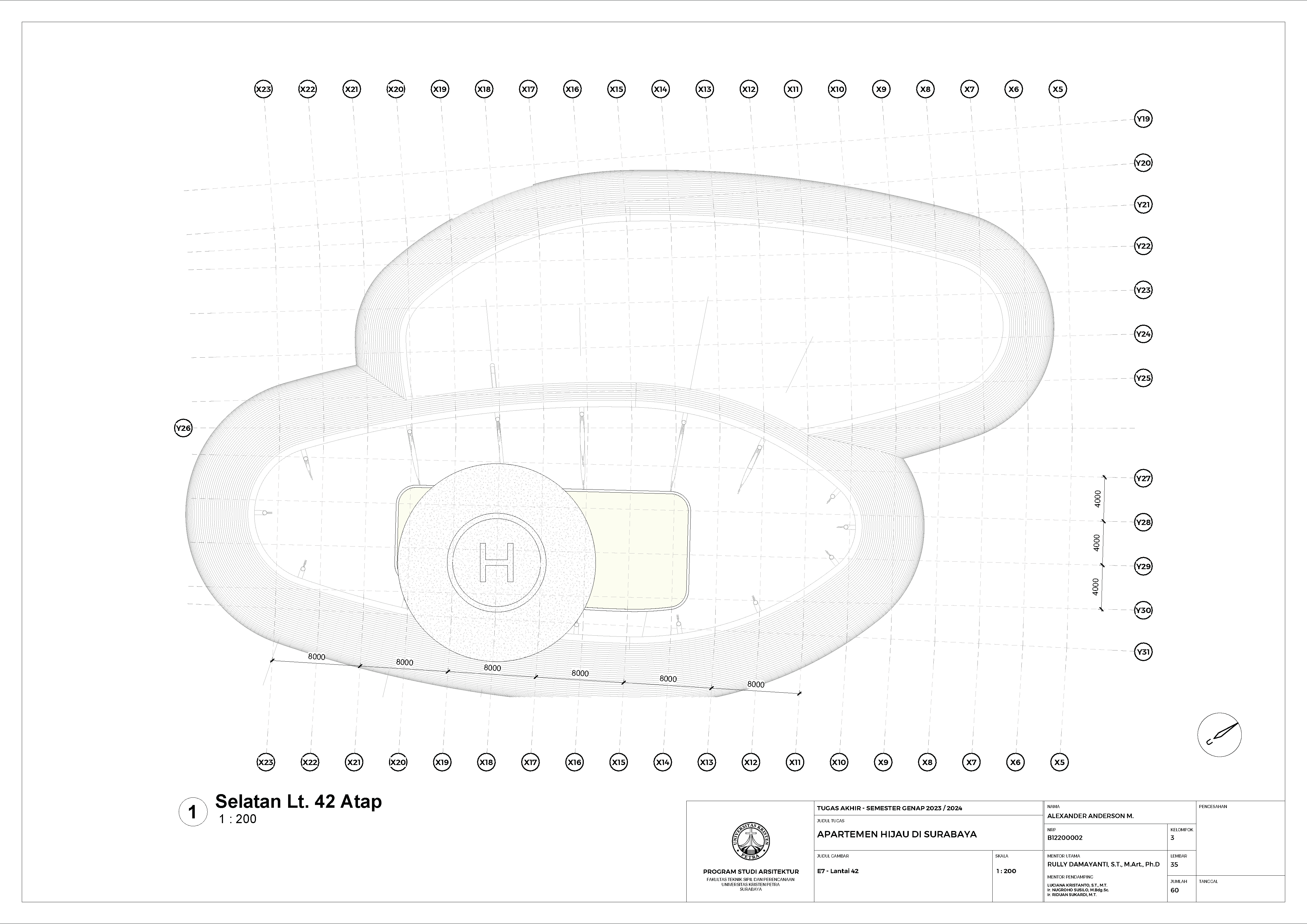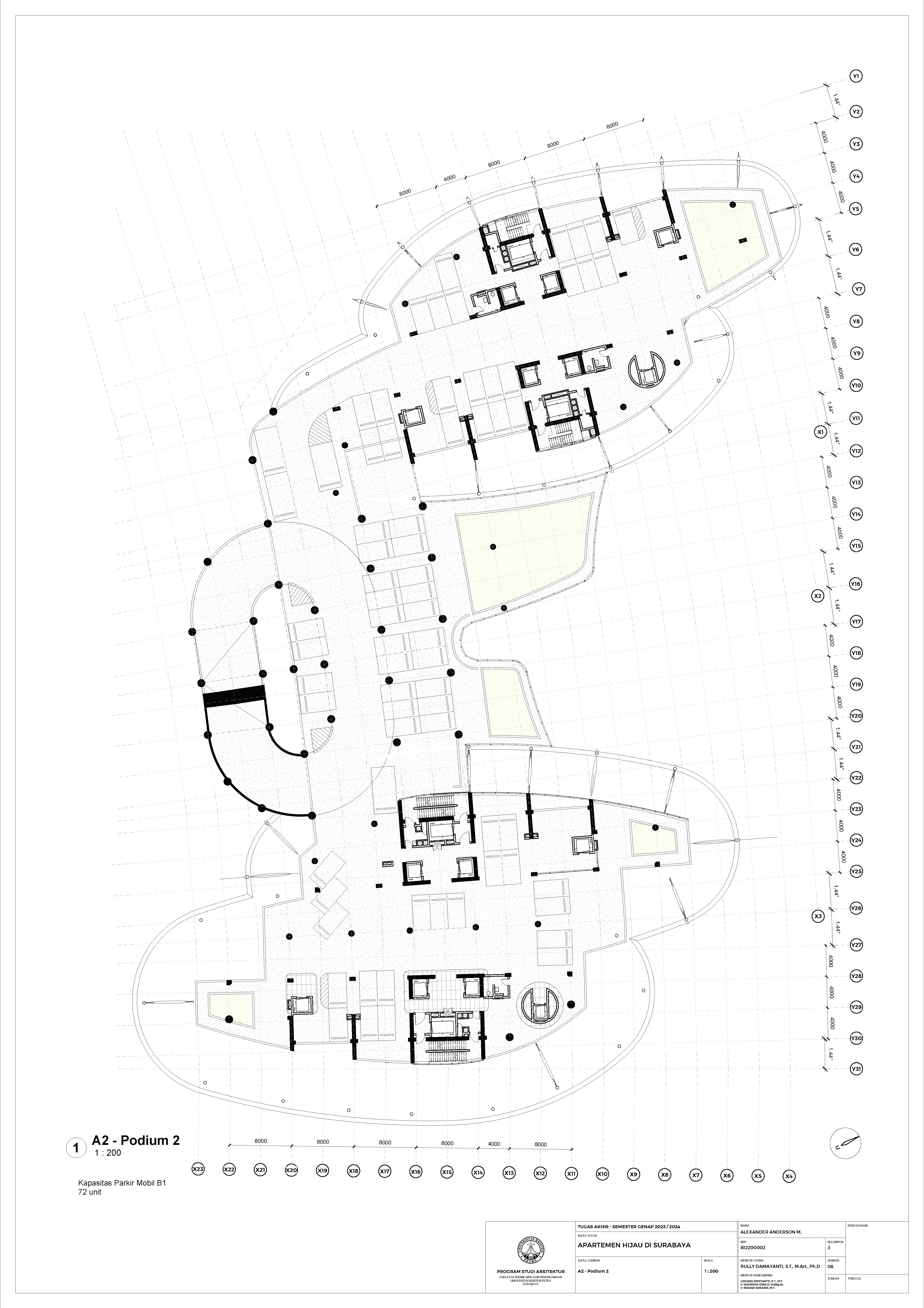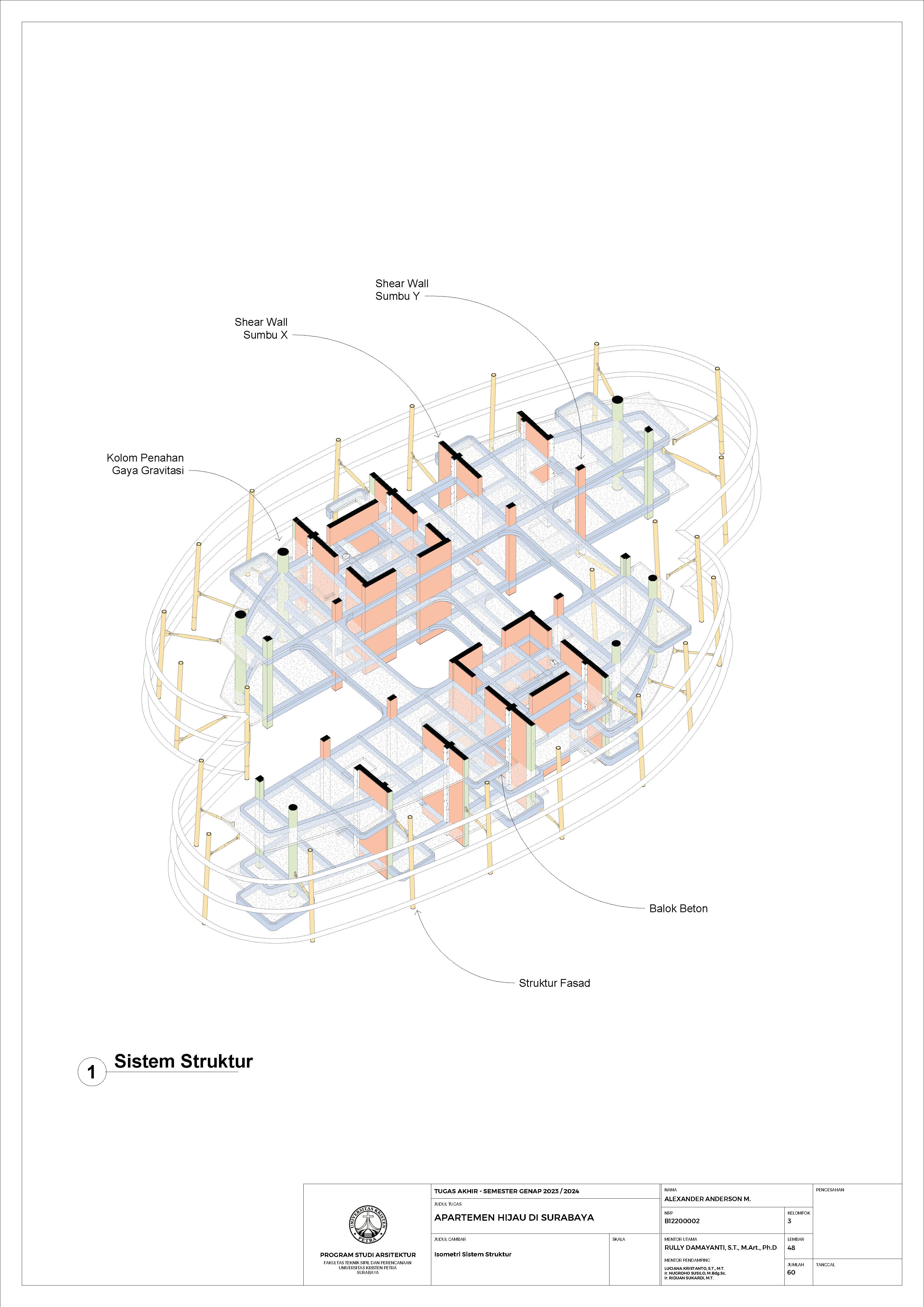 Kota Surabaya merupakan pusat perekonomian regional yang mengalami pertumbuhan populasi dan ekonomi setiap tahunnya. Meskipun telah bertumbuh meluas, Surabaya Pusat tetap merupakan salah satu pusat kegiatan terpenting di Kota Surabaya; hal ini ditunjukkan oleh kehadiran pengembangan-pengembangan baru di Surabaya Pusat. Namun, Surabaya Pusat sedang menghadapi tantangan tersembunyi, yakni kenaikan suhu area urban yang disebabkan oleh konstruksi serta minimnya ruang hijau terbuka. Fenomena yang diberi nama efek Urban Heat Island (UHI) ini semakin diperparah dengan pertumbuhan kota yang menimbulkan banyak pengembangan baru; menciptakan sebuah lingkaran umpan balik positif yang semakin memperparah efek UHI di Surabaya Pusat. Pengembangan-pengembangan baru sebaiknya mampu merespons pertumbuhan kota, namun dalam waktu yang sama, sekaligus merespons UHI. Proyek ini menawarkan sebuah pengembangan mixed-use berbasis hunian yang mengintegrasikan alam (cahaya, udara, vista, air, vegetasi) melalui pendekatan Nature-based Placemaking (NBP). Analisis pergerakan udara (CFD) mendasari orientasi dan bentuk bangunan untuk memperoleh penghawaan yang optimal. Dua buah tower hunian dengan segala fasilitas penunjangnya dihubungkan dengan podium komersil. Celah yang menerus secara diagonal pada setiap tower mempermudah laluan vista, cahaya dan udara; dan taman-taman gantung menyediakan ruang-ruang bagi penghijauan vertikal dan aktivitas luar ruangan di seluruh bangunan. Desain ini menciptakan sebuah kompleks baru yang merespons pertumbuhan kota sekaligus permasalahan iklim.