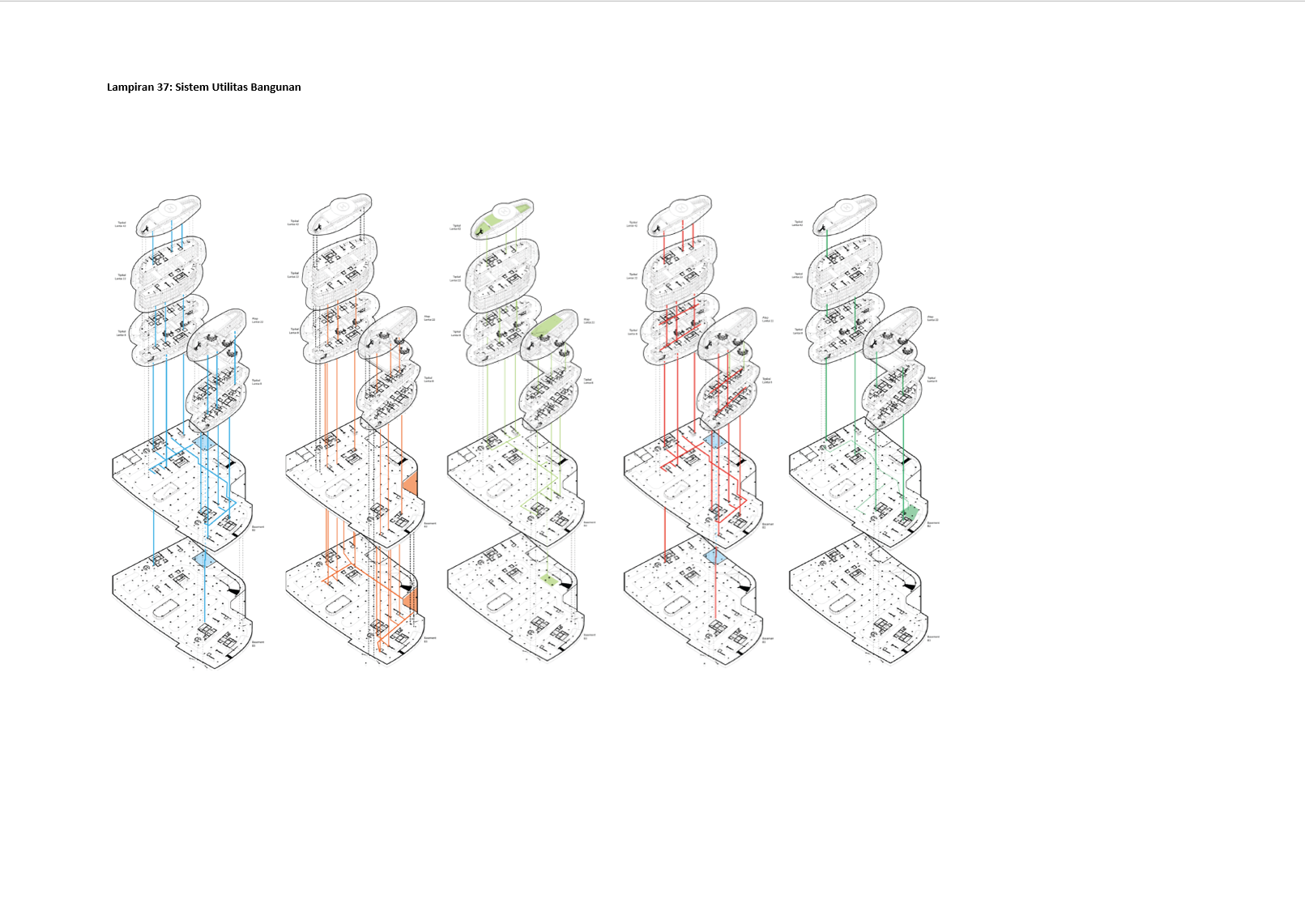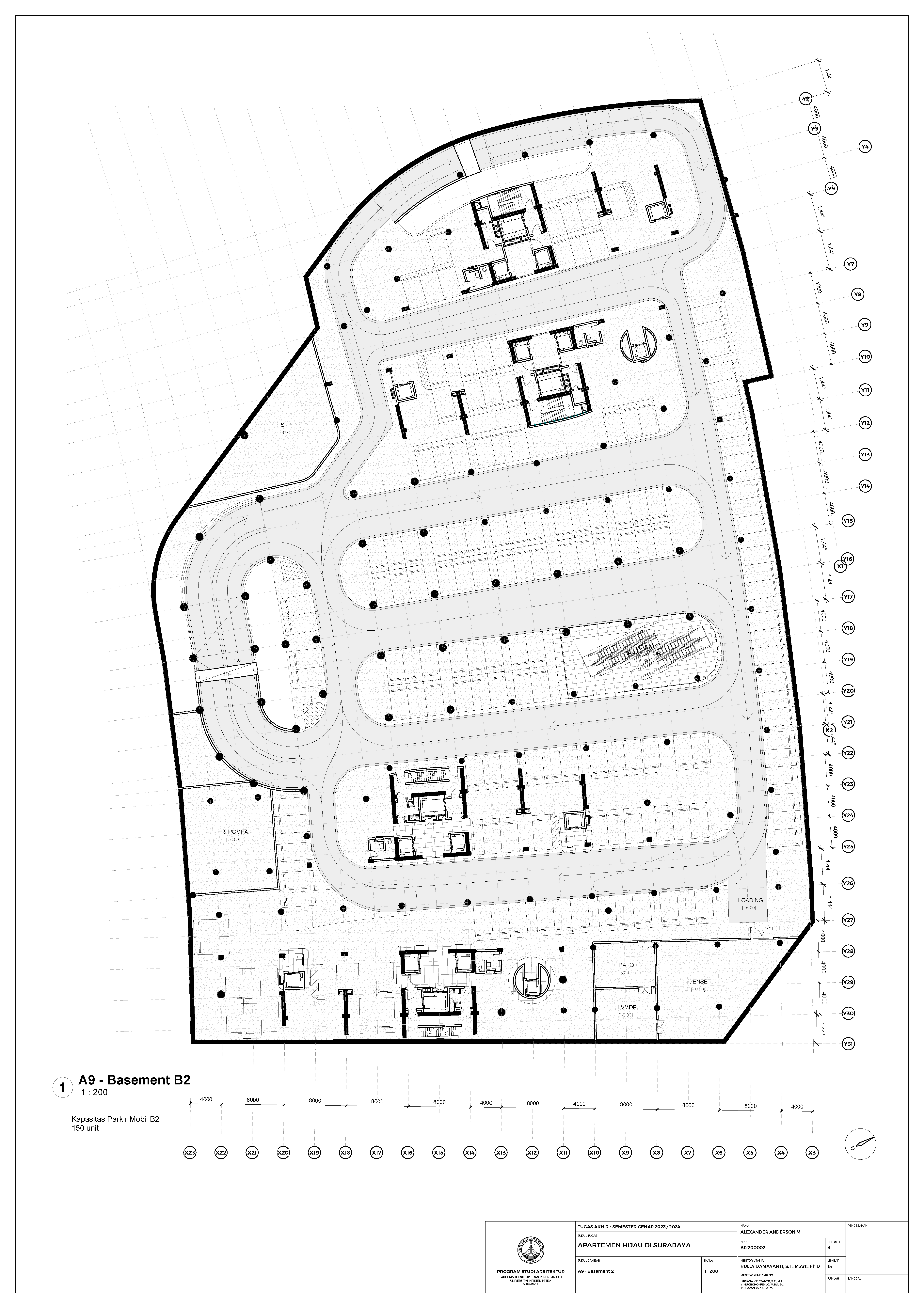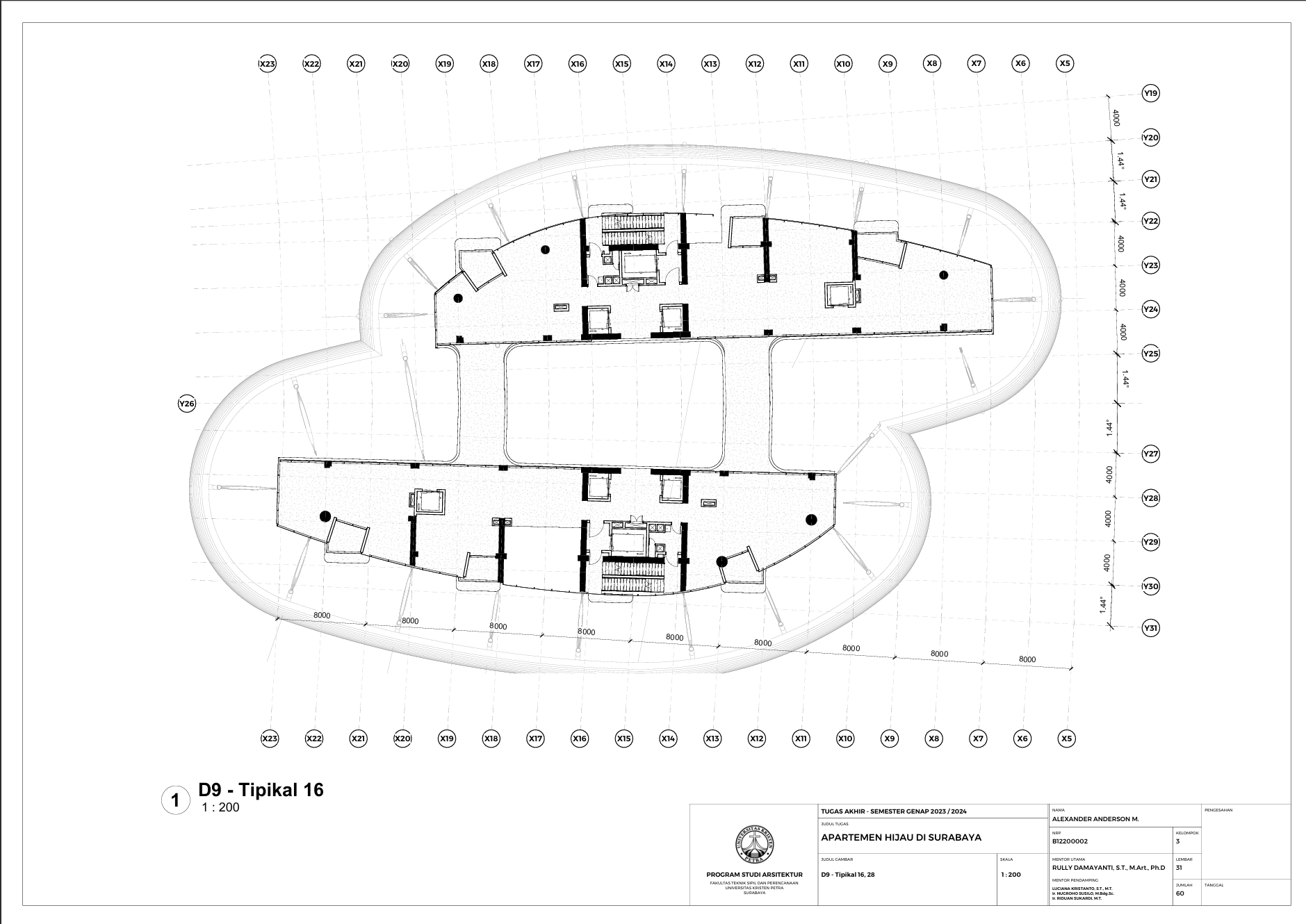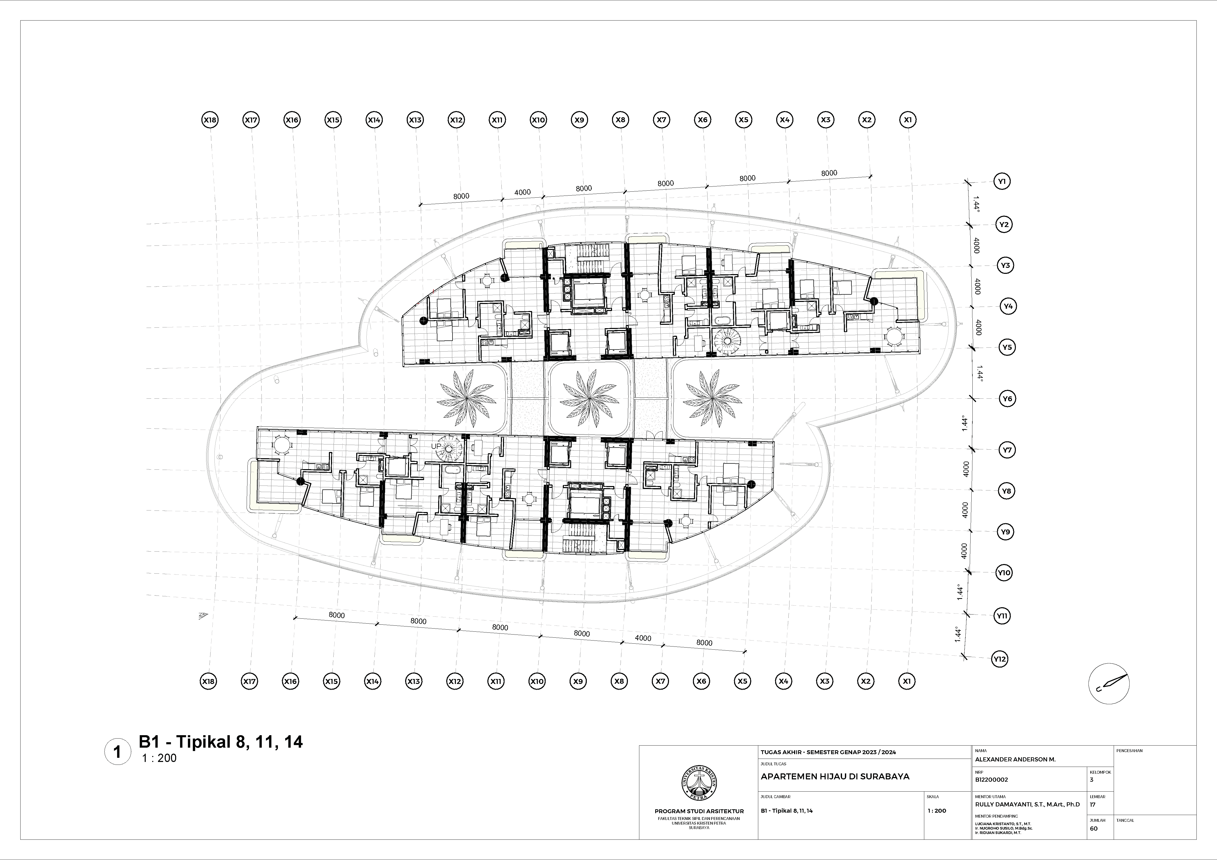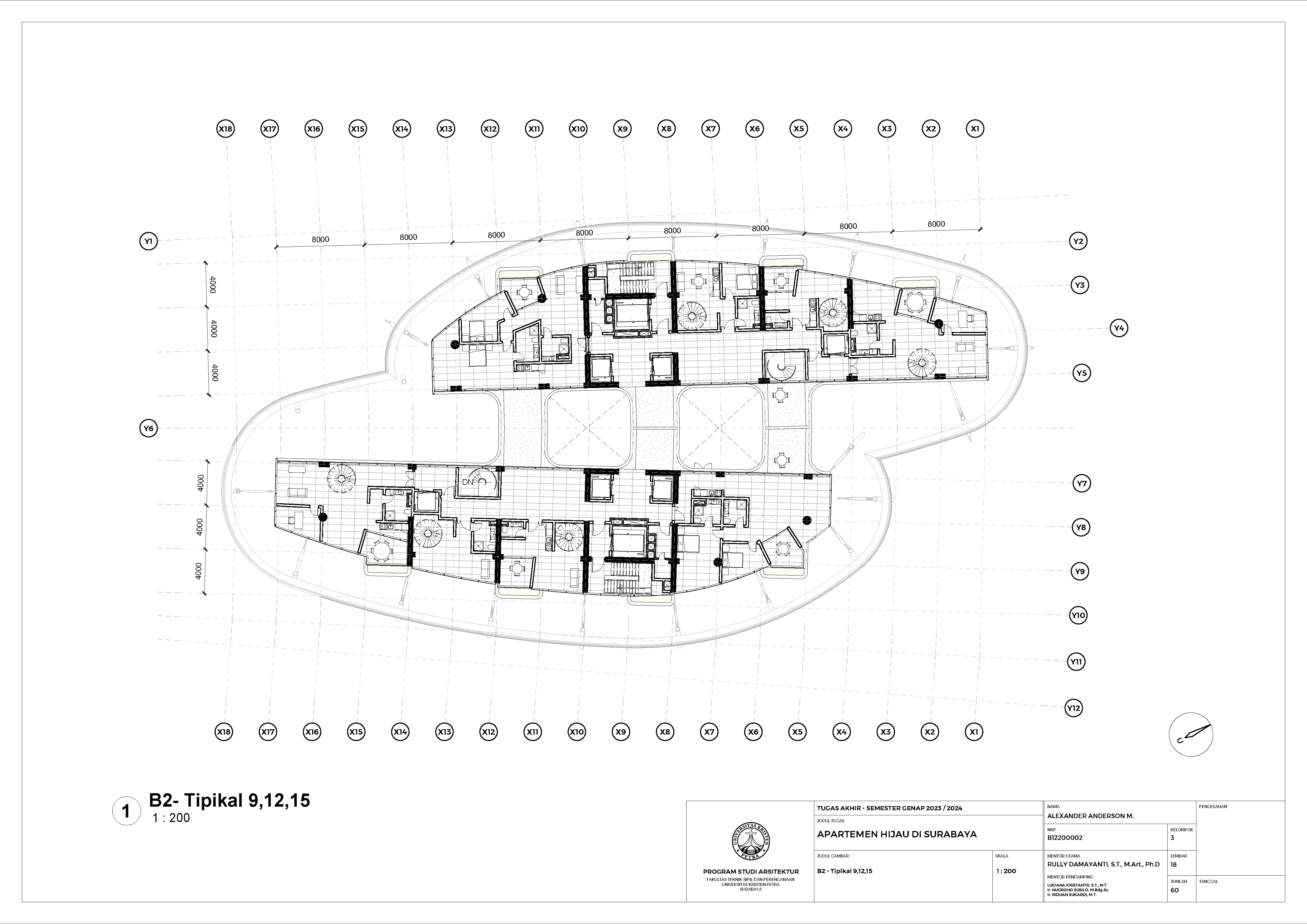 Kota Surabaya merupakan pusat perekonomian regional yang mengalami pertumbuhan populasi dan ekonomi setiap tahunnya. Meskipun telah bertumbuh meluas, Surabaya Pusat tetap merupakan salah satu pusat kegiatan terpenting di Kota Surabaya; hal ini ditunjukkan oleh kehadiran pengembangan-pengembangan baru di Surabaya Pusat. Namun, Surabaya Pusat sedang menghadapi tantangan tersembunyi, yakni kenaikan suhu area urban yang disebabkan oleh konstruksi serta minimnya ruang hijau terbuka. Fenomena yang diberi nama efek Urban Heat Island (UHI) ini semakin diperparah dengan pertumbuhan kota yang menimbulkan banyak pengembangan baru; menciptakan sebuah lingkaran umpan balik positif yang semakin memperparah efek UHI di Surabaya Pusat. Pengembangan-pengembangan baru sebaiknya mampu merespons pertumbuhan kota, namun dalam waktu yang sama, sekaligus merespons UHI. Proyek ini menawarkan sebuah pengembangan mixed-use berbasis hunian yang mengintegrasikan alam (cahaya, udara, vista, air, vegetasi) melalui pendekatan Nature-based Placemaking (NBP). Analisis pergerakan udara (CFD) mendasari orientasi dan bentuk bangunan untuk memperoleh penghawaan yang optimal. Dua buah tower hunian dengan segala fasilitas penunjangnya dihubungkan dengan podium komersil. Celah yang menerus secara diagonal pada setiap tower mempermudah laluan vista, cahaya dan udara; dan taman-taman gantung menyediakan ruang-ruang bagi penghijauan vertikal dan aktivitas luar ruangan di seluruh bangunan. Desain ini menciptakan sebuah kompleks baru yang merespons pertumbuhan kota sekaligus permasalahan iklim.